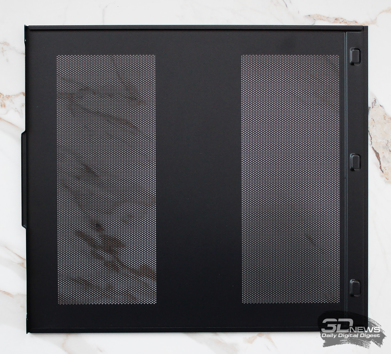 Стеклянная панель над рабочей зоной ничем особенным не выделяется, а вот противоположная ей панель из стали имеет две большие вентиляционные зоны, которые по какой-то причине не оснащены фильтрами от пыли.