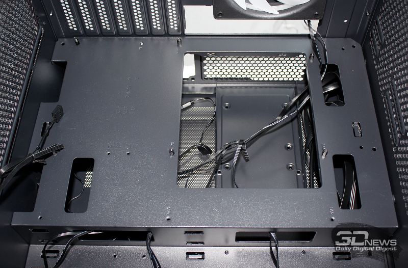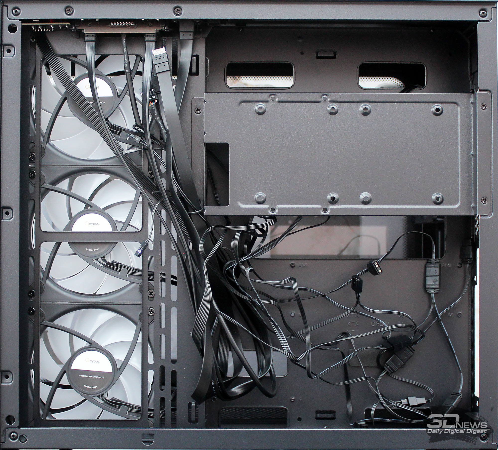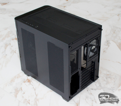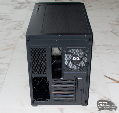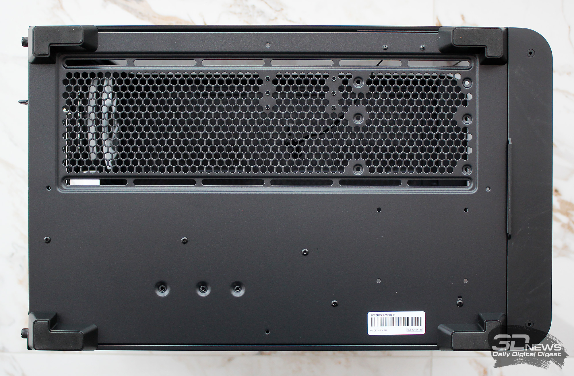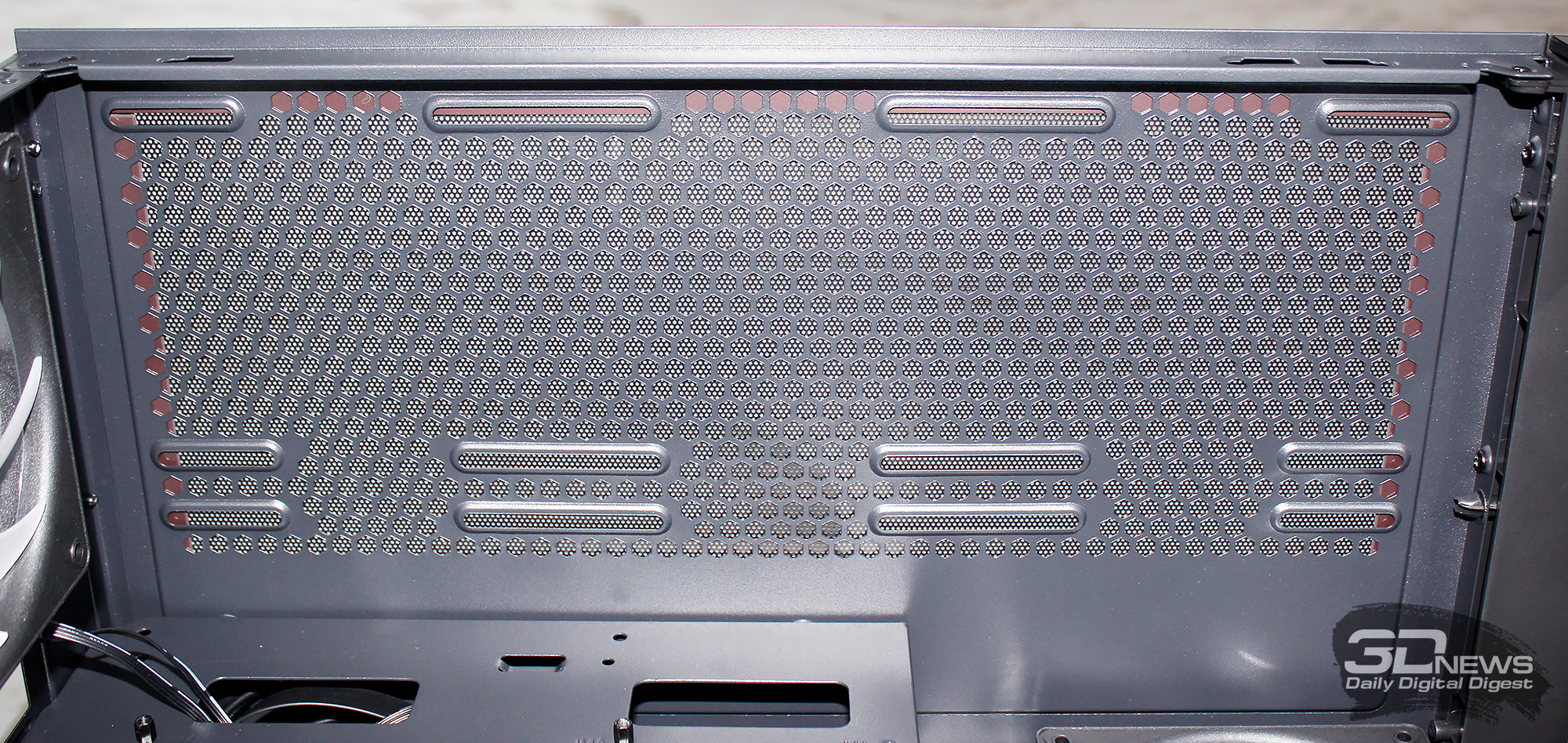 Верхняя панель корпуса подготовлена для установки трёх 120-мм вентиляторов или двух 140-мм вентиляторов, а нижняя уже – сюда войдут только три 120-мм вентилятора.