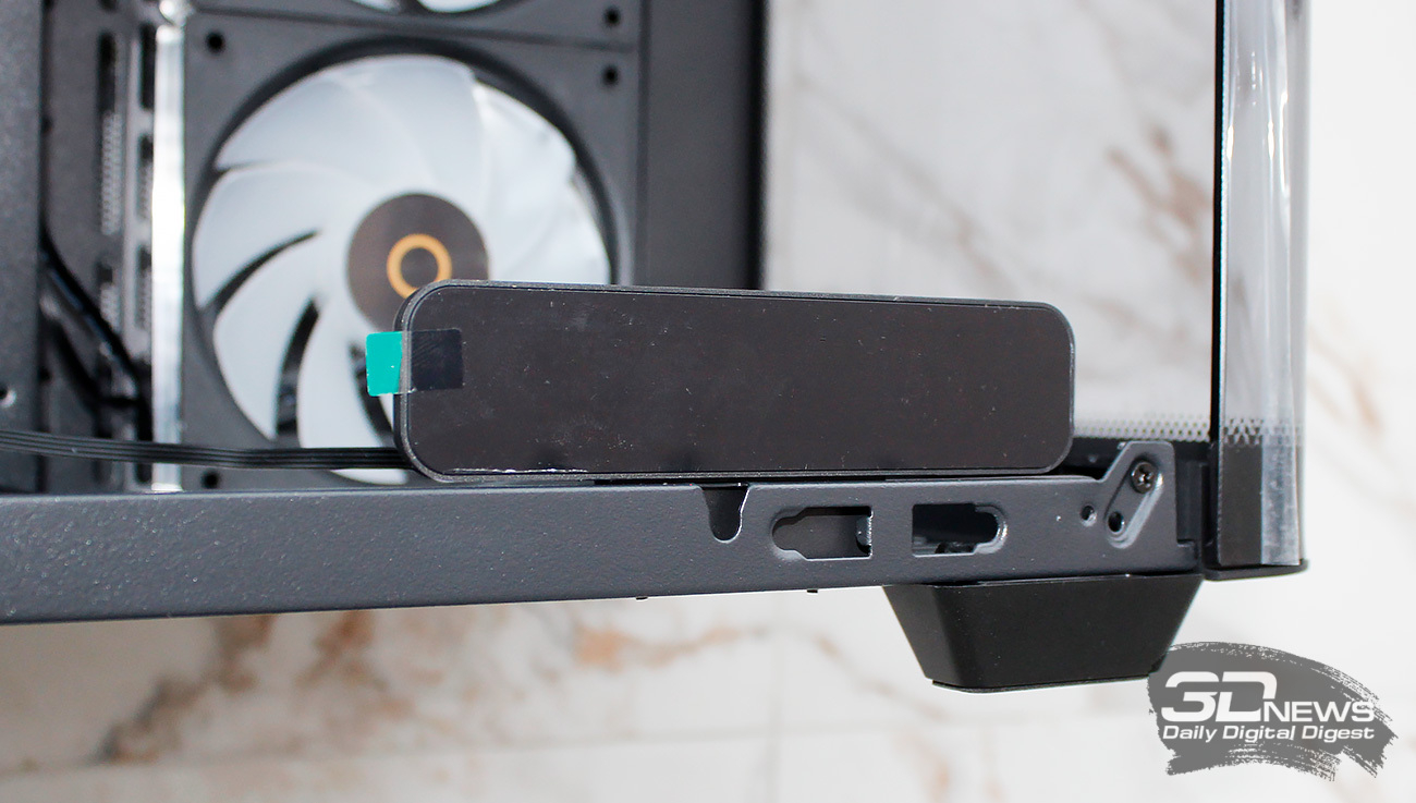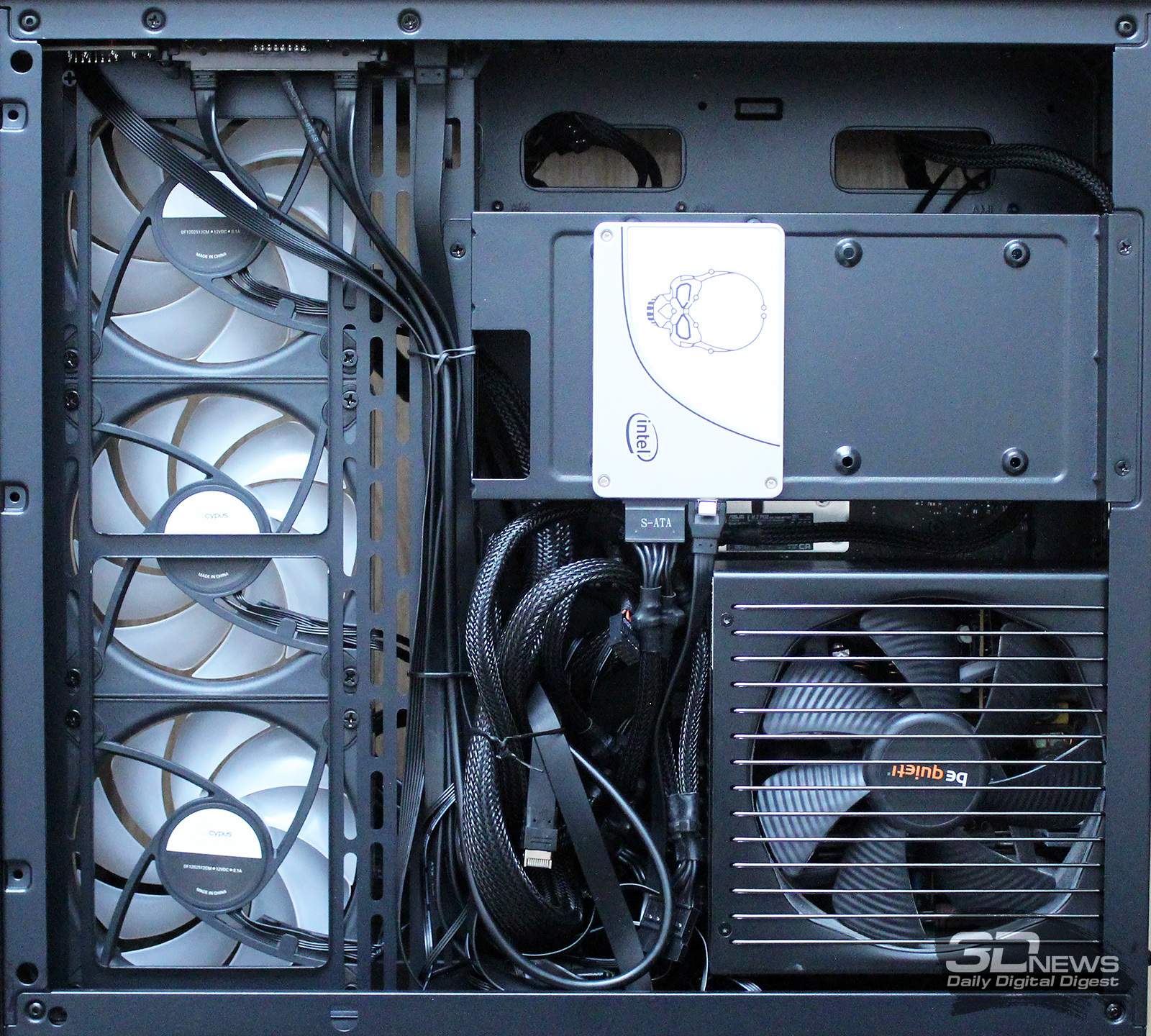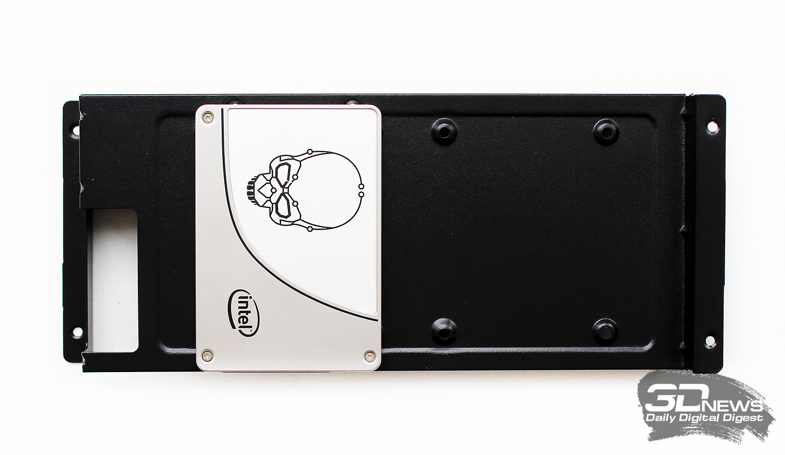 Однако в этом случае будет заблокировано посадочное место под один 2,5/3,5-дюймовый накопитель. Ещё два SSD можно привернуть к съёмной панели за поддоном материнской платы…