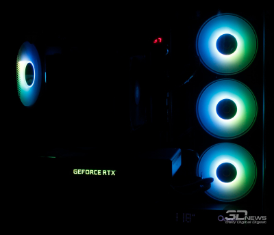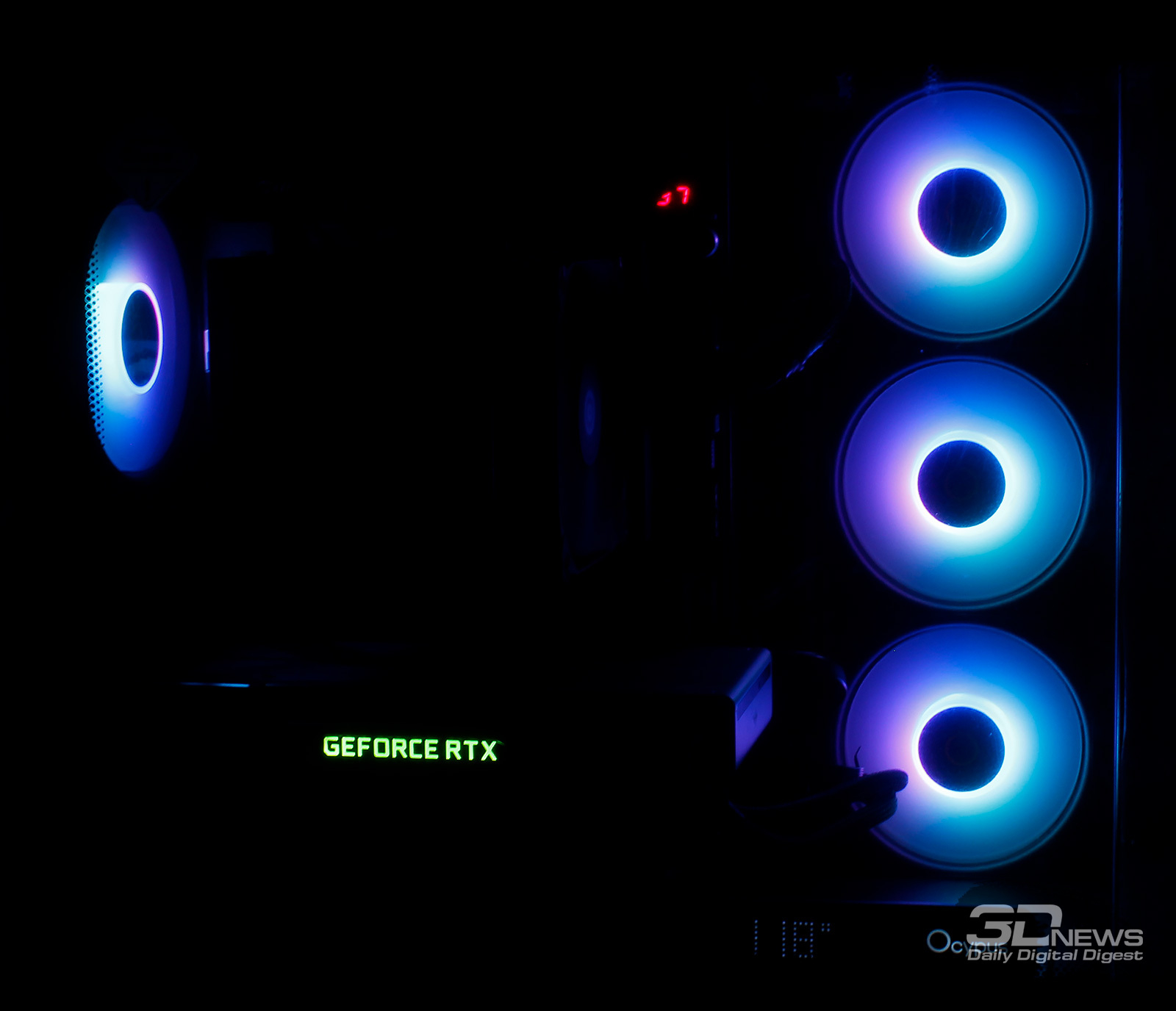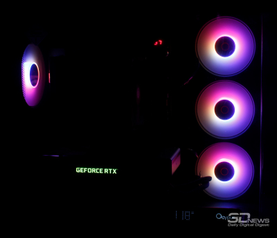 Штатные вентиляторы корпуса оснащены красивой адресуемой подсветкой, особенность которой в том, что она очень яркая и на её фоне небольшой экранчик в нижней части едва виден.
