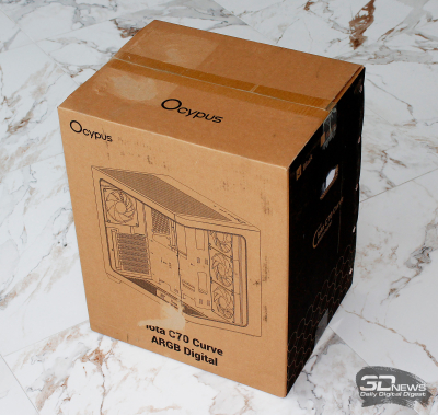 Картонная упаковка, в которой поставляется Ocypus Iota C70 Curve ARGB, отличается необычной формой, скорее напоминающей мощный столб, нежели коробку компьютерного корпуса. На лицевой стороне приведено схематичное изображение устройства и название модели, а на торцах есть ручки для переноски.
