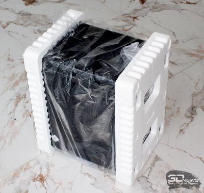 Внутри картона корпус защищён двумя пенопластовыми вставками и полиэтиленовым пакетом.
