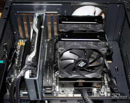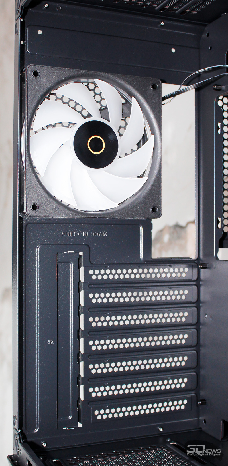 На противоположной ему стороне размещён один 120-мм вентилятор на выдув с возможностью регулировки по высоте на 15 мм.