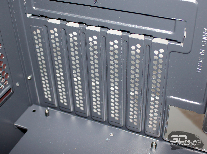 Под ним находятся семь одноразовых заглушек PCIe-слотов с перфорацией, фиксируемых единой металлической пластиной.