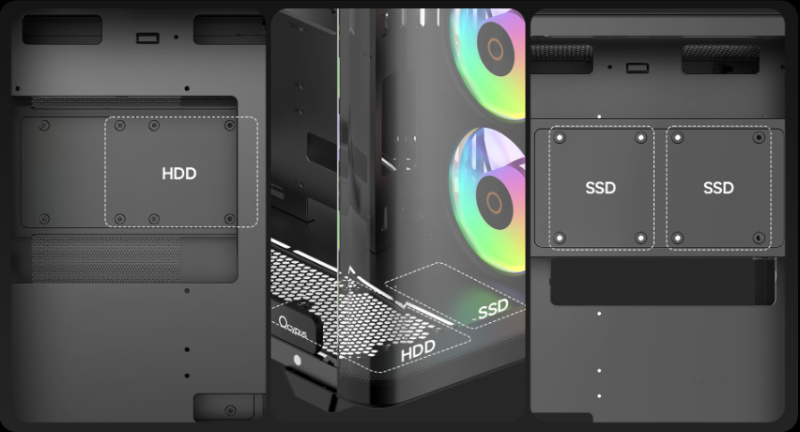 …либо установить на неё один 3,5-дюймовый накопитель. Схематично посадочные места под накопители в Ocypus Iota C70 Curve ARGB изображены ниже.