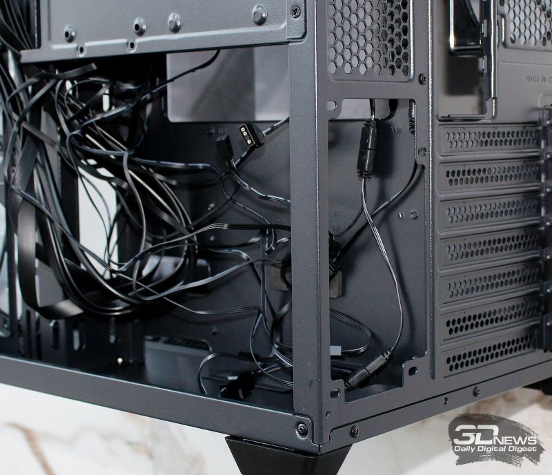 С закреплением блока питания в нижней части корпуса также никаких проблем не возникло, но кабели к нему всё же удобнее подключать до установки в корпус.