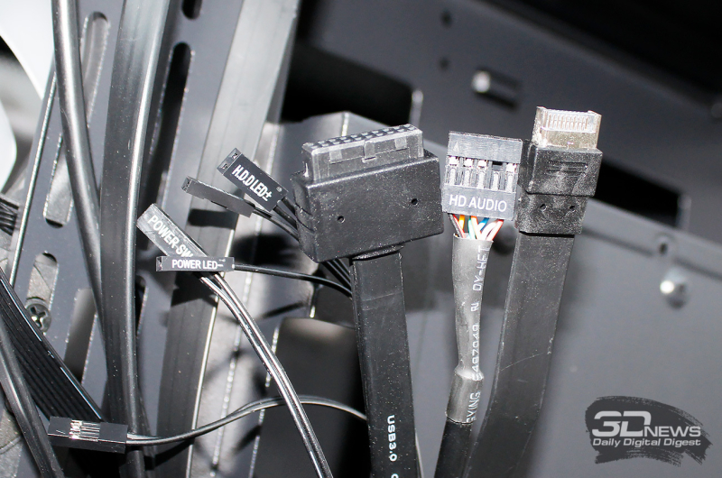 В их числе коннекторы для материнской платы, аудиокабель, два кабеля USB, а от отдельного контроллера отходят кабели вентиляторов и ARGB-подсветки.