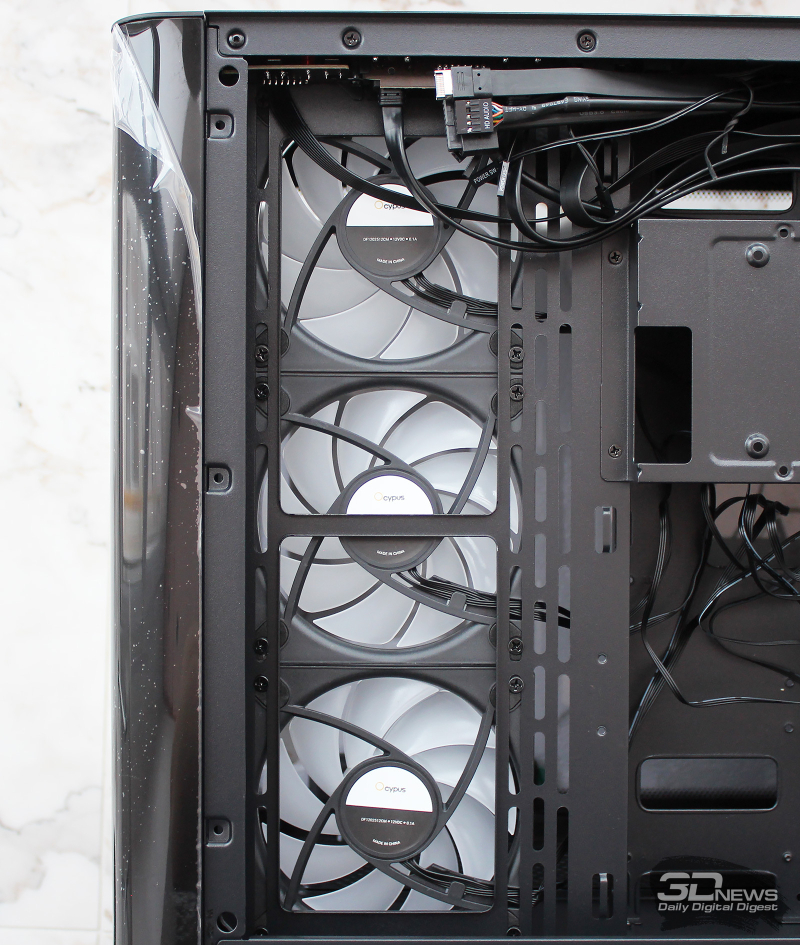 Ocypus Iota C70 Curve ARGB оснащается четырьмя 120-мм вентиляторами. Три из них установлены на боковой стенке и ориентированы на вдув в корпус (реверсивные крыльчатки).