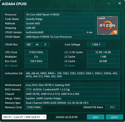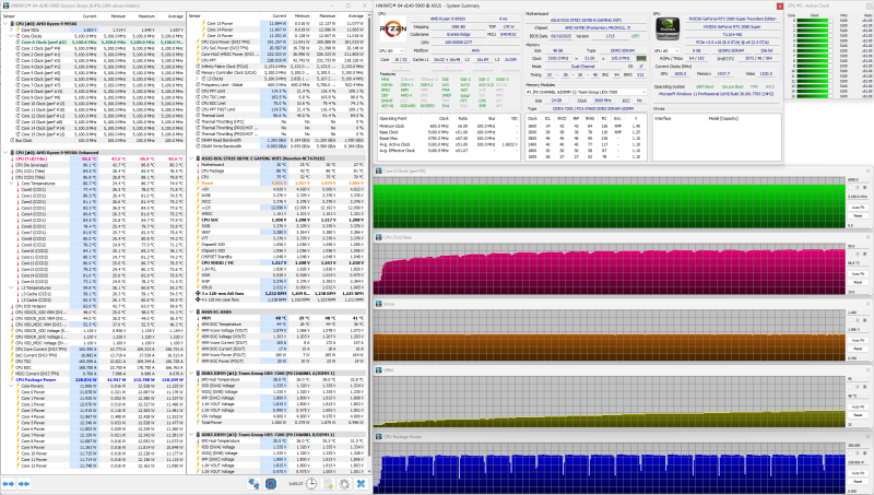 По данным HWiNFO64, уровень тепловыделения процессора с такими настройками достигал 228 ватт. Эффективная частота оперативной памяти была зафиксирована на отметке 6,2 ГГц при напряжениях 1,330/1,320/1,210 В (VDD/VDDQ/VSOC), а её основные тайминги фиксировались в значениях 32-38-38-48 CR1 с дополнительной подстройкой вторичных и третичных таймингов. Частота коммуникационной шины Infinity Fabric (FCLK) была установлена на отметке 2,133 ГГц.