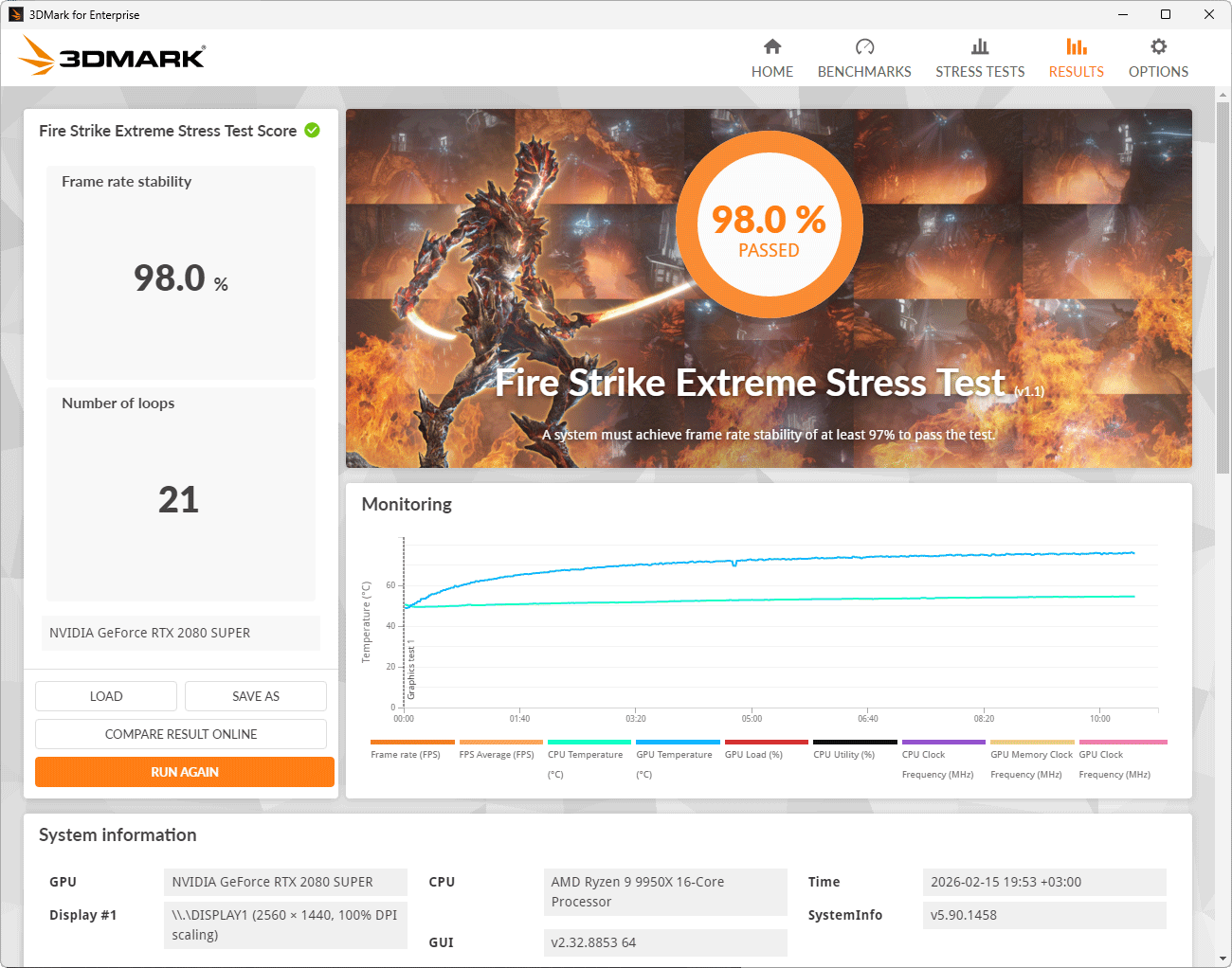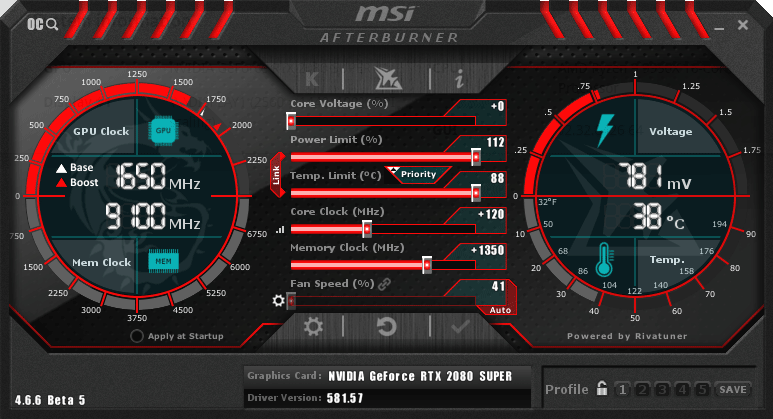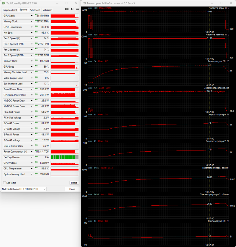 Для повышения тепловыделения видеокарта NVIDIA GeForce RTX 2080 SUPER FE была разогнана по графическому процессору на 120 МГц и по видеопамяти на 1350 МГц.