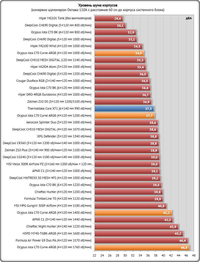 Ocypus Iota C70 Curve ARGB тестировался с четырьмя штатными вентиляторами в четырёх скоростных режимах их работы: на максимальных 1760 об/мин, средних 1400 и 1200 об/мин, а также тихих 1000 об/мин (погрешность ±10 об/мин). Как всегда для сравнения мы приводим результаты эталонного корпуса Thermaltake Core X71, дооснащённого шестью 140-мм вентиляторами be quiet! Silent Wings 3 (BL067) с PWM-регулировкой в диапазоне от 810 до 1040 об/мин.