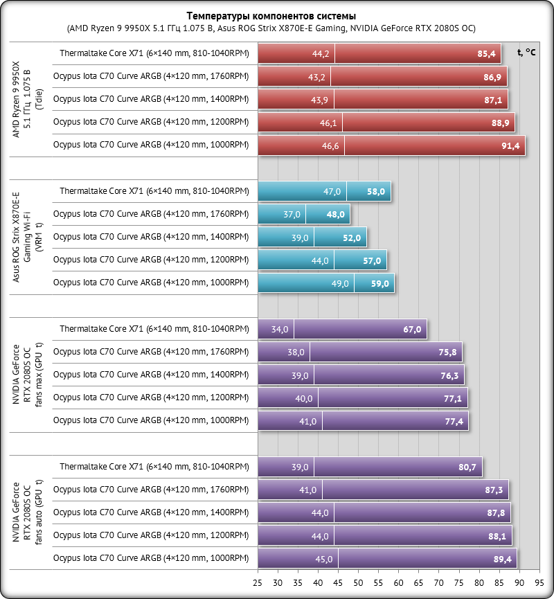 По температуре центрального процессора Ocypus Iota C70 Curve ARGB даже на максимальных и шумных 1760 об/мин уступает эталонному корпусу 1,5 градуса Цельсия. На 1400 об/мин разницы в температурах CPU практически нет, а на 1200 об/мин они повышаются почти на два градуса Цельсия. В комфортном с точки зрения уровня шума режиме корпуса — на скорости четвёрки штатных вентиляторов 1000 об/мин — температура процессора повышается до 91,4 градуса Цельсия, что, конечно же, многовато. С охлаждением VRM цепей материнской платы корпус справляется лучше, чем с охлаждением процессора, но на минимальных 1000 об/мин немного уступает Thermaltake Core X71.