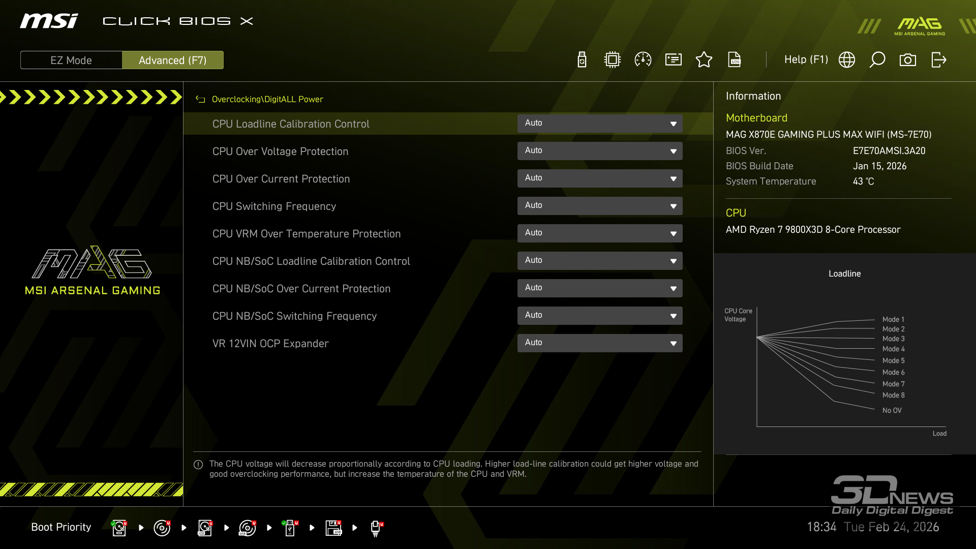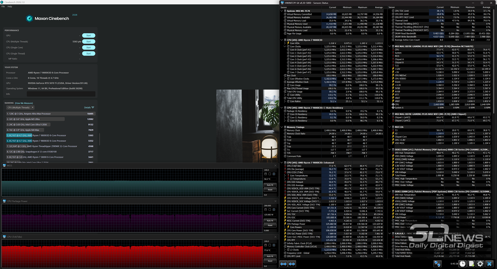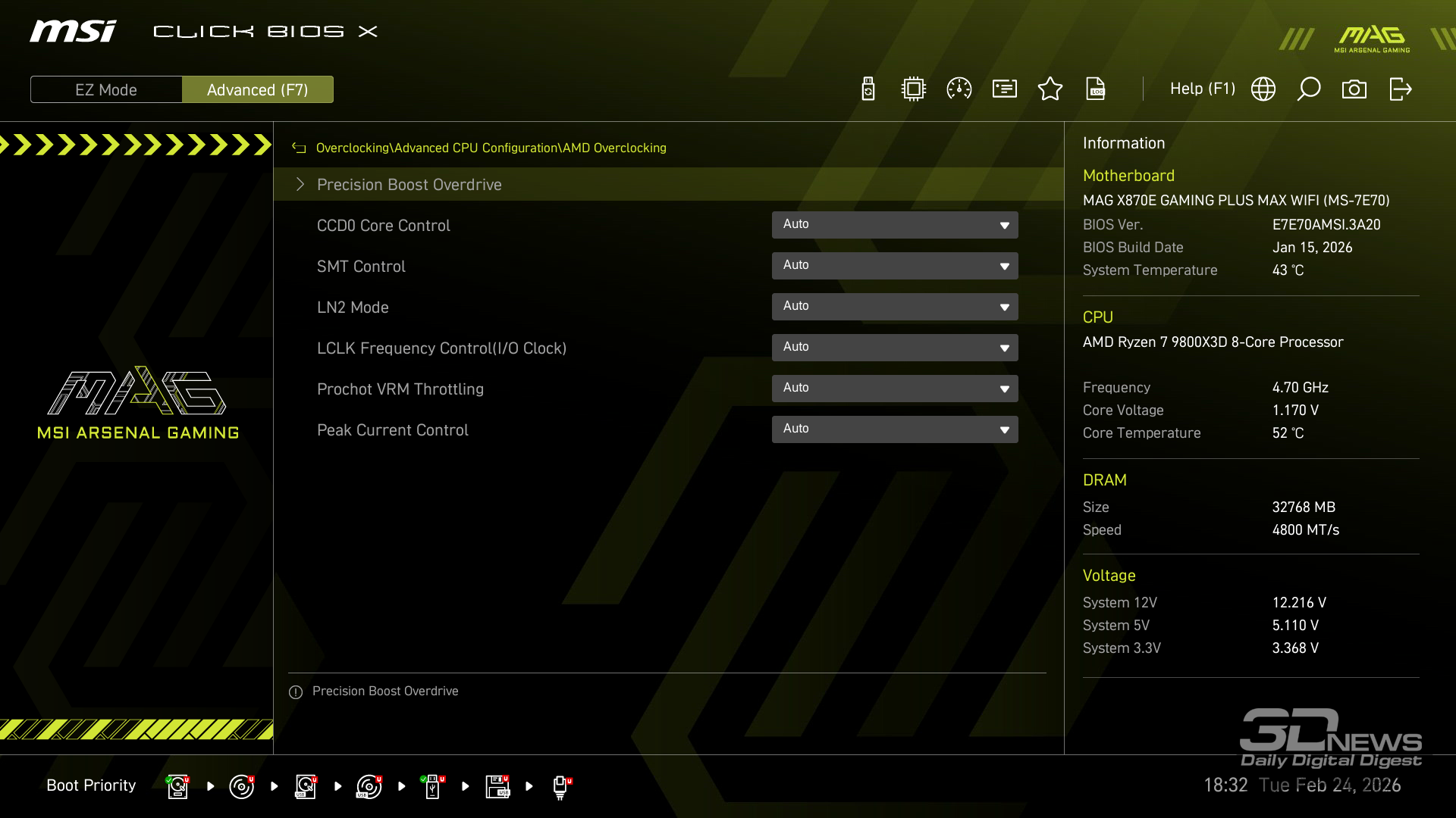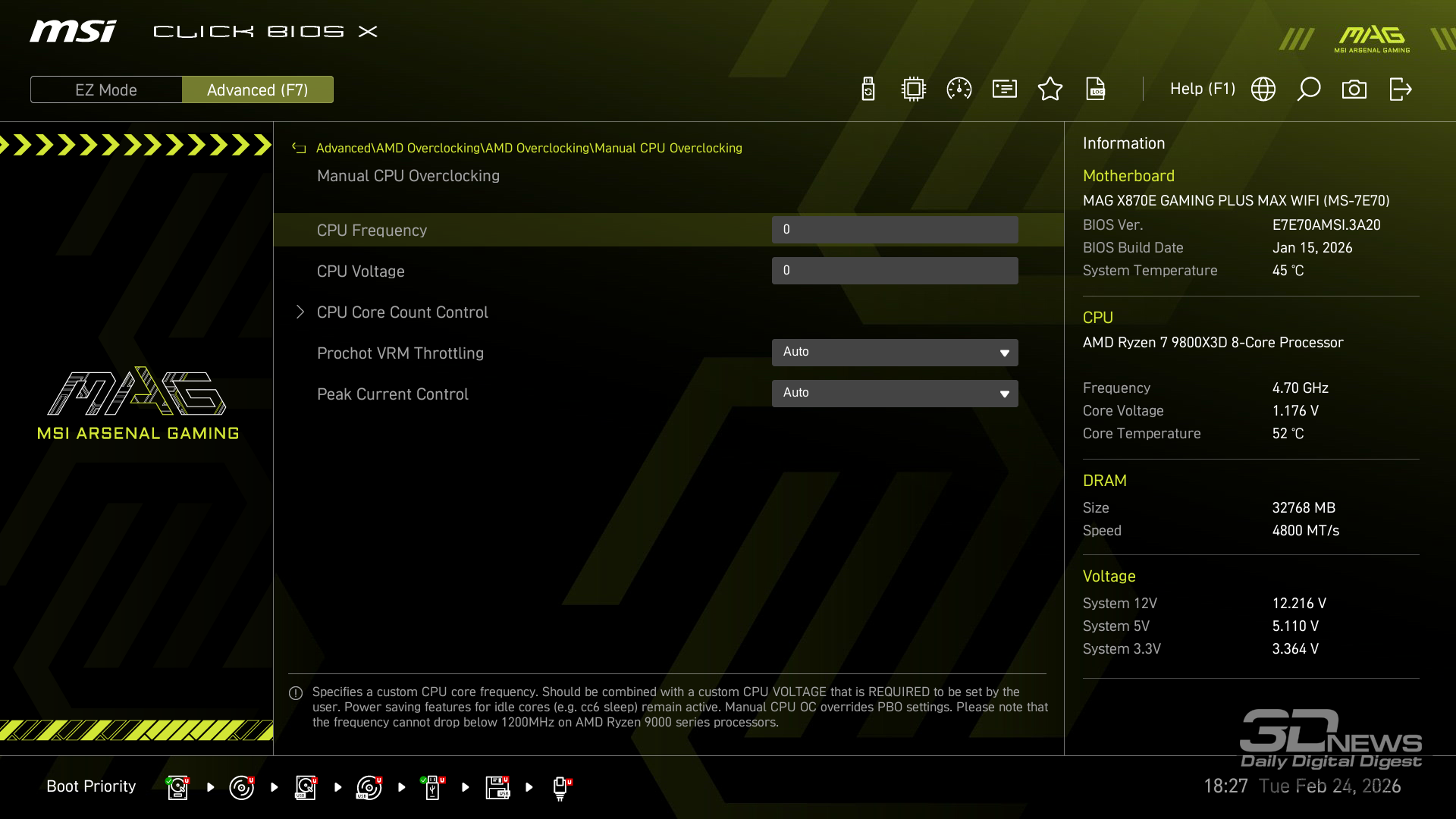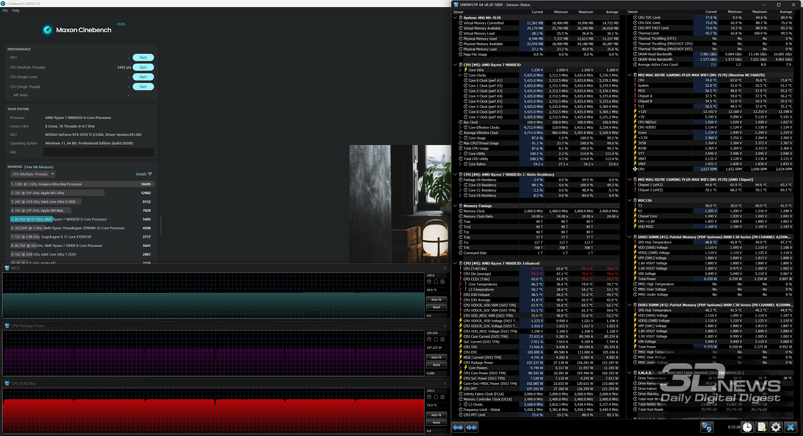 Производительность в играх определялась с помощью хорошо известной программы CapFrameX. Она позволяет получить время рендеринга каждого кадра. Использование 1-го процентиля вместо показателей минимального количества кадров в секунду обусловлено стремлением очистить результаты от случайных всплесков производительности, которые были спровоцированы причинами, не связанными напрямую с работой основных компонентов платформы. ⇡#ТестированиеДля тестирования MAG X870E GAMING PLUS MAX WIFI я собрал актуальную и производительную конфигурацию, включающую 8-ядерный Ryzen 7 9800X3D и GeForce RTX 5070 Ti. Что касается выбора центрального процессора, то перед нами один из самых быстрых игровых чипов современности — быстрее него оказывается только недавно выпущенный Ryzen 7 9850X3D. Правда, разница достигает всего 3 % — и только в связке с GeForce RTX 5090. В режиме по умолчанию энергопотребление Ryzen 7 9800X3D в рабочих задачах достигает 144 Вт, но среднее значение составляет около 131 Вт. Тестирование показывает, что для MAG X870E GAMING PLUS MAX WIFI такая нагрузка — не нагрузка вовсе. Плата легко справляется с такой мощностью и обеспечивает стабильную работу «камня» в режиме 24/7. Встроенные температурные датчики и прочие измерения нагрева конвертера питания показывают, что мы имеем дело с весьма холодной платой. Так, в хорошо продуваемом компьютерном корпусе компоненты VRM-зоны материнки будут греться еще меньше. Показатель в 59 градусов Цельсия дает мне полное право заявлять о том, что MAG X870E GAMING PLUS MAX WIFI легко «потянет» любой существующий чип Ryzen. Мы знаем, что энергопотребление Ryzen 9 9950X3D в тех же условиях достигает 200 Вт. Конвертер питания платы MSI можно нагрузить еще сильнее. Следовательно, материнка готова и к чипам Ryzen будущего поколения, — к тому же поговаривают, что кристаллы Zen 6 окажутся весьма прожорливыми. MAG X870E GAMING PLUS MAX WIFI к этому заранее готова. При входе в BIOS прошивка платы предложит вам активировать функцию PBO в автоматическом режиме. Вручную с ее помощью нередко можно немного разогнать центральный процессор, но одновременно с этим снизить его энергопотребление и нагрев. Включение PBO в автоматическом режиме снизило мощность Ryzen 7 9800X3D примерно на 10 Вт. Вместе с тем на 5 градусов Цельсия упала и температура. Мелочь, а приятно. Делаю вывод, что автоматическая настройка PBO центрального процессора на MAG X870E GAMING PLUS MAX WIFI имеет смысл, однако следует помнить, что любой разгон и оптимизация CPU — это в какой-то степени лотерея. Всегда. Ведь двух одинаковых процессоров в природе не бывает. Ручная настройка PBO, в свою очередь, позволила улучшить работу Ryzen 7 9800X3D еще заметнее. Я настроил лимиты PPT, TDC и EDC, параметр CPU Boost Clock Override увеличил на 200 МГц, а значение Curve Optimizer снизил до -32 для всех ядер. Плюс ядрам чипа было запрещено греться выше 75 градусов Цельсия. После таких несложных процедур частота восьмиядерника под нагрузкой увеличилась с 5,2 до 5,4 ГГц. При этом среднее энергопотребление чипа снизилось с 131 до 121 Вт, а нагрев — с 81 до 76 градусов Цельсия.