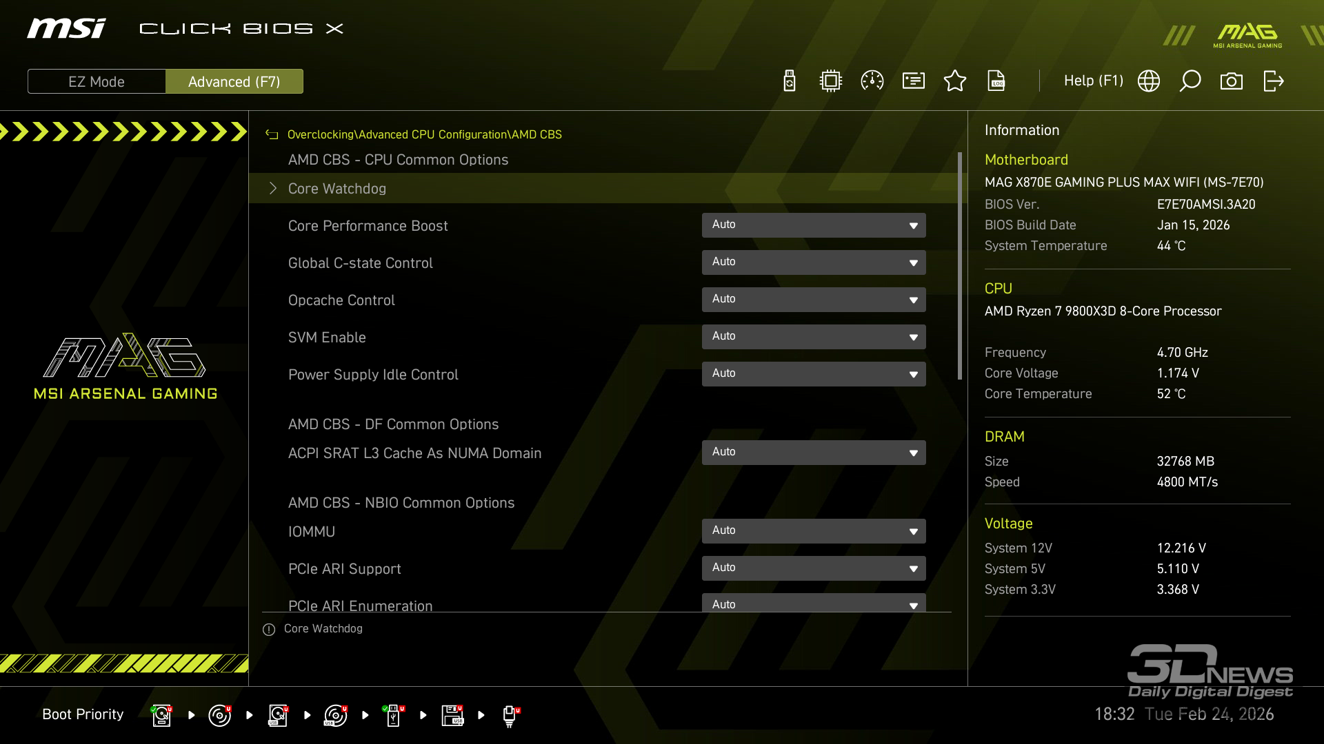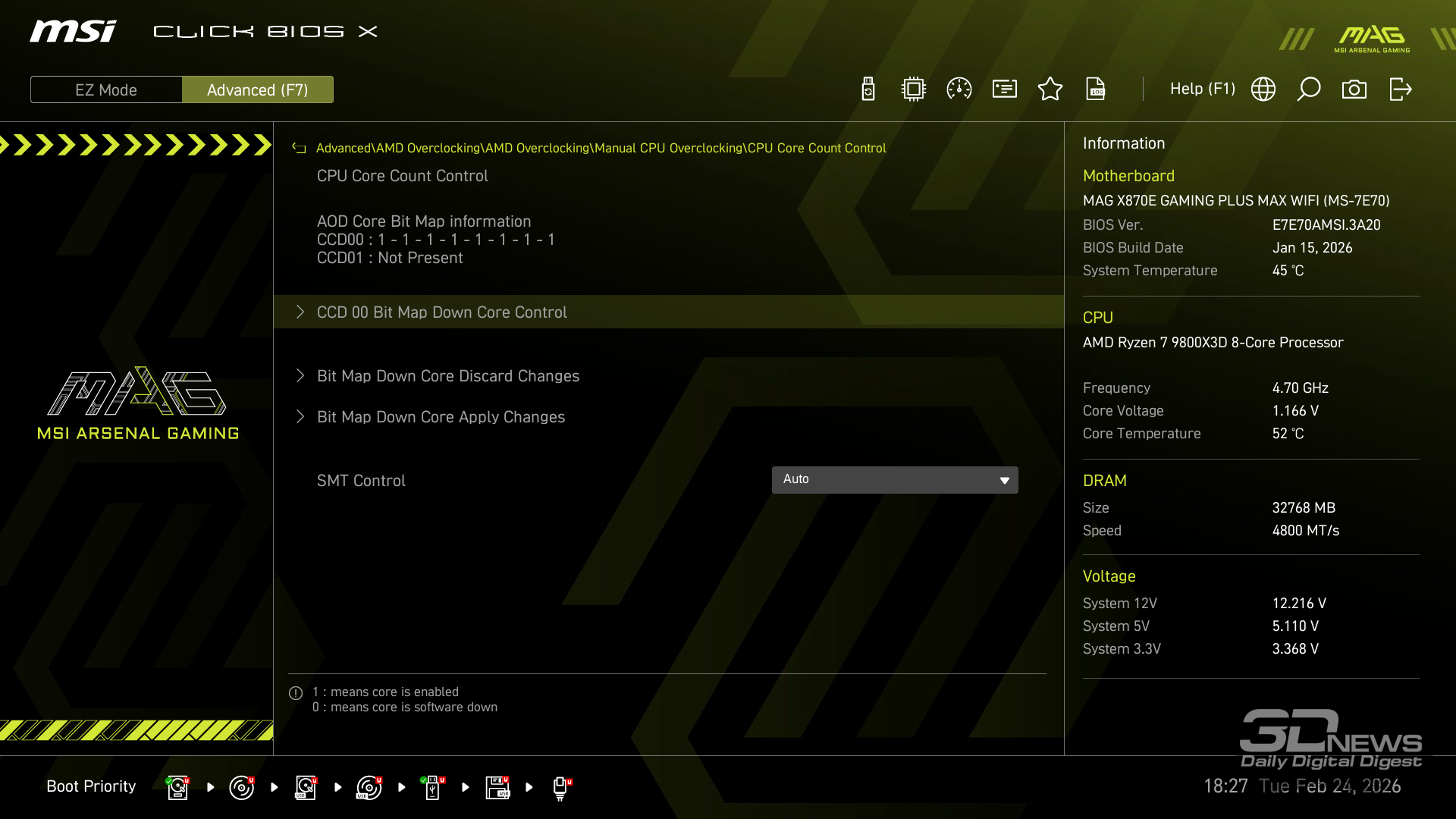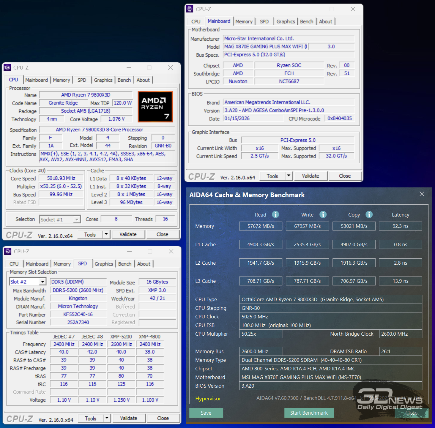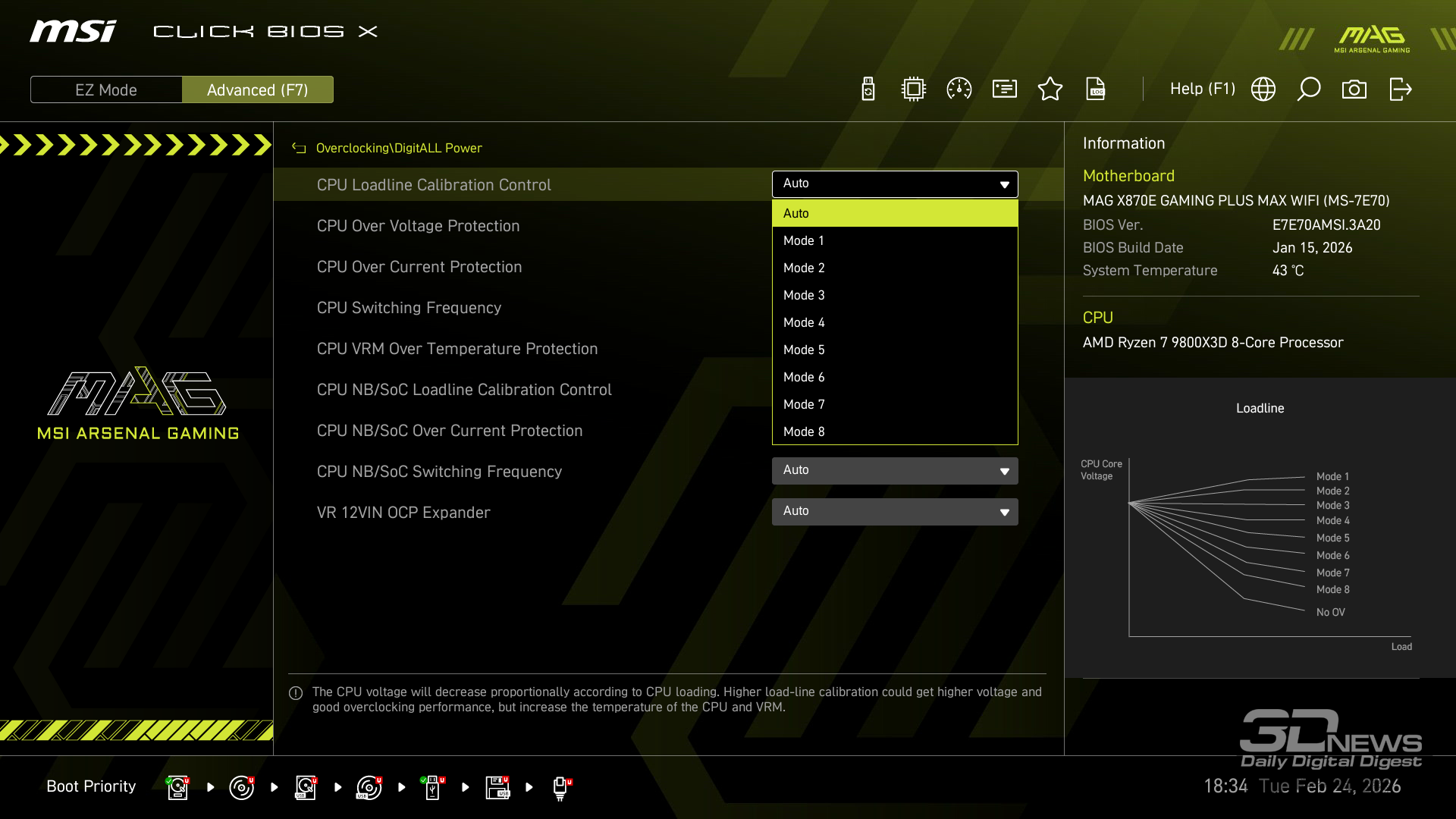 Производительность в играх определялась с помощью хорошо известной программы CapFrameX. Она позволяет получить время рендеринга каждого кадра. Использование 1-го процентиля вместо показателей минимального количества кадров в секунду обусловлено стремлением очистить результаты от случайных всплесков производительности, которые были спровоцированы причинами, не связанными напрямую с работой основных компонентов платформы. ⇡#ТестированиеДля тестирования MAG X870E GAMING PLUS MAX WIFI я собрал актуальную и производительную конфигурацию, включающую 8-ядерный Ryzen 7 9800X3D и GeForce RTX 5070 Ti. Что касается выбора центрального процессора, то перед нами один из самых быстрых игровых чипов современности — быстрее него оказывается только недавно выпущенный Ryzen 7 9850X3D. Правда, разница достигает всего 3 % — и только в связке с GeForce RTX 5090. В режиме по умолчанию энергопотребление Ryzen 7 9800X3D в рабочих задачах достигает 144 Вт, но среднее значение составляет около 131 Вт. Тестирование показывает, что для MAG X870E GAMING PLUS MAX WIFI такая нагрузка — не нагрузка вовсе. Плата легко справляется с такой мощностью и обеспечивает стабильную работу «камня» в режиме 24/7. Встроенные температурные датчики и прочие измерения нагрева конвертера питания показывают, что мы имеем дело с весьма холодной платой. Так, в хорошо продуваемом компьютерном корпусе компоненты VRM-зоны материнки будут греться еще меньше. Показатель в 59 градусов Цельсия дает мне полное право заявлять о том, что MAG X870E GAMING PLUS MAX WIFI легко «потянет» любой существующий чип Ryzen. Мы знаем, что энергопотребление Ryzen 9 9950X3D в тех же условиях достигает 200 Вт. Конвертер питания платы MSI можно нагрузить еще сильнее. Следовательно, материнка готова и к чипам Ryzen будущего поколения, — к тому же поговаривают, что кристаллы Zen 6 окажутся весьма прожорливыми. MAG X870E GAMING PLUS MAX WIFI к этому заранее готова. При входе в BIOS прошивка платы предложит вам активировать функцию PBO в автоматическом режиме. Вручную с ее помощью нередко можно немного разогнать центральный процессор, но одновременно с этим снизить его энергопотребление и нагрев. Включение PBO в автоматическом режиме снизило мощность Ryzen 7 9800X3D примерно на 10 Вт. Вместе с тем на 5 градусов Цельсия упала и температура. Мелочь, а приятно. Делаю вывод, что автоматическая настройка PBO центрального процессора на MAG X870E GAMING PLUS MAX WIFI имеет смысл, однако следует помнить, что любой разгон и оптимизация CPU — это в какой-то степени лотерея. Всегда. Ведь двух одинаковых процессоров в природе не бывает. Ручная настройка PBO, в свою очередь, позволила улучшить работу Ryzen 7 9800X3D еще заметнее. Я настроил лимиты PPT, TDC и EDC, параметр CPU Boost Clock Override увеличил на 200 МГц, а значение Curve Optimizer снизил до -32 для всех ядер. Плюс ядрам чипа было запрещено греться выше 75 градусов Цельсия. После таких несложных процедур частота восьмиядерника под нагрузкой увеличилась с 5,2 до 5,4 ГГц. При этом среднее энергопотребление чипа снизилось с 131 до 121 Вт, а нагрев — с 81 до 76 градусов Цельсия.