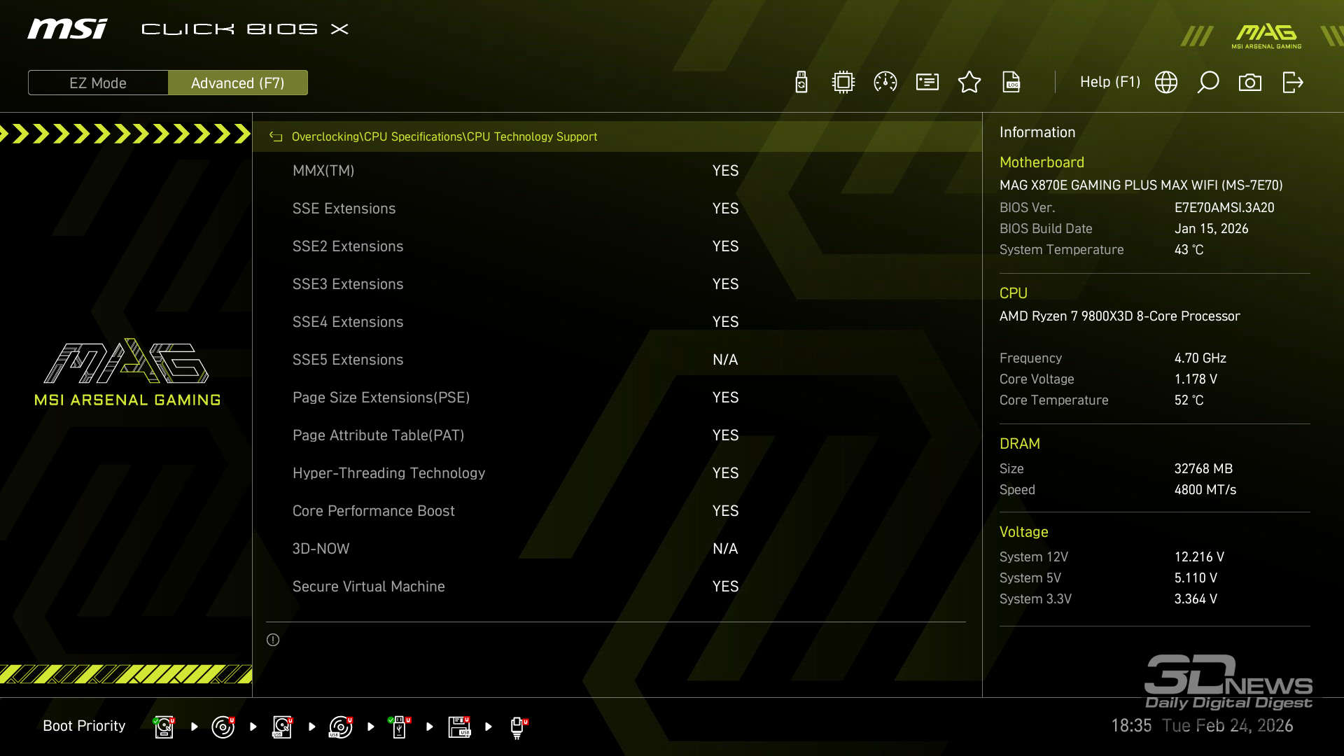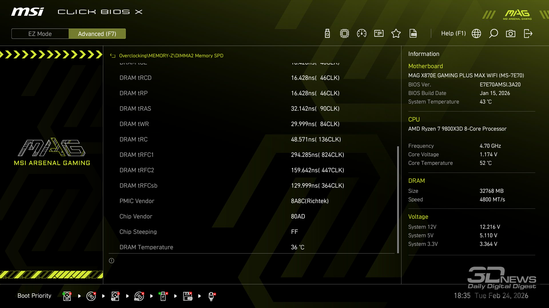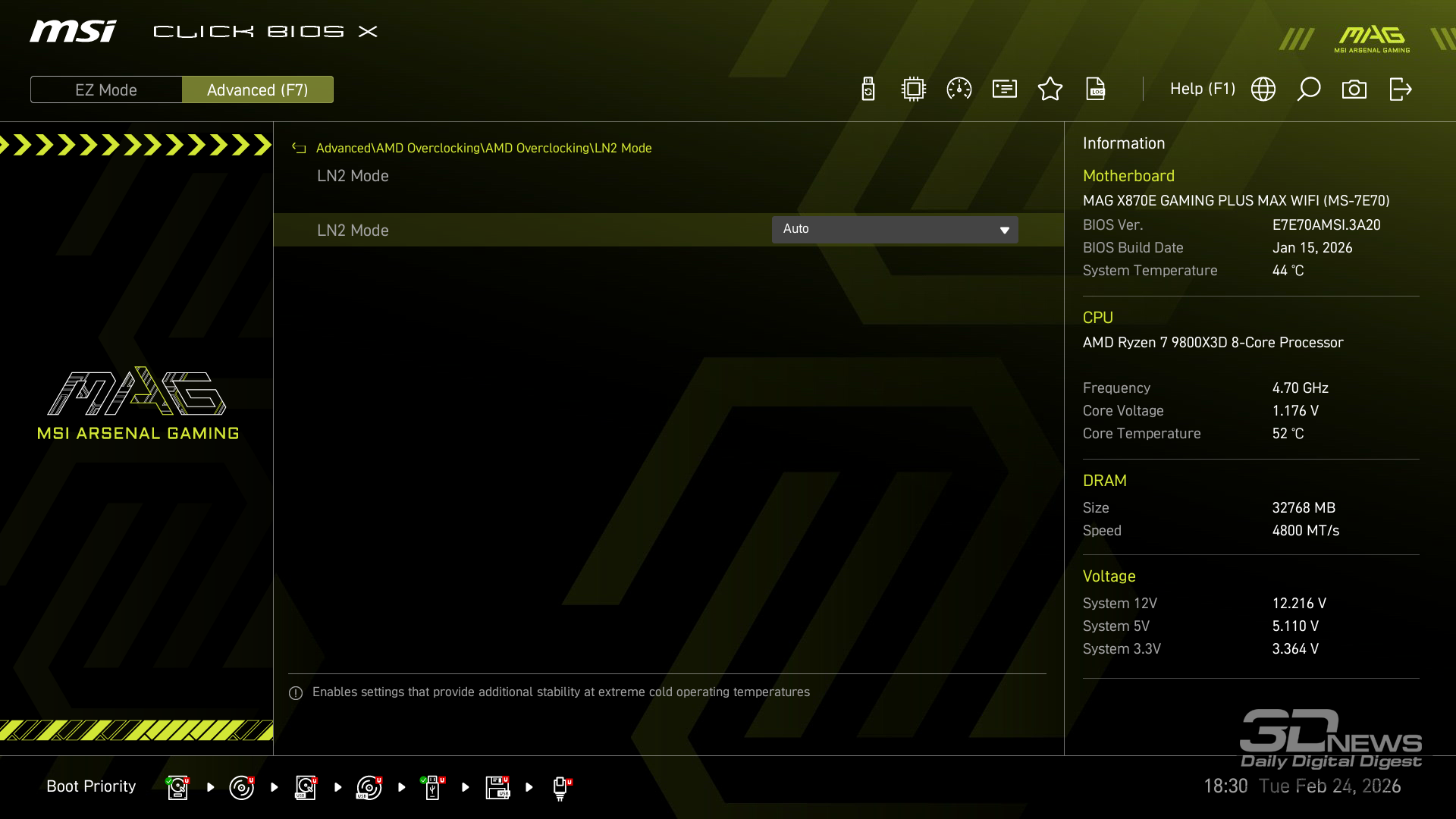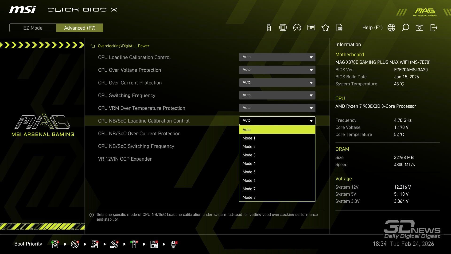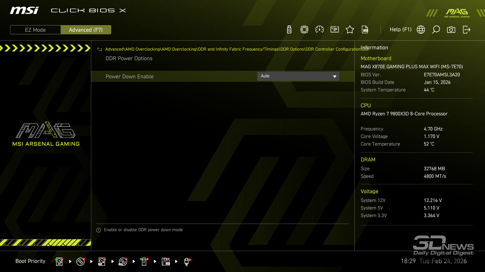 Производительность в играх определялась с помощью хорошо известной программы CapFrameX. Она позволяет получить время рендеринга каждого кадра. Использование 1-го процентиля вместо показателей минимального количества кадров в секунду обусловлено стремлением очистить результаты от случайных всплесков производительности, которые были спровоцированы причинами, не связанными напрямую с работой основных компонентов платформы. ⇡#ТестированиеДля тестирования MAG X870E GAMING PLUS MAX WIFI я собрал актуальную и производительную конфигурацию, включающую 8-ядерный Ryzen 7 9800X3D и GeForce RTX 5070 Ti. Что касается выбора центрального процессора, то перед нами один из самых быстрых игровых чипов современности — быстрее него оказывается только недавно выпущенный Ryzen 7 9850X3D. Правда, разница достигает всего 3 % — и только в связке с GeForce RTX 5090. В режиме по умолчанию энергопотребление Ryzen 7 9800X3D в рабочих задачах достигает 144 Вт, но среднее значение составляет около 131 Вт. Тестирование показывает, что для MAG X870E GAMING PLUS MAX WIFI такая нагрузка — не нагрузка вовсе. Плата легко справляется с такой мощностью и обеспечивает стабильную работу «камня» в режиме 24/7. Встроенные температурные датчики и прочие измерения нагрева конвертера питания показывают, что мы имеем дело с весьма холодной платой. Так, в хорошо продуваемом компьютерном корпусе компоненты VRM-зоны материнки будут греться еще меньше. Показатель в 59 градусов Цельсия дает мне полное право заявлять о том, что MAG X870E GAMING PLUS MAX WIFI легко «потянет» любой существующий чип Ryzen. Мы знаем, что энергопотребление Ryzen 9 9950X3D в тех же условиях достигает 200 Вт. Конвертер питания платы MSI можно нагрузить еще сильнее. Следовательно, материнка готова и к чипам Ryzen будущего поколения, — к тому же поговаривают, что кристаллы Zen 6 окажутся весьма прожорливыми. MAG X870E GAMING PLUS MAX WIFI к этому заранее готова. При входе в BIOS прошивка платы предложит вам активировать функцию PBO в автоматическом режиме. Вручную с ее помощью нередко можно немного разогнать центральный процессор, но одновременно с этим снизить его энергопотребление и нагрев. Включение PBO в автоматическом режиме снизило мощность Ryzen 7 9800X3D примерно на 10 Вт. Вместе с тем на 5 градусов Цельсия упала и температура. Мелочь, а приятно. Делаю вывод, что автоматическая настройка PBO центрального процессора на MAG X870E GAMING PLUS MAX WIFI имеет смысл, однако следует помнить, что любой разгон и оптимизация CPU — это в какой-то степени лотерея. Всегда. Ведь двух одинаковых процессоров в природе не бывает. Ручная настройка PBO, в свою очередь, позволила улучшить работу Ryzen 7 9800X3D еще заметнее. Я настроил лимиты PPT, TDC и EDC, параметр CPU Boost Clock Override увеличил на 200 МГц, а значение Curve Optimizer снизил до -32 для всех ядер. Плюс ядрам чипа было запрещено греться выше 75 градусов Цельсия. После таких несложных процедур частота восьмиядерника под нагрузкой увеличилась с 5,2 до 5,4 ГГц. При этом среднее энергопотребление чипа снизилось с 131 до 121 Вт, а нагрев — с 81 до 76 градусов Цельсия.
