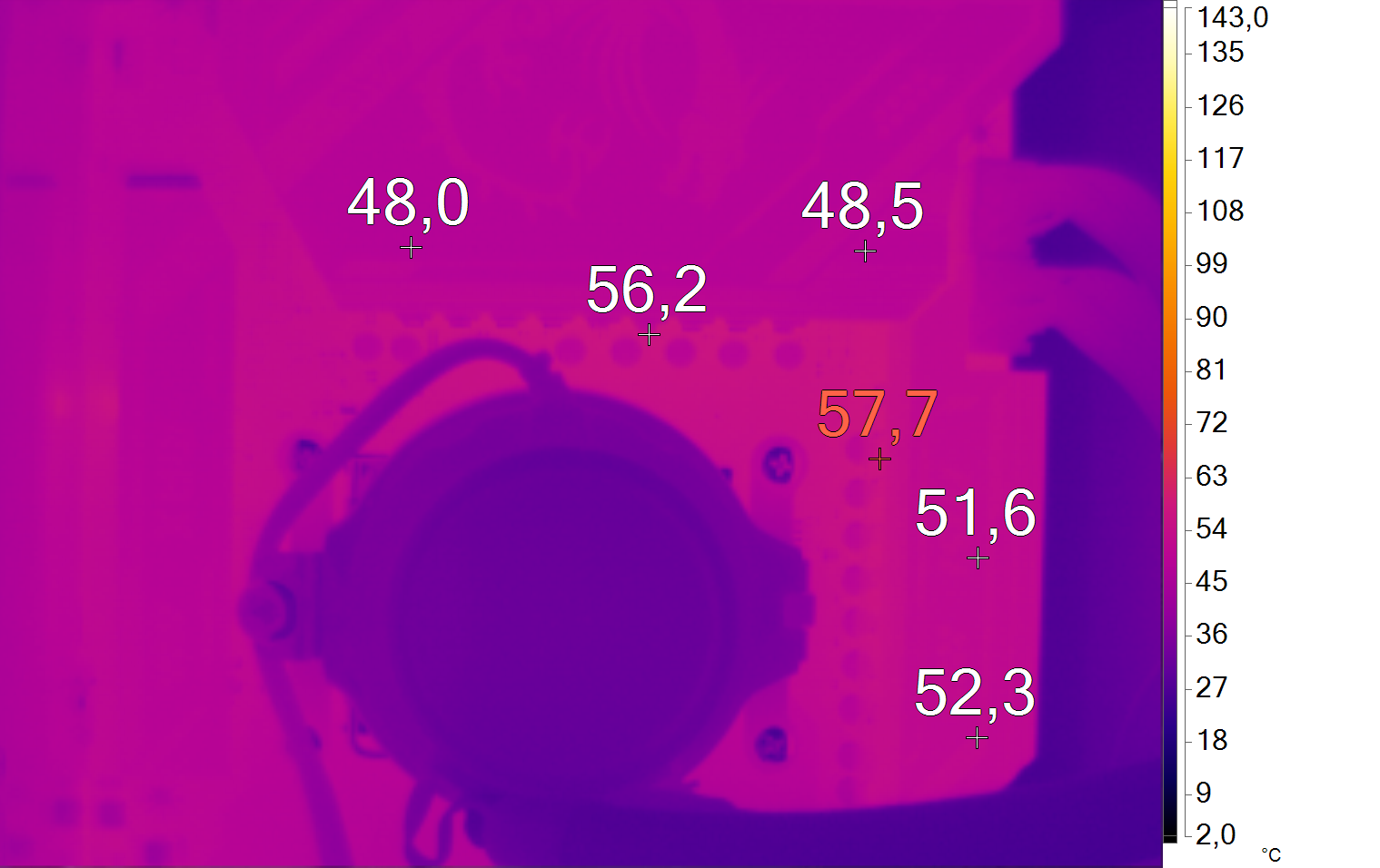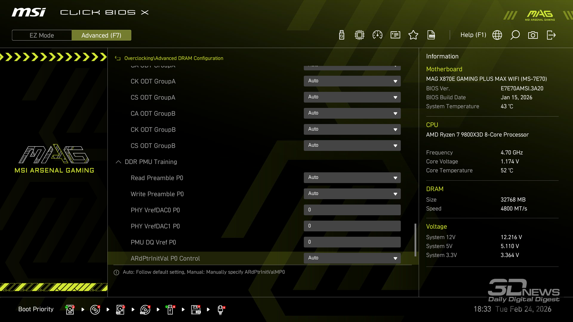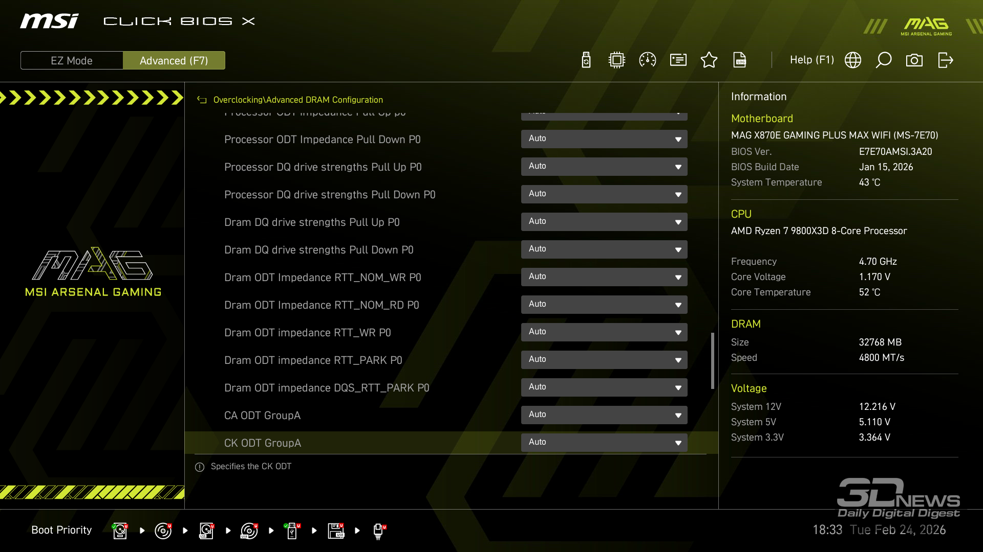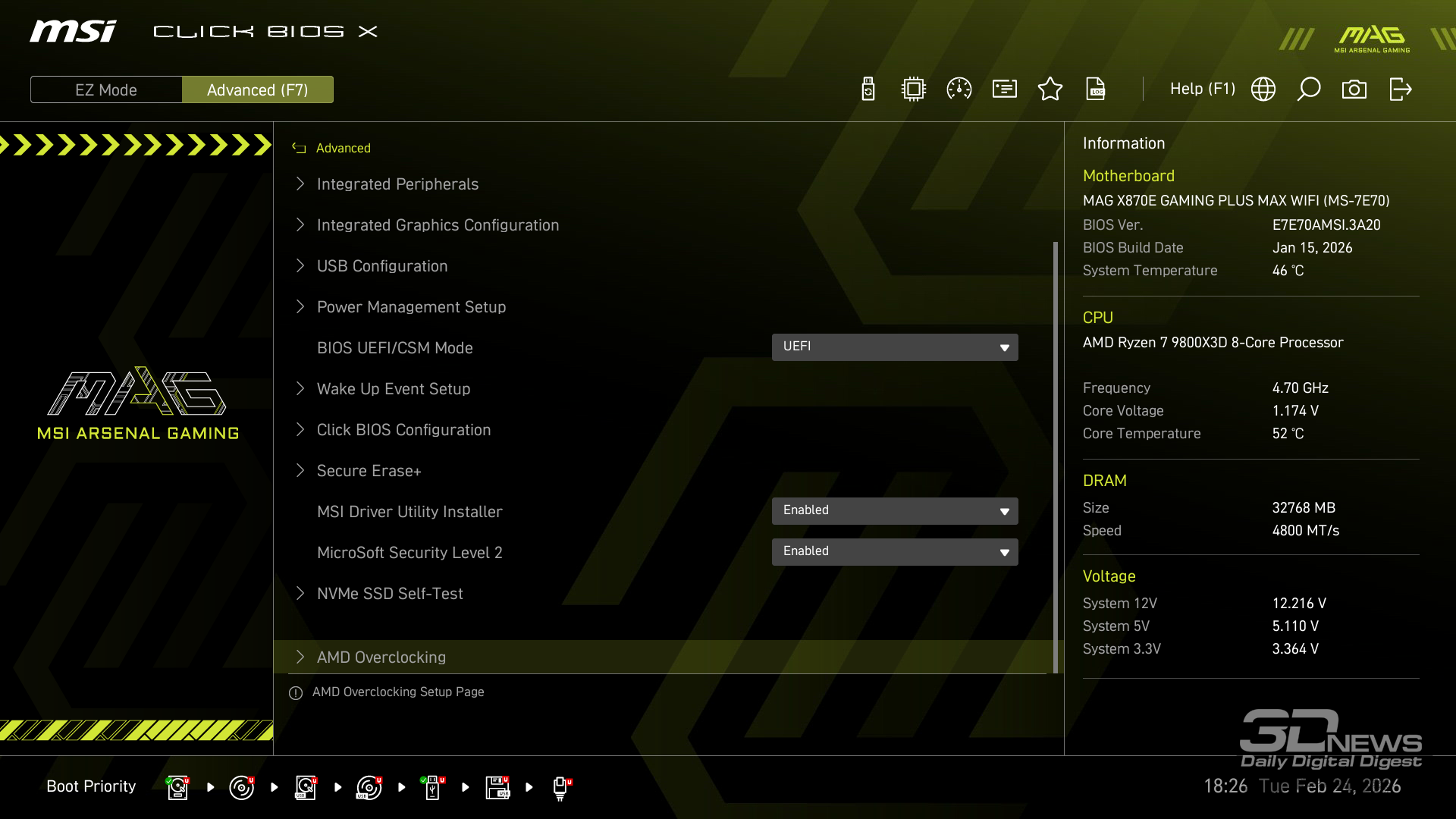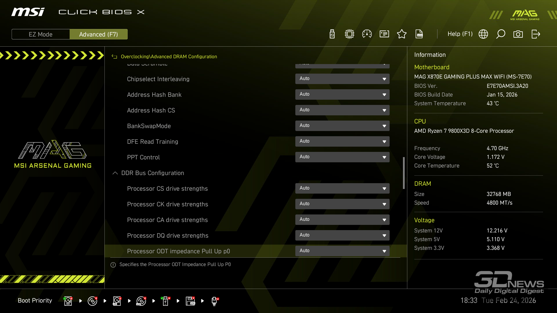 Производительность в играх определялась с помощью хорошо известной программы CapFrameX. Она позволяет получить время рендеринга каждого кадра. Использование 1-го процентиля вместо показателей минимального количества кадров в секунду обусловлено стремлением очистить результаты от случайных всплесков производительности, которые были спровоцированы причинами, не связанными напрямую с работой основных компонентов платформы. ⇡#ТестированиеДля тестирования MAG X870E GAMING PLUS MAX WIFI я собрал актуальную и производительную конфигурацию, включающую 8-ядерный Ryzen 7 9800X3D и GeForce RTX 5070 Ti. Что касается выбора центрального процессора, то перед нами один из самых быстрых игровых чипов современности — быстрее него оказывается только недавно выпущенный Ryzen 7 9850X3D. Правда, разница достигает всего 3 % — и только в связке с GeForce RTX 5090. В режиме по умолчанию энергопотребление Ryzen 7 9800X3D в рабочих задачах достигает 144 Вт, но среднее значение составляет около 131 Вт. Тестирование показывает, что для MAG X870E GAMING PLUS MAX WIFI такая нагрузка — не нагрузка вовсе. Плата легко справляется с такой мощностью и обеспечивает стабильную работу «камня» в режиме 24/7. Встроенные температурные датчики и прочие измерения нагрева конвертера питания показывают, что мы имеем дело с весьма холодной платой. Так, в хорошо продуваемом компьютерном корпусе компоненты VRM-зоны материнки будут греться еще меньше. Показатель в 59 градусов Цельсия дает мне полное право заявлять о том, что MAG X870E GAMING PLUS MAX WIFI легко «потянет» любой существующий чип Ryzen. Мы знаем, что энергопотребление Ryzen 9 9950X3D в тех же условиях достигает 200 Вт. Конвертер питания платы MSI можно нагрузить еще сильнее. Следовательно, материнка готова и к чипам Ryzen будущего поколения, — к тому же поговаривают, что кристаллы Zen 6 окажутся весьма прожорливыми. MAG X870E GAMING PLUS MAX WIFI к этому заранее готова. При входе в BIOS прошивка платы предложит вам активировать функцию PBO в автоматическом режиме. Вручную с ее помощью нередко можно немного разогнать центральный процессор, но одновременно с этим снизить его энергопотребление и нагрев. Включение PBO в автоматическом режиме снизило мощность Ryzen 7 9800X3D примерно на 10 Вт. Вместе с тем на 5 градусов Цельсия упала и температура. Мелочь, а приятно. Делаю вывод, что автоматическая настройка PBO центрального процессора на MAG X870E GAMING PLUS MAX WIFI имеет смысл, однако следует помнить, что любой разгон и оптимизация CPU — это в какой-то степени лотерея. Всегда. Ведь двух одинаковых процессоров в природе не бывает. Ручная настройка PBO, в свою очередь, позволила улучшить работу Ryzen 7 9800X3D еще заметнее. Я настроил лимиты PPT, TDC и EDC, параметр CPU Boost Clock Override увеличил на 200 МГц, а значение Curve Optimizer снизил до -32 для всех ядер. Плюс ядрам чипа было запрещено греться выше 75 градусов Цельсия. После таких несложных процедур частота восьмиядерника под нагрузкой увеличилась с 5,2 до 5,4 ГГц. При этом среднее энергопотребление чипа снизилось с 131 до 121 Вт, а нагрев — с 81 до 76 градусов Цельсия.