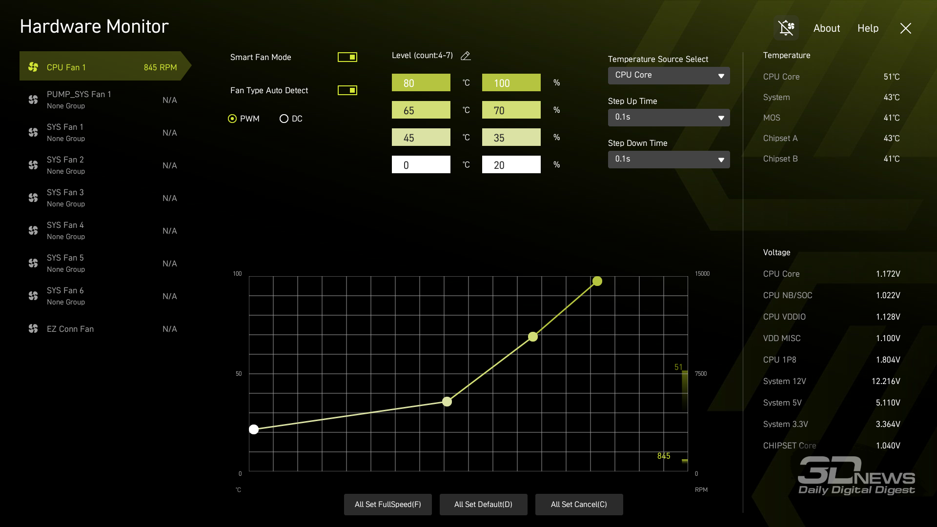 Смотреть все изображения (83) Параметры процессора и памяти, прямо влияющие на производительность, собраны в специальном разделе Overclocking. Здесь открывается доступ ко всему, что может потребоваться при тонкой настройке системы: к частотам процессора, BCLK и FCLK, делителям UCLK и памяти, таймингам памяти, а также к напряжениям. Интервалы изменений основных настроек приведены в таблице. Отдельно отмечу наличие в BIOS полнофункционального меню Precision Boost Override, куда вынесены не только опции для управления лимитами потребления процессора, но и регулировки функции Curve Optimizer. Кроме того, здесь же MSI предлагает предопределенные профили PBO, настроенные на разные варианты максимального потребления процессора либо на его разные целевые температуры. В меню Hardware Monitor нам позволено настроить частоту вращения всех подключенных к материнской плате вентиляторов. Плата поддерживает регулировку как в режиме PWM, так и DC — то есть мы можем настраивать частоту вращения даже «карлсонов» без ШИМ. Параметры работы крыльчаток привязываются к показателям четырех датчиков: ядрам процессора, системе, конвертера питания или чипсета. Кроме того, полезной может быть функция Memory Try It!, которая предлагает готовые профили настроек памяти для тех, кто не готов тратить время на ручной подбор параметров.