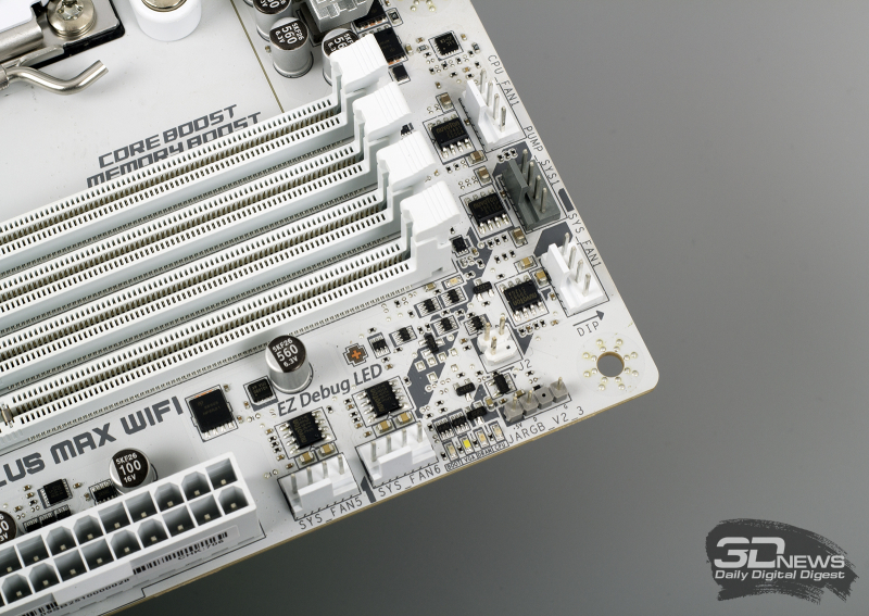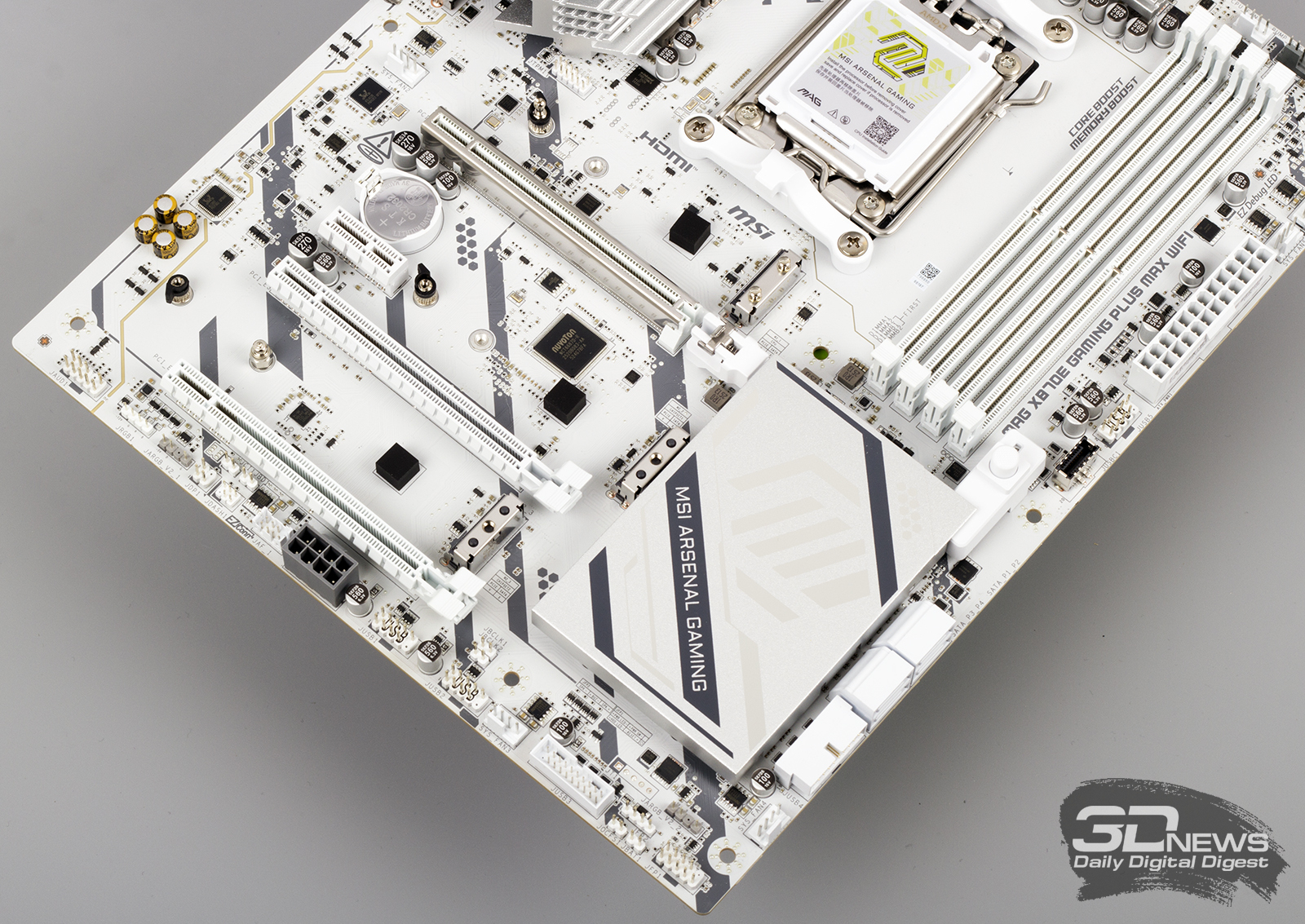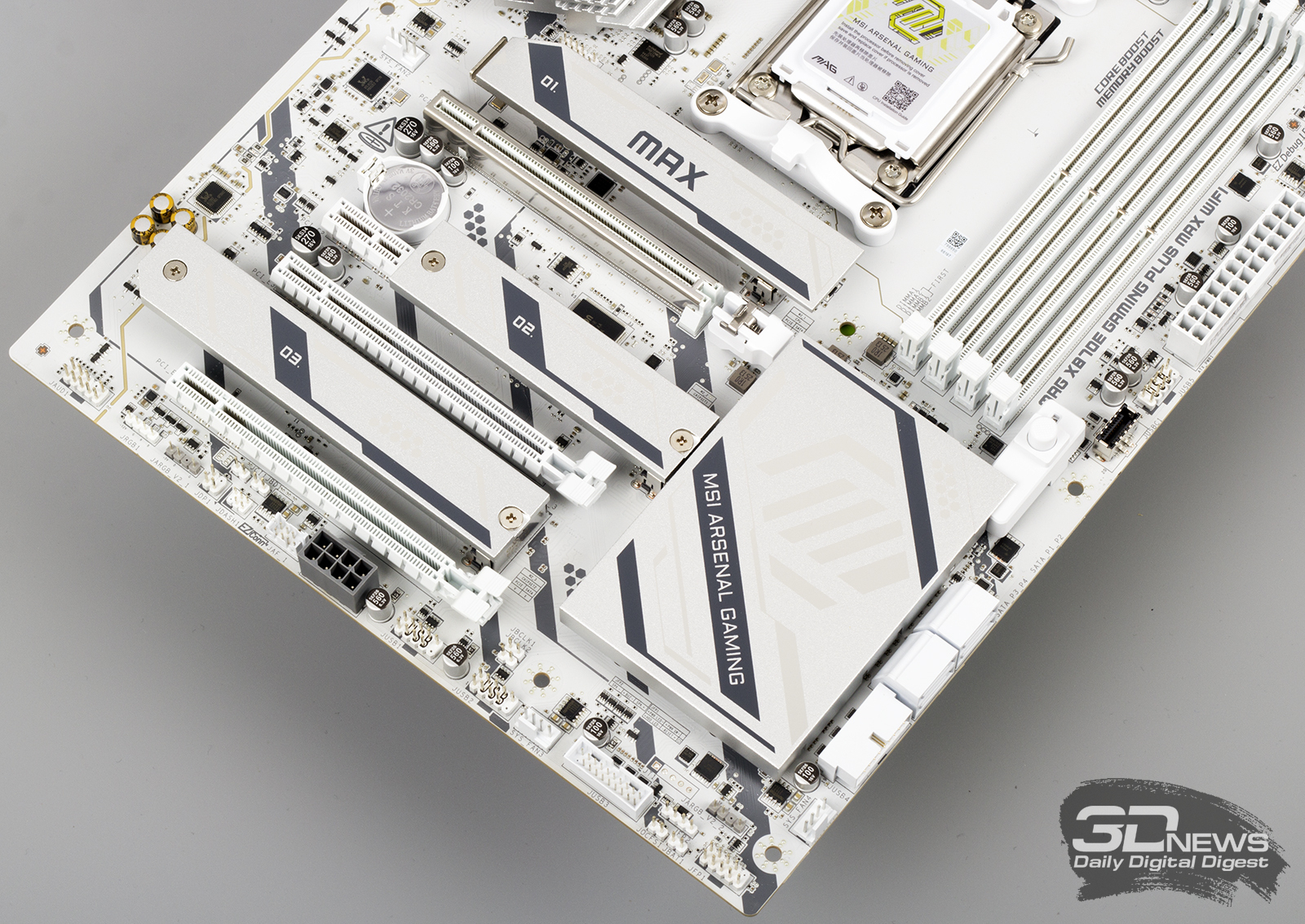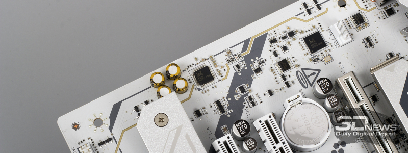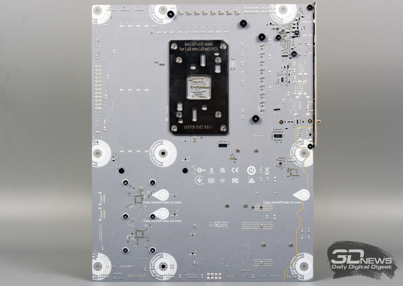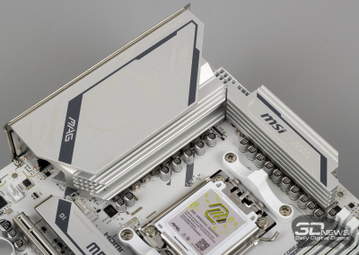 ⇡#Особенности матплатыВ обзорах материнских плат я редко описываю их внешний вид, но в случае с MAG X870E GAMING PLUS MAX WIFI определенно стоит сделать исключение. Дело в том, что устройство нельзя назвать белым. Скорее речь идет об использовании текстолита и прочих деталей серебряного цвета. Как человек, постоянно собирающий системные блоки, отмечу, что герой обзора одинаково хорошо будет смотреться как в конфигурациях белого цвета, так и в системах, использующих черные комплектующие. Простора для творчества много. Важно, что в основе MAG X870E GAMING PLUS MAX WIFI лежит 8-слойная печатная плата. Значит, мы вправе ожидать от материнки стабильной работы под очень высокими нагрузками и отличной оптимизации центрального процессора и оперативной памяти. Плата поддерживает все вышедшие Ryzen, совместимые с гнездом AM5. На текстолите распаяно четыре слота UDIMM, столько же портов PCI Express и три разъема M.2 для установки твердотельных накопителей. Броня присутствует: силовые цепи конвертера питания охлаждаются массивными алюминиевыми радиаторами; каждый «ангар» под SSD оснащен «крышей» в виде системы охлаждения M.2 Shild Frozr; чипсет накрыт крупной алюминиевой пластиной; основной PEG-интерфейс защищен стальной рамкой Steel Armor II. MAG X870E GAMING PLUS MAX WIFI — игровая материнская плата, и отчего-то мне кажется, что на ее основе будут собирать мощные ПК с Ryzen 7 9800X3D, видеокартой уровня GeForce RTX 5080, минимум 32 Гбайт ОЗУ и быстрым твердотельным накопителем. К такому набору железа так и просится необслуживаемая СЖО или суперкулер. Проблем во время сборки комплектующих у вас не возникнет. Смотрите, ни один суперкулер не перекроет распаянный ниже сокета PEG-порт. «Достаться» может модулям оперативной памяти, но при грамотном выборе железа ничего критичного не произойдет — смотрите на высоту комплекта. Большие и горячие современные видеокарты, как правило, занимают в корпусе три, а то и четыре слота расширения. Значит, с портом PCI Express x1 3.0 на MAG X870E GAMING PLUS MAX WIFI придется распрощаться. Основной PEG-порт работает в режиме PCI Express x16 5.0, если в системе установлен чип серий Ryzen 7000 или Ryzen 9000. Кроме того, благодаря защелке EZ PCI-E, громоздкие видеокарты легко устанавливать в корпус и извлекать из него. Опытный сборщик разберется даже с закрытыми глазами. Прочие слоты PCI Express собраны в полноценных корпусах, но работают в усеченном режиме. Они подключены напрямую к чипсету и не конфликтуют с разъемами для накопителей. Основной порт M.2 подключен напрямую к процессору и работает в режиме PCI Express x4 5.0. Самые быстрые SSD — welcome в нашу сборку. Разъем оснащен быстросъемным радиатором EZ M.2 Shield Frozr II, что обеспечивает моментальный доступ к накопителю. Прочие M.2-слоты тоже оснащены охлаждающими радиаторами. В случае использования в системе габаритной видеокарты второй порт под SSD будет перекрыт. Не вижу ничего страшного в этой ситуации. А еще MAG X870E GAMING PLUS MAX WIFI оснащена четырьмя портами SATA 6 Гбит/с. Материнская плата оснащена сразу восемью коннекторами для подключения вентиляторов! Все порты умеют регулировать частоту вращения вентиляторов как с ШИМ, так и без нее. Весь необходимый инструментарий заложен в BIOS устройства. Основной блок разъемов расположен в правой верхней части текстолита. Здесь кучно распаяны пять коннекторов для подключения вентиляторов и помпы СЖО, колодки для подключения RGB-лент, а также линейка светодиодов EZ Debug