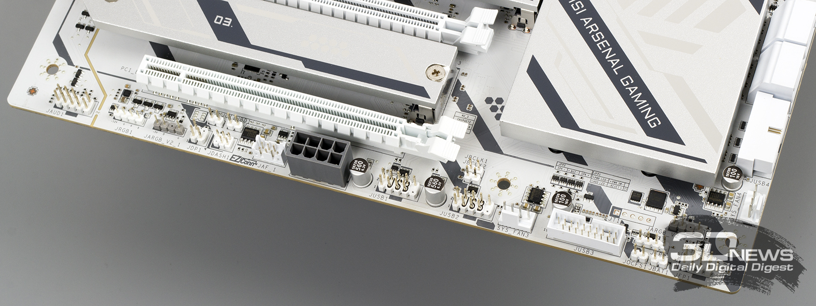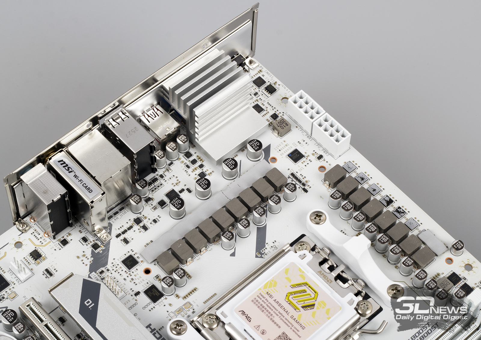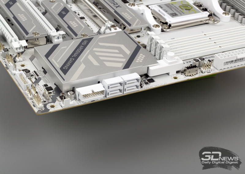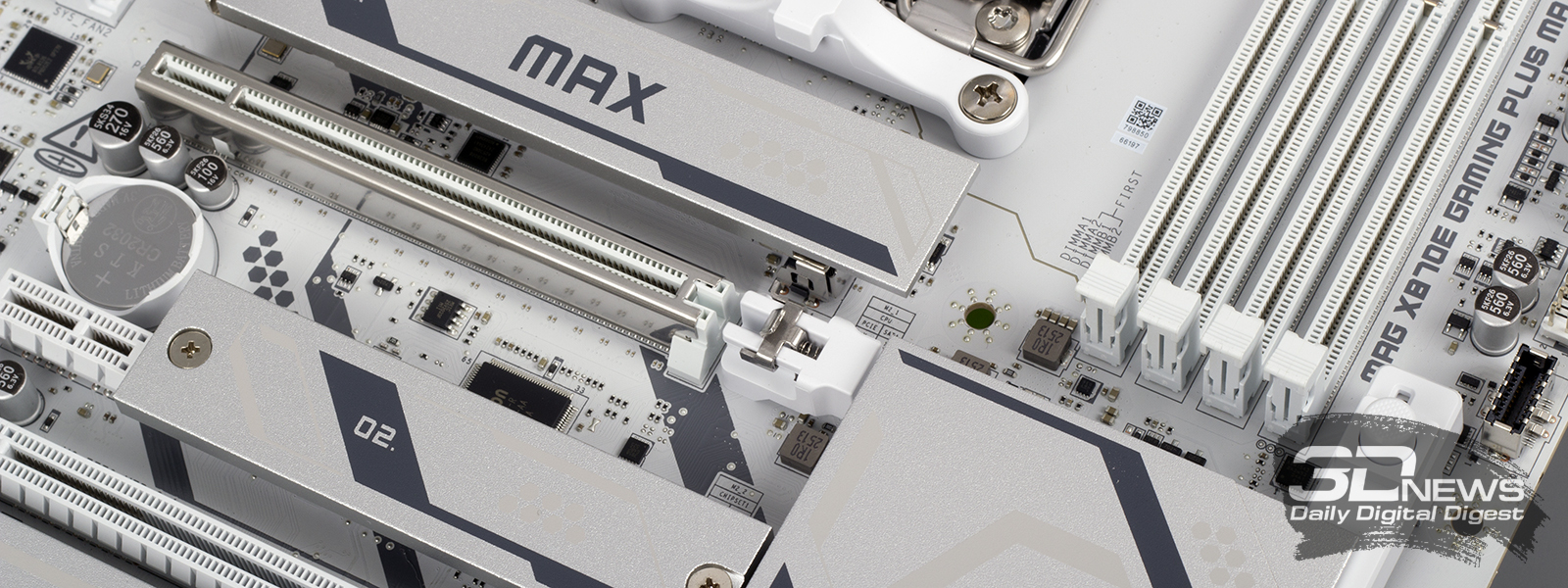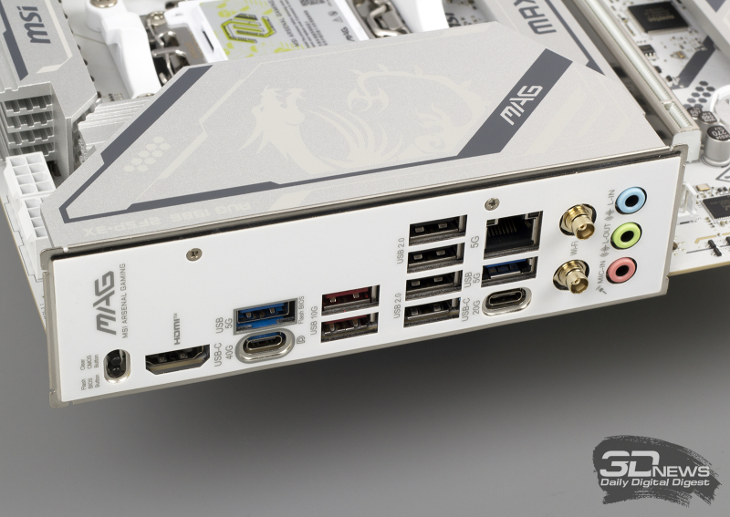 ⇡#Особенности матплатыВ обзорах материнских плат я редко описываю их внешний вид, но в случае с MAG X870E GAMING PLUS MAX WIFI определенно стоит сделать исключение. Дело в том, что устройство нельзя назвать белым. Скорее речь идет об использовании текстолита и прочих деталей серебряного цвета. Как человек, постоянно собирающий системные блоки, отмечу, что герой обзора одинаково хорошо будет смотреться как в конфигурациях белого цвета, так и в системах, использующих черные комплектующие. Простора для творчества много. Важно, что в основе MAG X870E GAMING PLUS MAX WIFI лежит 8-слойная печатная плата. Значит, мы вправе ожидать от материнки стабильной работы под очень высокими нагрузками и отличной оптимизации центрального процессора и оперативной памяти. Плата поддерживает все вышедшие Ryzen, совместимые с гнездом AM5. На текстолите распаяно четыре слота UDIMM, столько же портов PCI Express и три разъема M.2 для установки твердотельных накопителей. Броня присутствует: силовые цепи конвертера питания охлаждаются массивными алюминиевыми радиаторами; каждый «ангар» под SSD оснащен «крышей» в виде системы охлаждения M.2 Shild Frozr; чипсет накрыт крупной алюминиевой пластиной; основной PEG-интерфейс защищен стальной рамкой Steel Armor II. MAG X870E GAMING PLUS MAX WIFI — игровая материнская плата, и отчего-то мне кажется, что на ее основе будут собирать мощные ПК с Ryzen 7 9800X3D, видеокартой уровня GeForce RTX 5080, минимум 32 Гбайт ОЗУ и быстрым твердотельным накопителем. К такому набору железа так и просится необслуживаемая СЖО или суперкулер. Проблем во время сборки комплектующих у вас не возникнет. Смотрите, ни один суперкулер не перекроет распаянный ниже сокета PEG-порт. «Достаться» может модулям оперативной памяти, но при грамотном выборе железа ничего критичного не произойдет — смотрите на высоту комплекта. Большие и горячие современные видеокарты, как правило, занимают в корпусе три, а то и четыре слота расширения. Значит, с портом PCI Express x1 3.0 на MAG X870E GAMING PLUS MAX WIFI придется распрощаться. Основной PEG-порт работает в режиме PCI Express x16 5.0, если в системе установлен чип серий Ryzen 7000 или Ryzen 9000. Кроме того, благодаря защелке EZ PCI-E, громоздкие видеокарты легко устанавливать в корпус и извлекать из него. Опытный сборщик разберется даже с закрытыми глазами. Прочие слоты PCI Express собраны в полноценных корпусах, но работают в усеченном режиме. Они подключены напрямую к чипсету и не конфликтуют с разъемами для накопителей. Основной порт M.2 подключен напрямую к процессору и работает в режиме PCI Express x4 5.0. Самые быстрые SSD — welcome в нашу сборку. Разъем оснащен быстросъемным радиатором EZ M.2 Shield Frozr II, что обеспечивает моментальный доступ к накопителю. Прочие M.2-слоты тоже оснащены охлаждающими радиаторами. В случае использования в системе габаритной видеокарты второй порт под SSD будет перекрыт. Не вижу ничего страшного в этой ситуации. А еще MAG X870E GAMING PLUS MAX WIFI оснащена четырьмя портами SATA 6 Гбит/с. Материнская плата оснащена сразу восемью коннекторами для подключения вентиляторов! Все порты умеют регулировать частоту вращения вентиляторов как с ШИМ, так и без нее. Весь необходимый инструментарий заложен в BIOS устройства. Основной блок разъемов расположен в правой верхней части текстолита. Здесь кучно распаяны пять коннекторов для подключения вентиляторов и помпы СЖО, колодки для подключения RGB-лент, а также линейка светодиодов EZ Debug