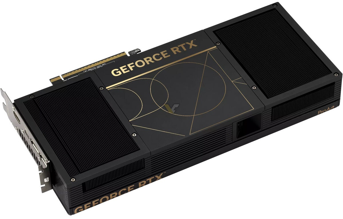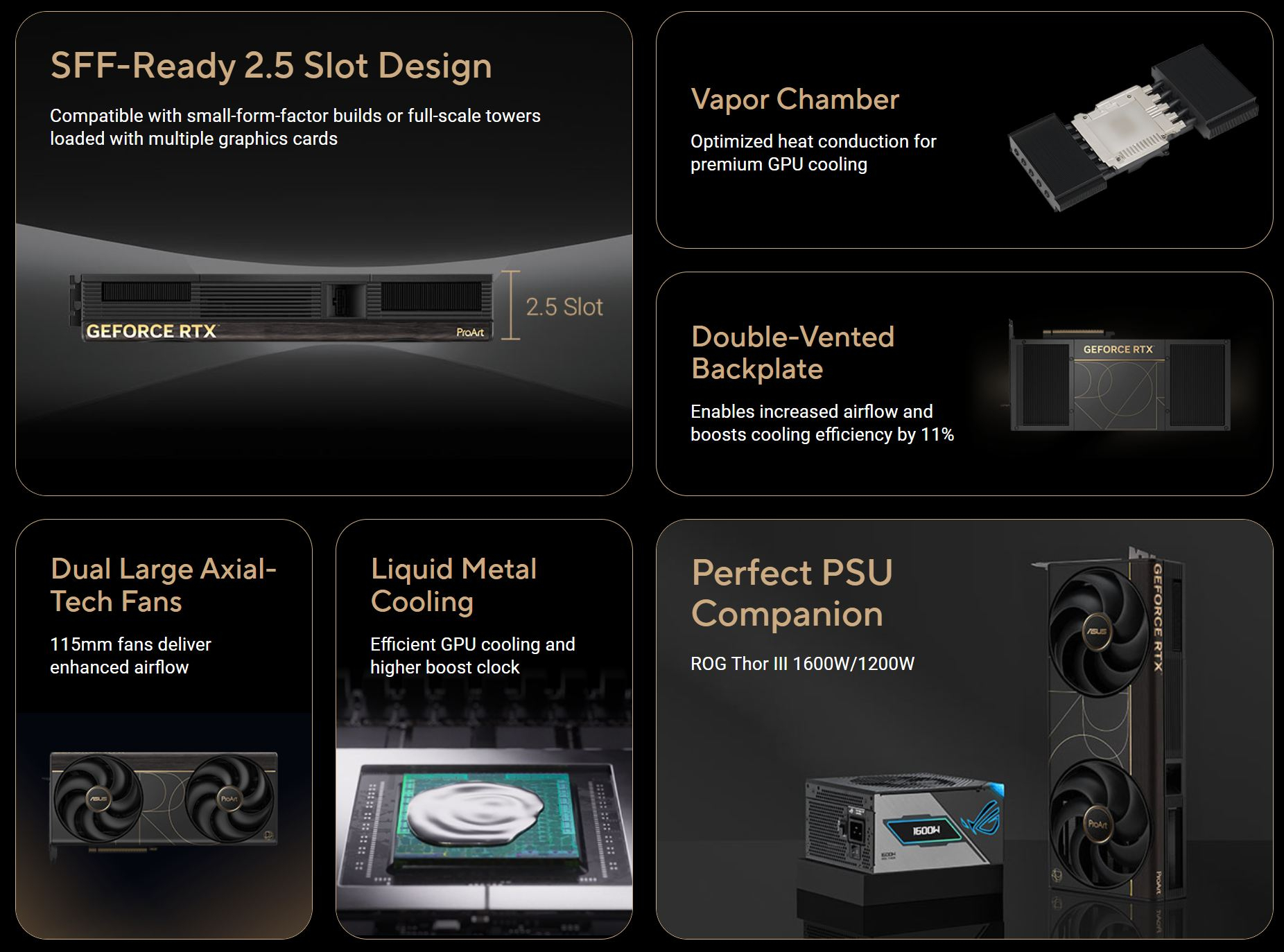 В основе ProArt RTX 5090 используется печатная плата в стиле PCB эталонной модели RTX 5090 Founders Edition от Nvidia. Карта оснащена так называемой сквозной системой охлаждения. Она получила два больших вентилятора диаметром 115 мм, которые прогоняют воздух через радиатор и выталкивают его с обратной стороны через два крупных отверстия. Производитель также применяет в составе системы охлаждения испарительную камеру и жидкий металл в качестве термоинтерфейса для GPU. В отличие от модели Founders Edition версия ProArt дополнительно оснащена видеовыходом USB Type-C.