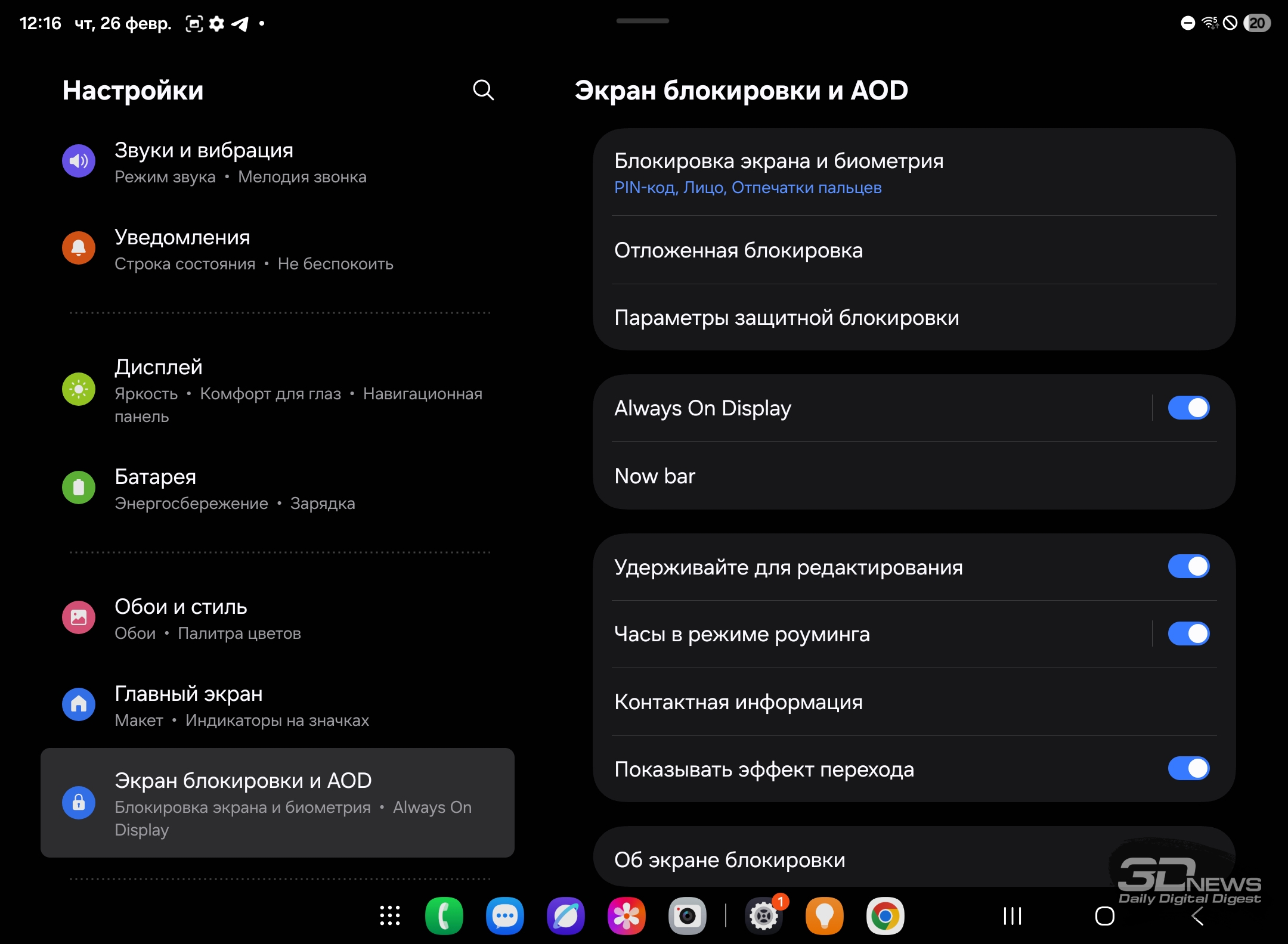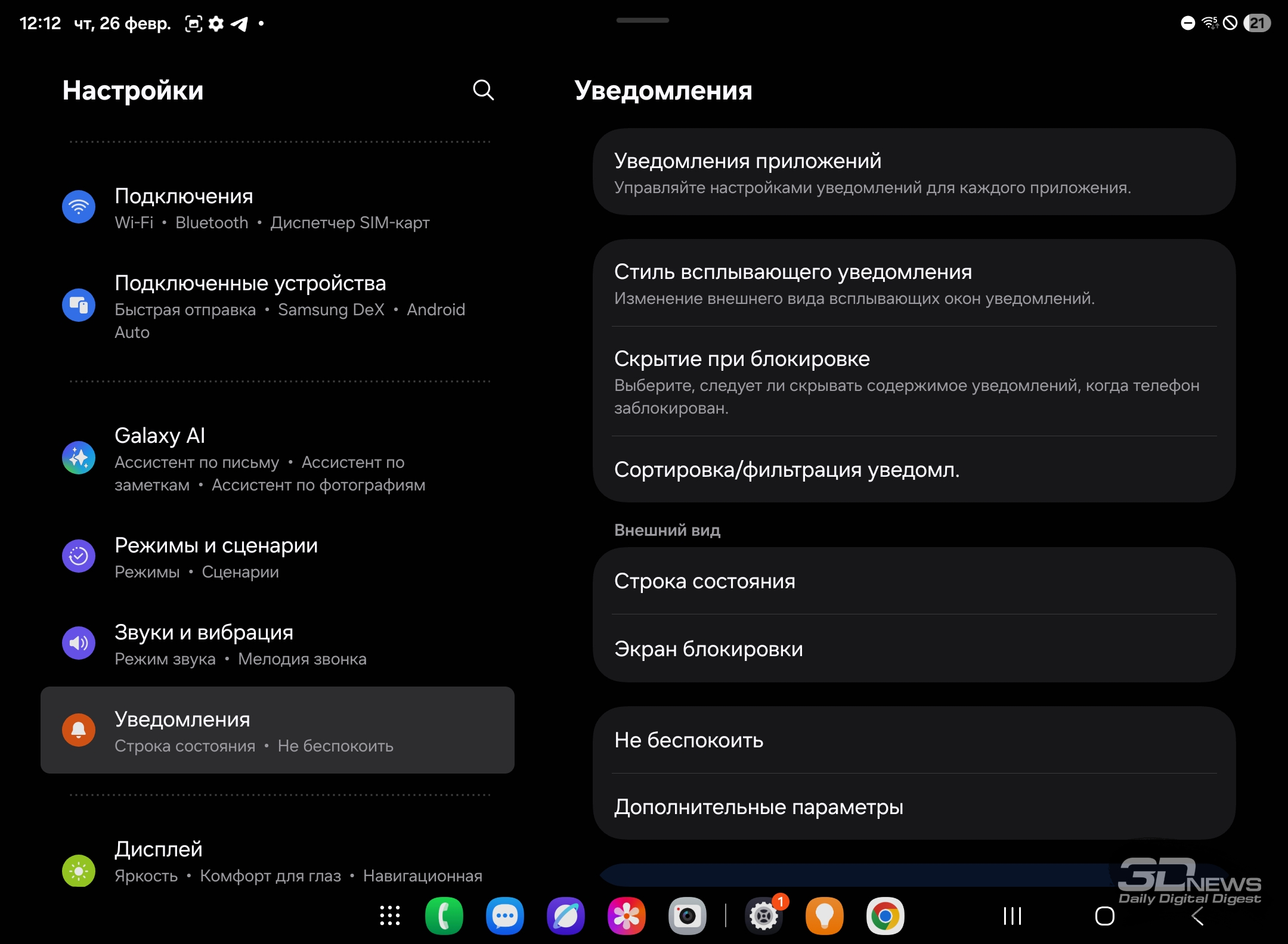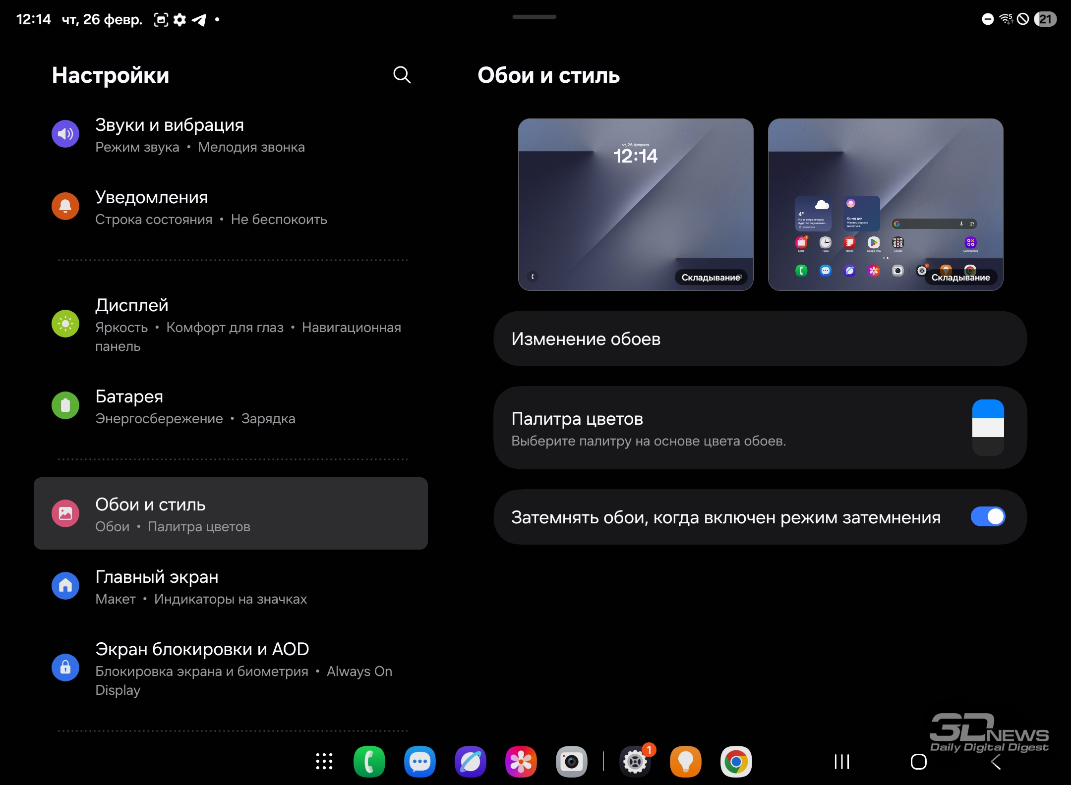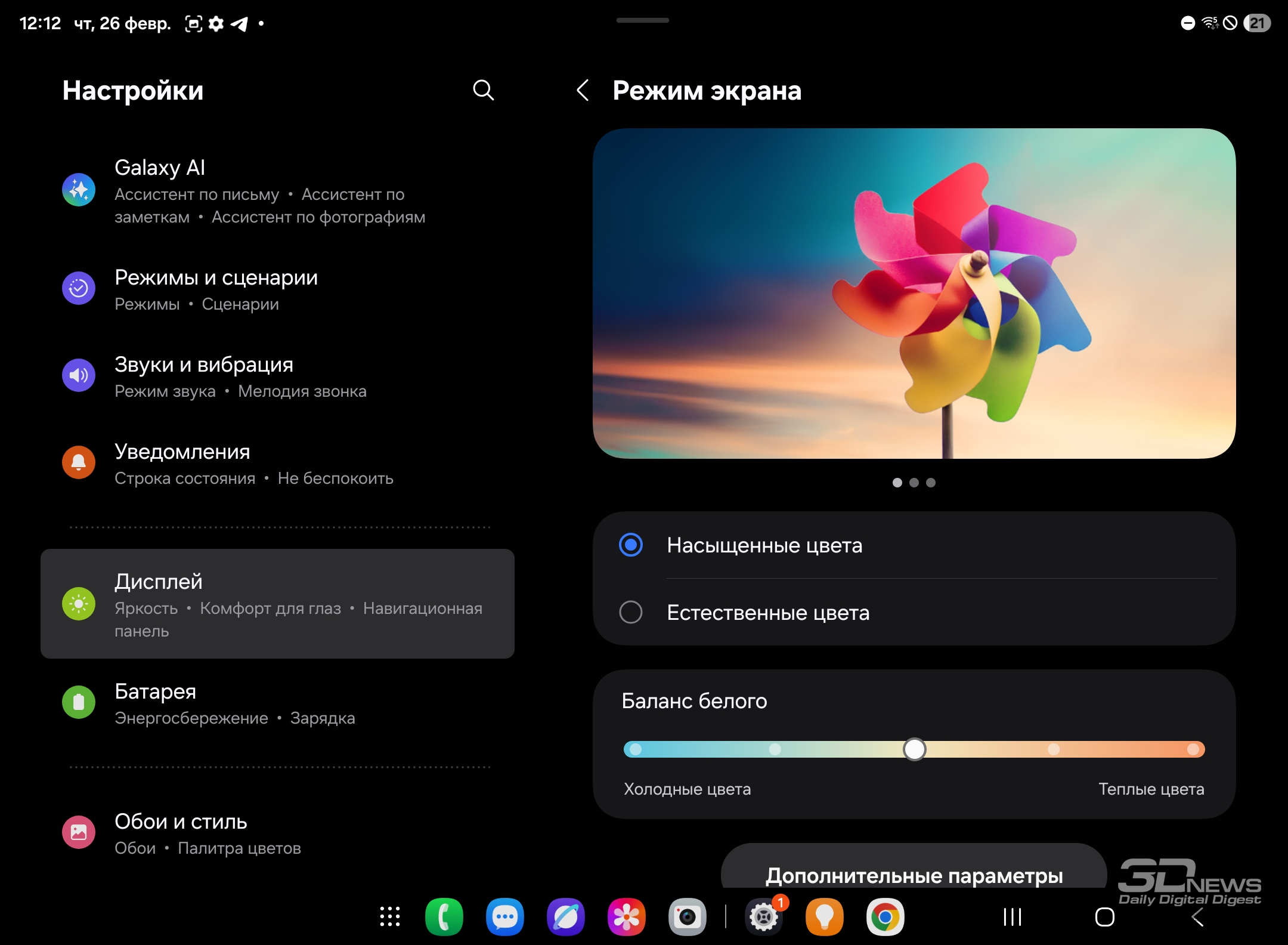 Также, само собой, доступны и базовые нейроинструменты Google – Gemini и «Круг для поиска». Для сканирования отпечатков используется сенсор, встроенный в боковую клавишу питания, как и на всех складных смартфонах. Там стоит традиционный емкостный сенсор, он работает, как обычно у Samsung, так себе — ложных срабатываний в кармане не происходит, по скорости вопросов нет, но процент успешных срабатываний недостаточно высокий. В качестве дополнительной системы идентификации пользователя применяется система распознавания лица, которая работает как с внешней камерой, так и с внутренней. ⇡#Дисплей и звукВ Samsung Galaxy Z TriFold установлено два дисплея — один взят без изменений с Galaxy Z Fold7, другой — новый для компании. Хотя сама по себе панель тоже знакома нам, конечно. Внешний дисплей: LTPO Dynamic AMOLED 2X, 6,5 дюйма, разрешение 2520 × 1080 точек, плотность пикселей — 422 ppi. Формат — 21:9. Да, дисплей узкий, как и у Galaxy Z Fold7, но в данном случае это исключительно благо: полностью опыт взаимодействия как с традиционным смартфоном не повторяется, но благодаря такому формату очень толстый гаджет хоть сколько-нибудь удобно держать в руке. Поддерживается частота обновления в 120 Гц (причем с технологией LTPO, благодаря которой эта частота меняется гибко в диапазоне от 1 Гц до 120 Гц), есть сертификация HDR10+. Внутренний дисплей получил классический формат — хотел написать «традиционный для планшетов», но нет, все же там привычнее соотношение сторон 3:2. Здесь же мы видим формат 4:3. В любом случае проблем это не вызывает, взаимодействие «планшетное», привыкать к «странному» экрану, как у обычных складных смартфонов, не надо. Применена панель LTPO Dynamic AMOLED 2X. Диагональ – 10 дюймов, разрешение – 2160 × 1584 точки, плотность пикселей – 269 ppi. Показатель невыдающийся, прямо скажем, у HUAWEI Mate XT плотность пикселей приближена к стандарту для смартфонов — 381 ppi. Не могу сказать, что пикселизация прямо бросается в глаза, но картинка относительно рыхлая — это заметно. Зато частота обновления здесь выше, чем у единственного конкурента, — 120 Гц. И да, тут тоже LTPO-матрица. Внешний экран прикрыт традиционным закаленным стеклом, внутренний – полимерным материалом с пленкой, которую нельзя отклеивать. Причем пленка не заведена под бортики, они тут и выступают над корпусом не слишком сильно. Так что соблазн снять ее возникает, но так делать не надо! Есть режим Always-On Display, причем он доступен как для внешнего экрана, так и для внутреннего и настраивается для каждого отдельно, можно выбирать для них разные изображения и шаблоны отображения. Статическая яркость, измеренная нами вручную (при искусственном свете ламп накаливания, с отключенной автояркостью, но с активированным параметром «повышенная яркость»), для внутреннего дисплея составила 732 кд/м2, внешнего — 768 кд/м2. Да, внешний дисплей условно менее яркий, но это погрешности измерений, по факту оба экрана проявляют себя одинаково. Хотя пиковая яркость заявлена более высокой у экрана внешнего — 2600 кд/м2 (для внутреннего — 1600 кд/м2). Но на солнце пользоваться смартфоном, во-первых, придется, скорее всего, только с внешним экраном. Во-вторых, в сравнении с планшетами уровень яркости в любом случае намного выше. Набор настроек экрана не поменялся. Интерфейс можно настраивать очень подробно, есть возможность менять шрифты, выбрать частоту дисплея (или фиксированную на 60 Гц, 
