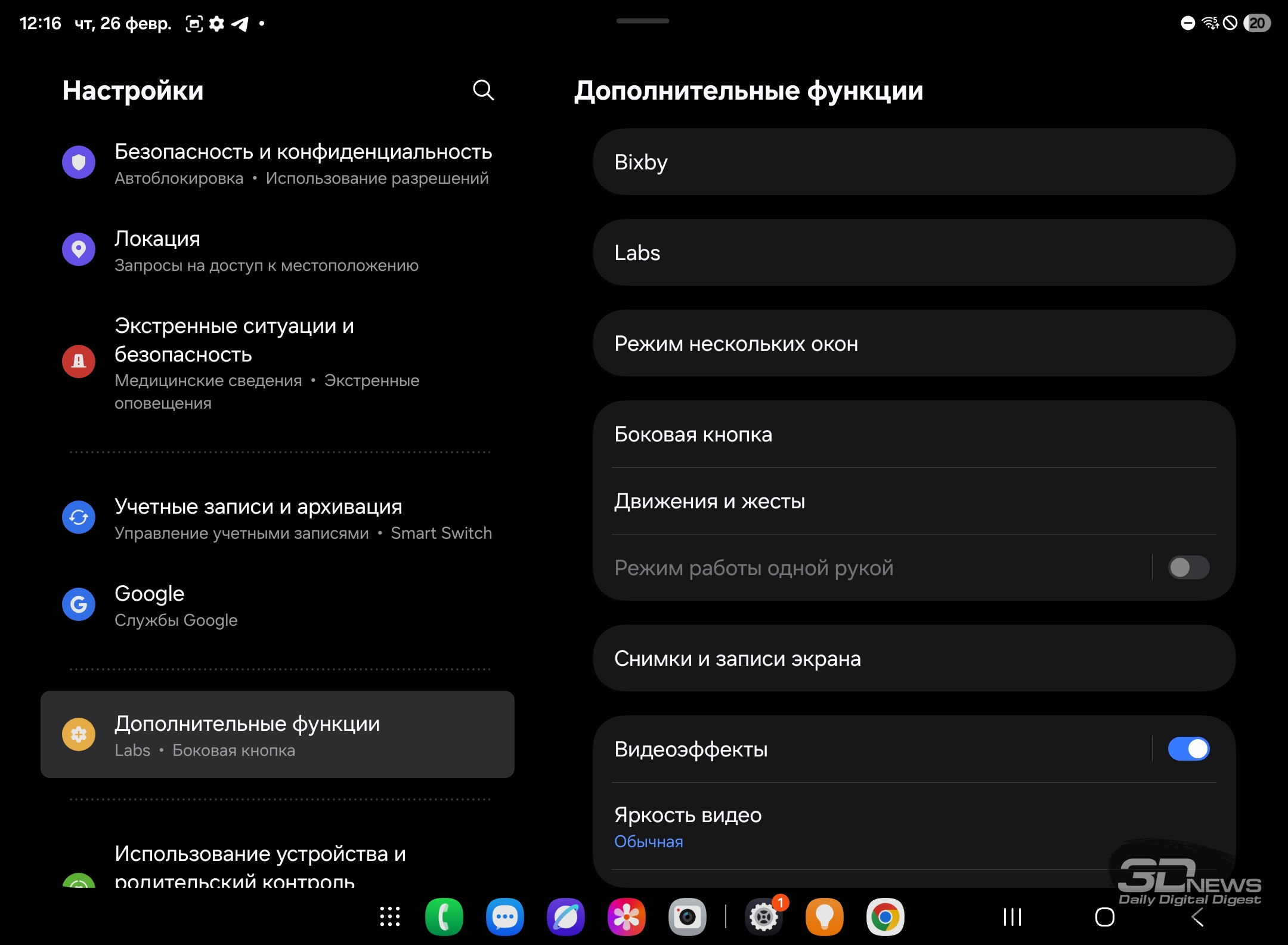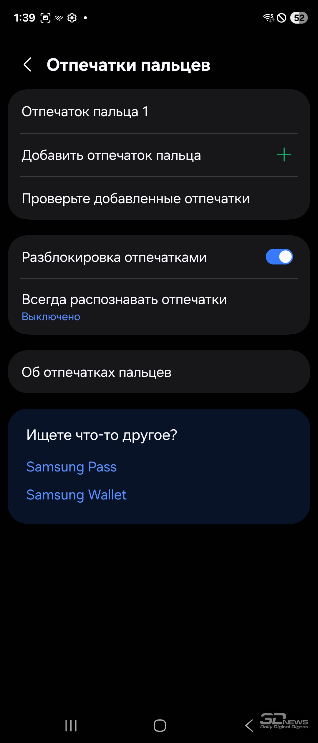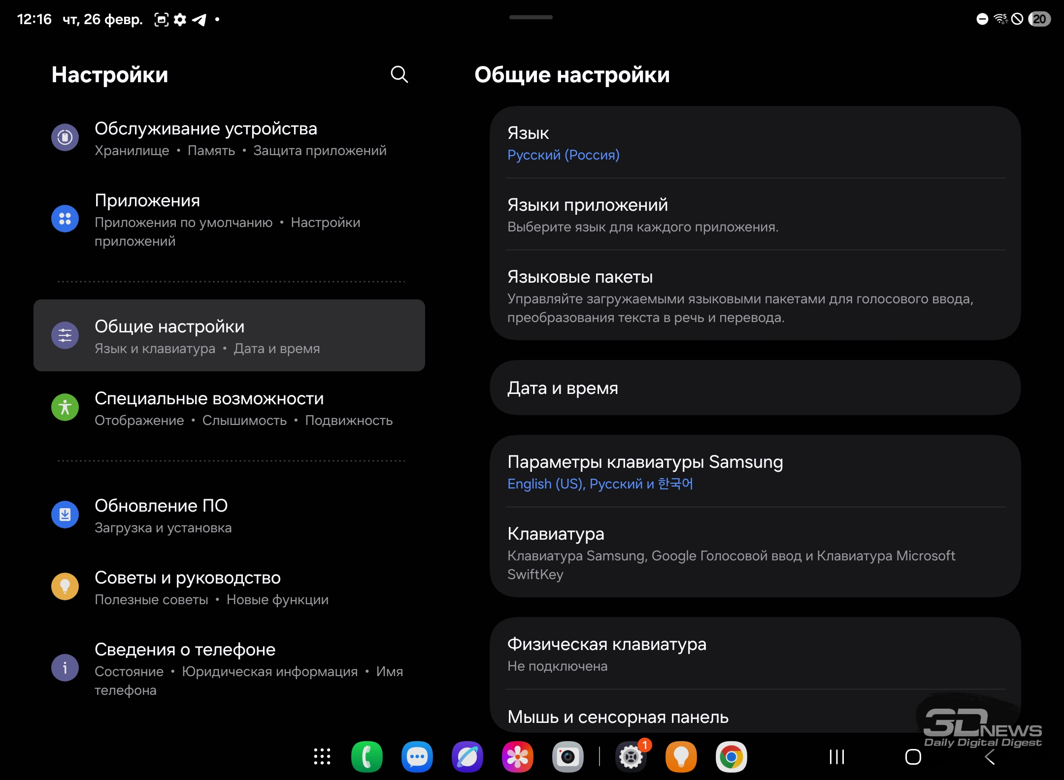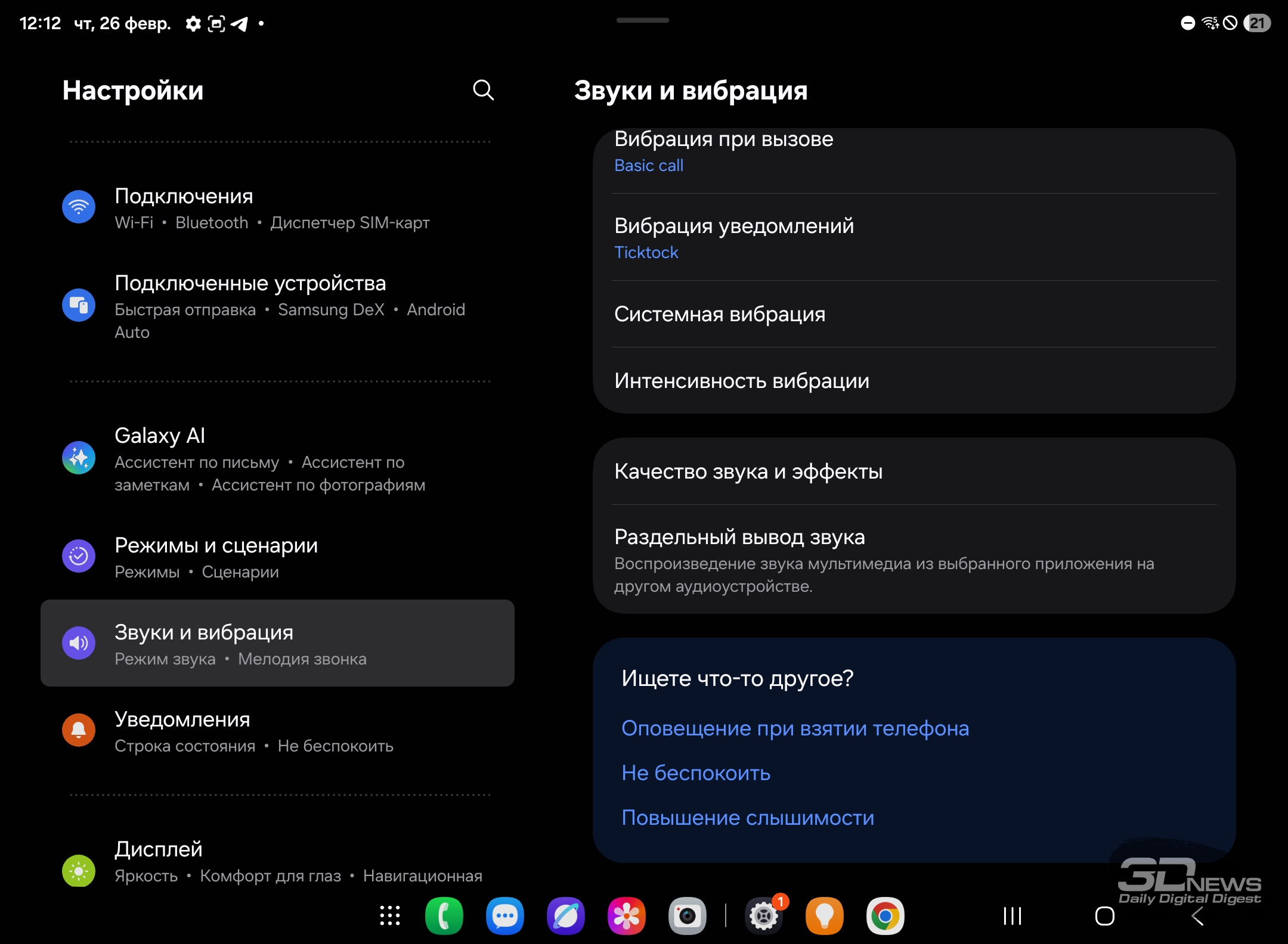 Также, само собой, доступны и базовые нейроинструменты Google – Gemini и «Круг для поиска». Для сканирования отпечатков используется сенсор, встроенный в боковую клавишу питания, как и на всех складных смартфонах. Там стоит традиционный емкостный сенсор, он работает, как обычно у Samsung, так себе — ложных срабатываний в кармане не происходит, по скорости вопросов нет, но процент успешных срабатываний недостаточно высокий. В качестве дополнительной системы идентификации пользователя применяется система распознавания лица, которая работает как с внешней камерой, так и с внутренней. ⇡#Дисплей и звукВ Samsung Galaxy Z TriFold установлено два дисплея — один взят без изменений с Galaxy Z Fold7, другой — новый для компании. Хотя сама по себе панель тоже знакома нам, конечно. Внешний дисплей: LTPO Dynamic AMOLED 2X, 6,5 дюйма, разрешение 2520 × 1080 точек, плотность пикселей — 422 ppi. Формат — 21:9. Да, дисплей узкий, как и у Galaxy Z Fold7, но в данном случае это исключительно благо: полностью опыт взаимодействия как с традиционным смартфоном не повторяется, но благодаря такому формату очень толстый гаджет хоть сколько-нибудь удобно держать в руке. Поддерживается частота обновления в 120 Гц (причем с технологией LTPO, благодаря которой эта частота меняется гибко в диапазоне от 1 Гц до 120 Гц), есть сертификация HDR10+. Внутренний дисплей получил классический формат — хотел написать «традиционный для планшетов», но нет, все же там привычнее соотношение сторон 3:2. Здесь же мы видим формат 4:3. В любом случае проблем это не вызывает, взаимодействие «планшетное», привыкать к «странному» экрану, как у обычных складных смартфонов, не надо. Применена панель LTPO Dynamic AMOLED 2X. Диагональ – 10 дюймов, разрешение – 2160 × 1584 точки, плотность пикселей – 269 ppi. Показатель невыдающийся, прямо скажем, у HUAWEI Mate XT плотность пикселей приближена к стандарту для смартфонов — 381 ppi. Не могу сказать, что пикселизация прямо бросается в глаза, но картинка относительно рыхлая — это заметно. Зато частота обновления здесь выше, чем у единственного конкурента, — 120 Гц. И да, тут тоже LTPO-матрица. Внешний экран прикрыт традиционным закаленным стеклом, внутренний – полимерным материалом с пленкой, которую нельзя отклеивать. Причем пленка не заведена под бортики, они тут и выступают над корпусом не слишком сильно. Так что соблазн снять ее возникает, но так делать не надо! Есть режим Always-On Display, причем он доступен как для внешнего экрана, так и для внутреннего и настраивается для каждого отдельно, можно выбирать для них разные изображения и шаблоны отображения. Статическая яркость, измеренная нами вручную (при искусственном свете ламп накаливания, с отключенной автояркостью, но с активированным параметром «повышенная яркость»), для внутреннего дисплея составила 732 кд/м2, внешнего — 768 кд/м2. Да, внешний дисплей условно менее яркий, но это погрешности измерений, по факту оба экрана проявляют себя одинаково. Хотя пиковая яркость заявлена более высокой у экрана внешнего — 2600 кд/м2 (для внутреннего — 1600 кд/м2). Но на солнце пользоваться смартфоном, во-первых, придется, скорее всего, только с внешним экраном. Во-вторых, в сравнении с планшетами уровень яркости в любом случае намного выше. Набор настроек экрана не поменялся. Интерфейс можно настраивать очень подробно, есть возможность менять шрифты, выбрать частоту дисплея (или фиксированную на 60 Гц, 