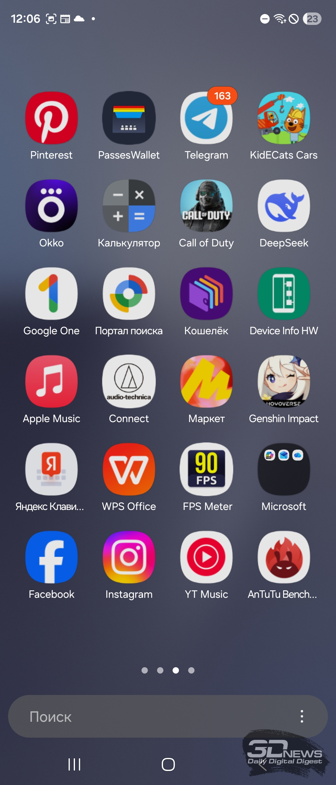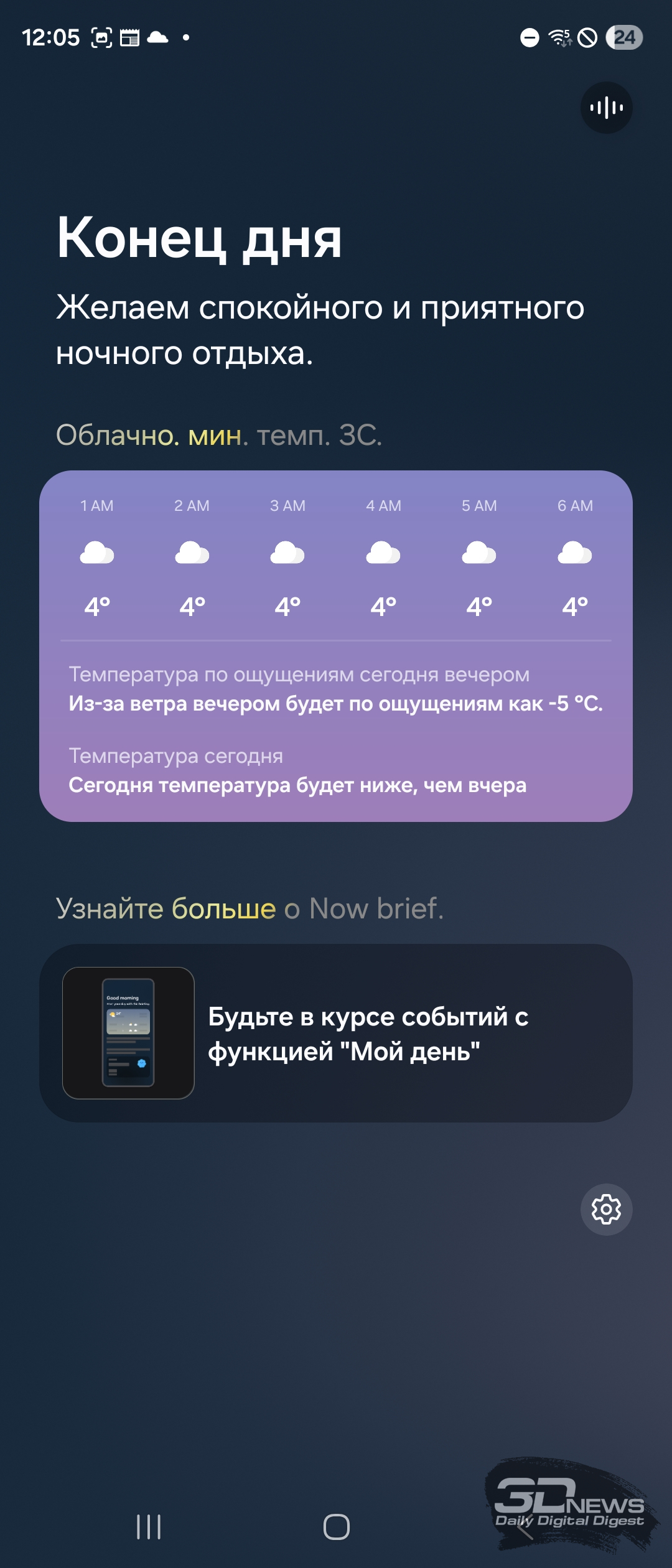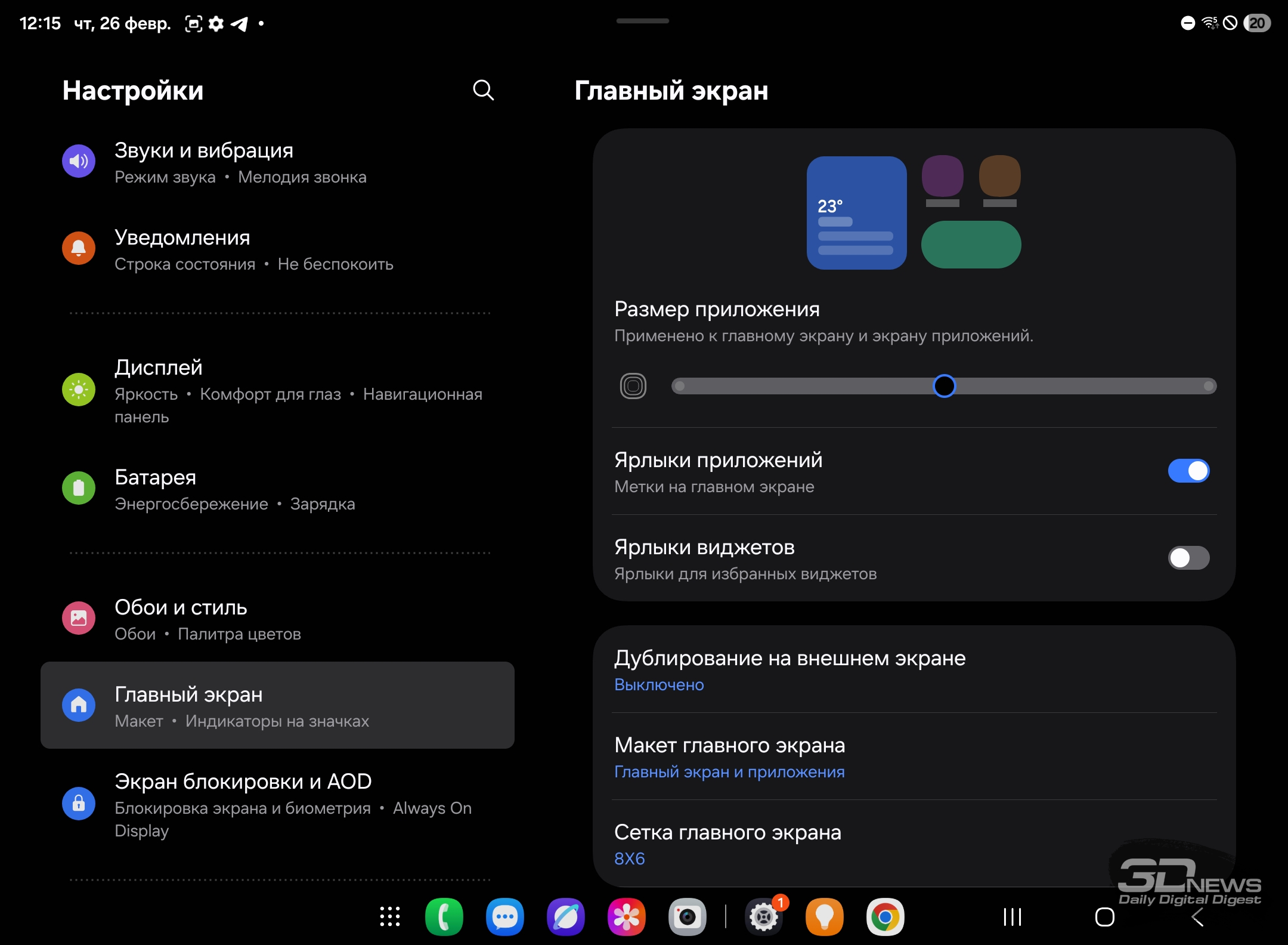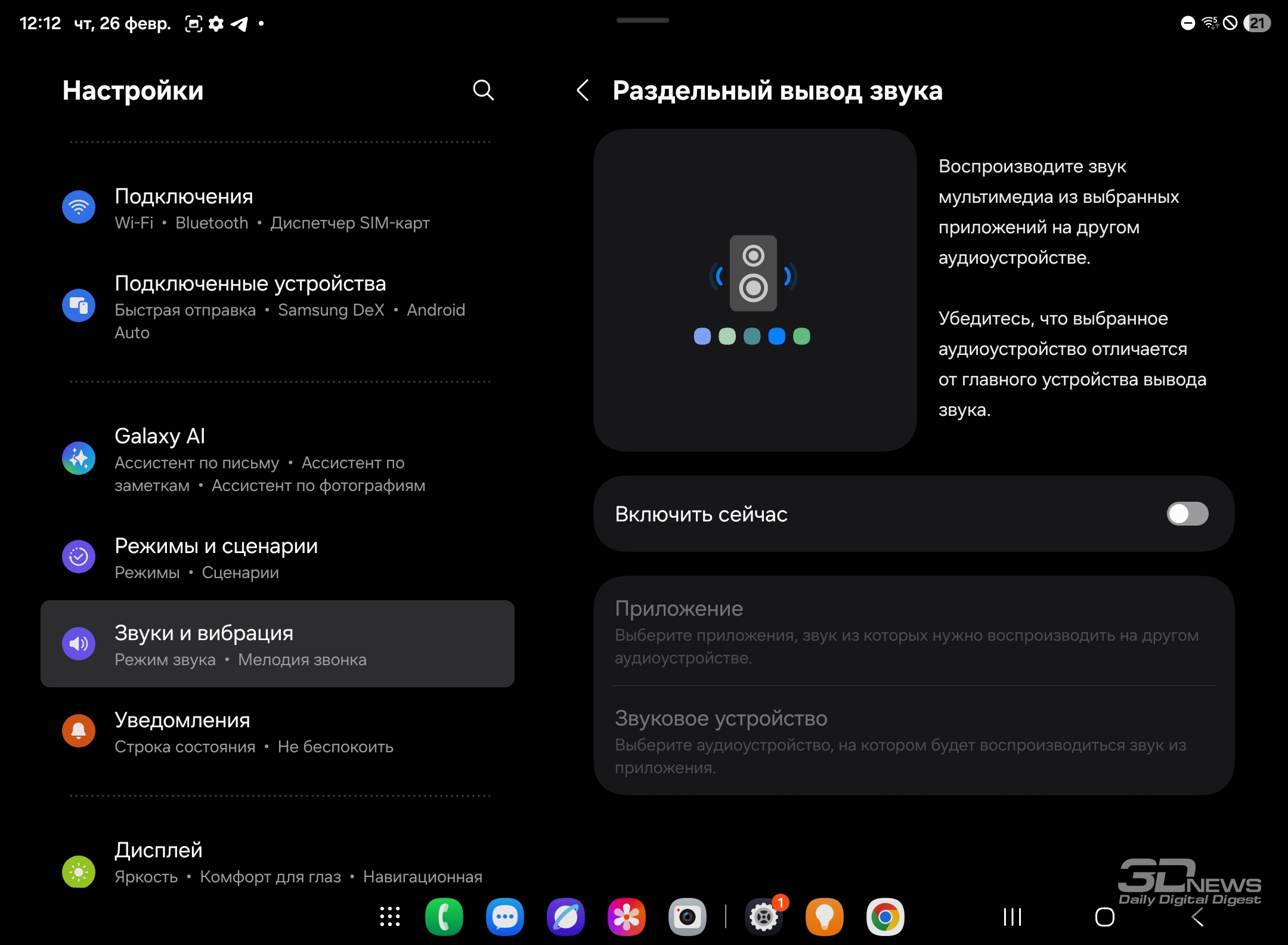 Также, само собой, доступны и базовые нейроинструменты Google – Gemini и «Круг для поиска». Для сканирования отпечатков используется сенсор, встроенный в боковую клавишу питания, как и на всех складных смартфонах. Там стоит традиционный емкостный сенсор, он работает, как обычно у Samsung, так себе — ложных срабатываний в кармане не происходит, по скорости вопросов нет, но процент успешных срабатываний недостаточно высокий. В качестве дополнительной системы идентификации пользователя применяется система распознавания лица, которая работает как с внешней камерой, так и с внутренней. ⇡#Дисплей и звукВ Samsung Galaxy Z TriFold установлено два дисплея — один взят без изменений с Galaxy Z Fold7, другой — новый для компании. Хотя сама по себе панель тоже знакома нам, конечно. Внешний дисплей: LTPO Dynamic AMOLED 2X, 6,5 дюйма, разрешение 2520 × 1080 точек, плотность пикселей — 422 ppi. Формат — 21:9. Да, дисплей узкий, как и у Galaxy Z Fold7, но в данном случае это исключительно благо: полностью опыт взаимодействия как с традиционным смартфоном не повторяется, но благодаря такому формату очень толстый гаджет хоть сколько-нибудь удобно держать в руке. Поддерживается частота обновления в 120 Гц (причем с технологией LTPO, благодаря которой эта частота меняется гибко в диапазоне от 1 Гц до 120 Гц), есть сертификация HDR10+. Внутренний дисплей получил классический формат — хотел написать «традиционный для планшетов», но нет, все же там привычнее соотношение сторон 3:2. Здесь же мы видим формат 4:3. В любом случае проблем это не вызывает, взаимодействие «планшетное», привыкать к «странному» экрану, как у обычных складных смартфонов, не надо. Применена панель LTPO Dynamic AMOLED 2X. Диагональ – 10 дюймов, разрешение – 2160 × 1584 точки, плотность пикселей – 269 ppi. Показатель невыдающийся, прямо скажем, у HUAWEI Mate XT плотность пикселей приближена к стандарту для смартфонов — 381 ppi. Не могу сказать, что пикселизация прямо бросается в глаза, но картинка относительно рыхлая — это заметно. Зато частота обновления здесь выше, чем у единственного конкурента, — 120 Гц. И да, тут тоже LTPO-матрица. Внешний экран прикрыт традиционным закаленным стеклом, внутренний – полимерным материалом с пленкой, которую нельзя отклеивать. Причем пленка не заведена под бортики, они тут и выступают над корпусом не слишком сильно. Так что соблазн снять ее возникает, но так делать не надо! Есть режим Always-On Display, причем он доступен как для внешнего экрана, так и для внутреннего и настраивается для каждого отдельно, можно выбирать для них разные изображения и шаблоны отображения. Статическая яркость, измеренная нами вручную (при искусственном свете ламп накаливания, с отключенной автояркостью, но с активированным параметром «повышенная яркость»), для внутреннего дисплея составила 732 кд/м2, внешнего — 768 кд/м2. Да, внешний дисплей условно менее яркий, но это погрешности измерений, по факту оба экрана проявляют себя одинаково. Хотя пиковая яркость заявлена более высокой у экрана внешнего — 2600 кд/м2 (для внутреннего — 1600 кд/м2). Но на солнце пользоваться смартфоном, во-первых, придется, скорее всего, только с внешним экраном. Во-вторых, в сравнении с планшетами уровень яркости в любом случае намного выше. Набор настроек экрана не поменялся. Интерфейс можно настраивать очень подробно, есть возможность менять шрифты, выбрать частоту дисплея (или фиксированную на 60 Гц, 