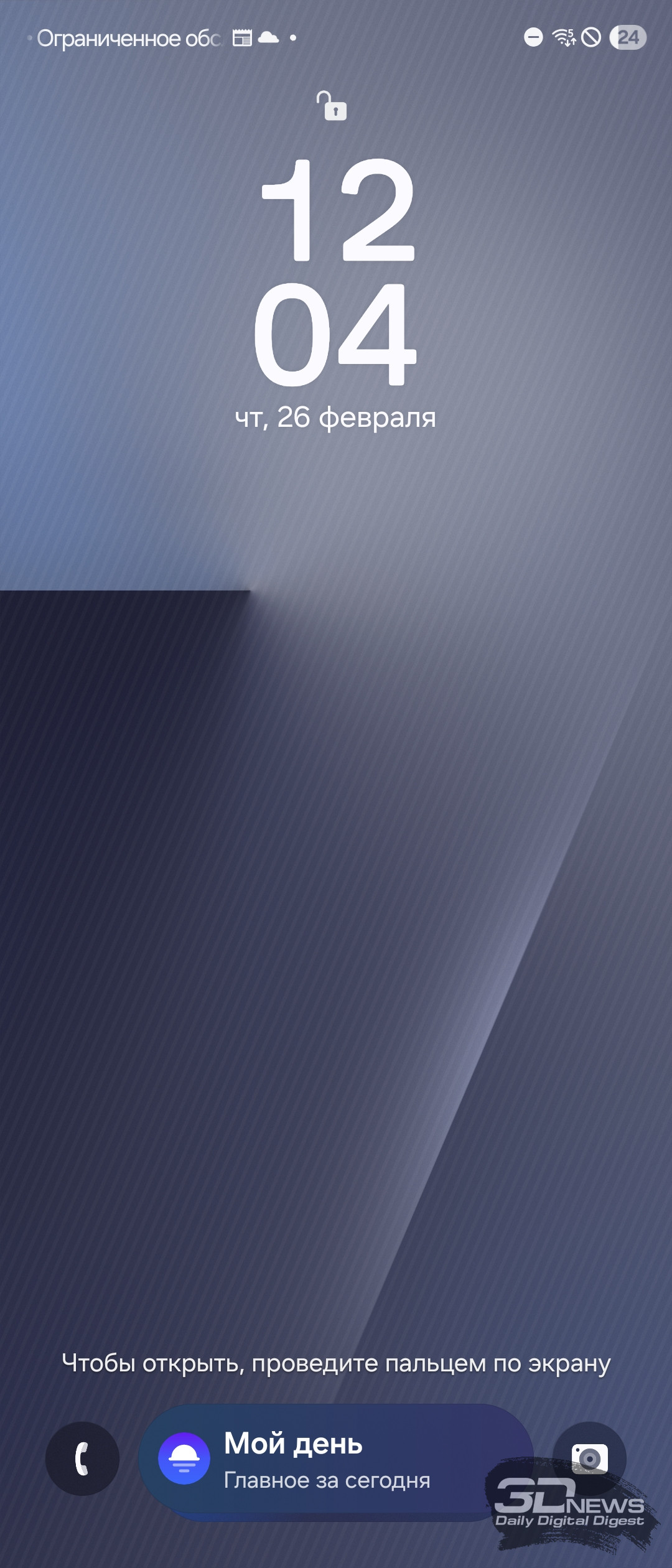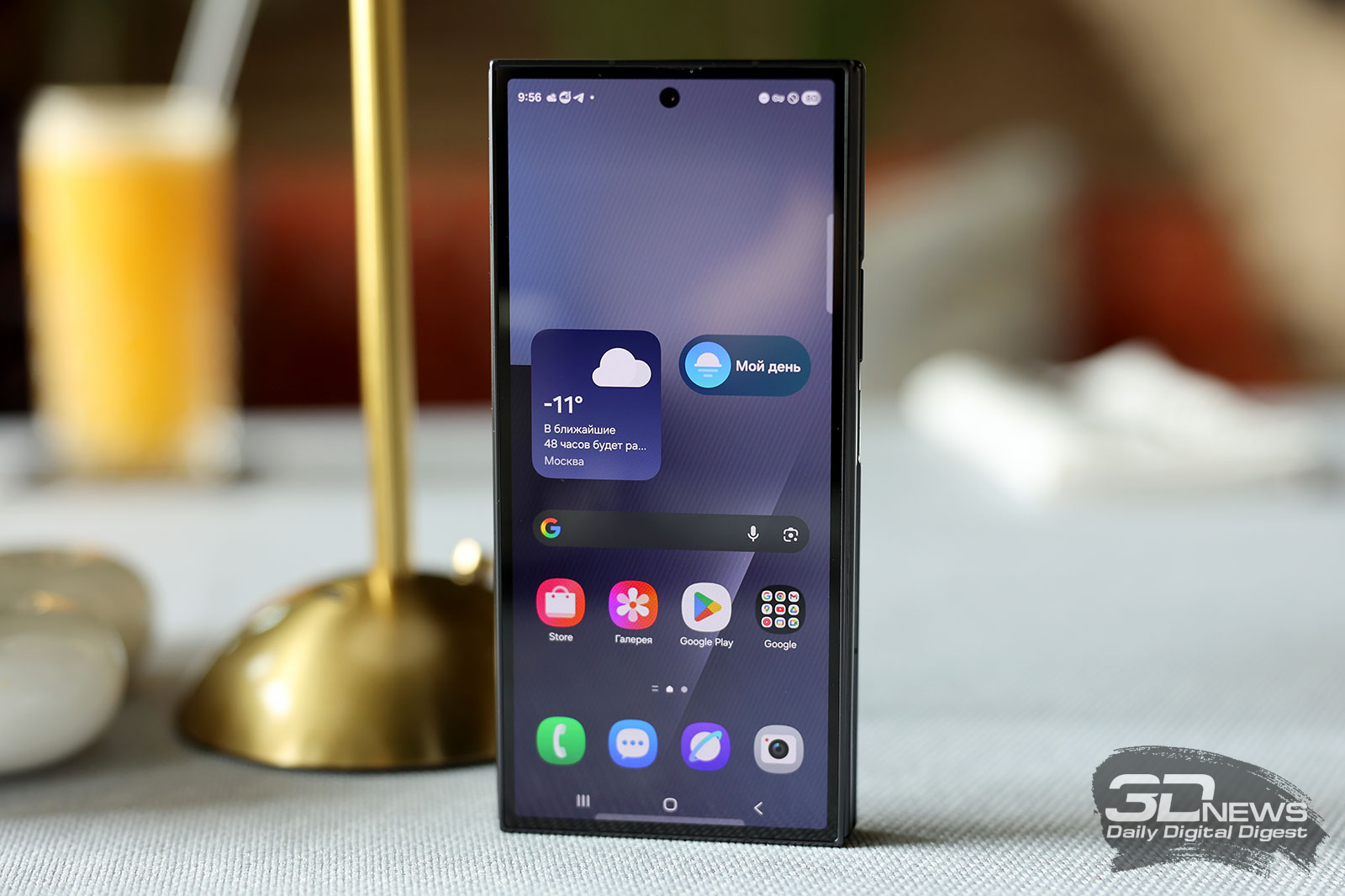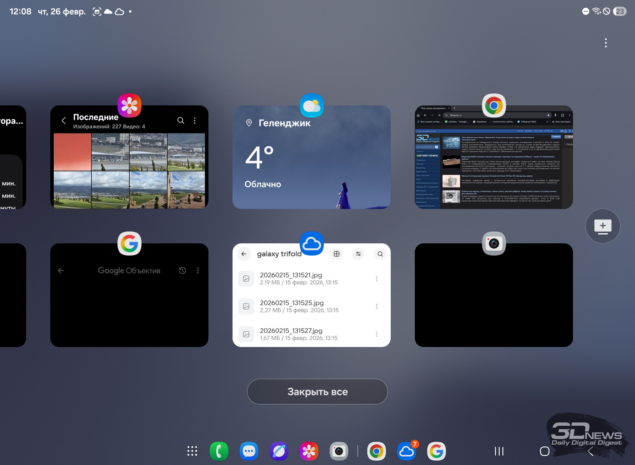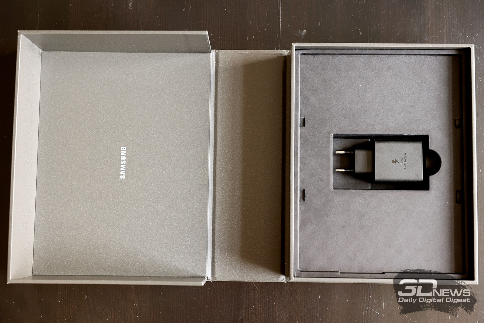 Samsung Galaxy Z TriFold, нижние грани в сложенном состоянии: второй динамик, микрофон и порт USB Type-C Шарниры давно уже не вызывают вопросов, это не слабое место подобных устройств, в отличие от экранов, все еще чувствительных к попаданию на них соринок. Появляются и исключения, вроде Google Pixel 10 Pro Fold с классом пыле- и влагозащиты IP68, но здесь речь идет о базовой защите IP48. То есть воды всерьез гаджет не боится, но на пляже пользоваться TriFold надо с предельной осторожностью. Однако при этом корпус должен быть весьма прочным — он усилен титаном и снабжен дополнительной алюминиевой рамой. Внешний экран прикрыт закаленным стеклом последнего поколения Corning Gorilla Glass Ceramic 2. Также с осторожностью надо складывать смартфон — движение для этого не самое очевидное из-за выбранной схемы с наружным и внутренним экраном. Постоянно хочется сложить его «рулоном» справа налево, а надо сначала закрыть левую створку, и лишь затем прикрыть ее правой. Случайное применение силы фатально, а замена экрана тут стоит как новый Samsung Galaxy S26 Ultra. Благо при попытке закрыть TriFold неправильно он начинает вибрировать и демонстрирует на экране подсказку. Смартфон существует — невиданное дело — только в одном цветовом исполнении, иссиня-черном. Никакого веселья — как и подобает премиальному товару, он излучает солидность. Солидна и комплектация. В здоровенной коробке помимо смартфона и документации есть не только чехол, но и — барабанная дробь — зарядное устройство с кабелем питания! Невероятно, но факт — думаю, минимум сто тысяч из запрошенных четырехсот ушли именно на этот уникальный для Samsung элемент комплекта. Чехол, к слову, — это пластиковая крышка для задней (в сложенном состоянии гаджета) панели смартфона с гибкой боковиной, прикрывающей шарнир. ⇡#Программное обеспечениеSamsung Galaxy Z TriFold работает на базе операционной системы Android 16 с оболочкой OneUI 8.0. Оболочка Samsung Galaxy Z TriFold на внешнем экране