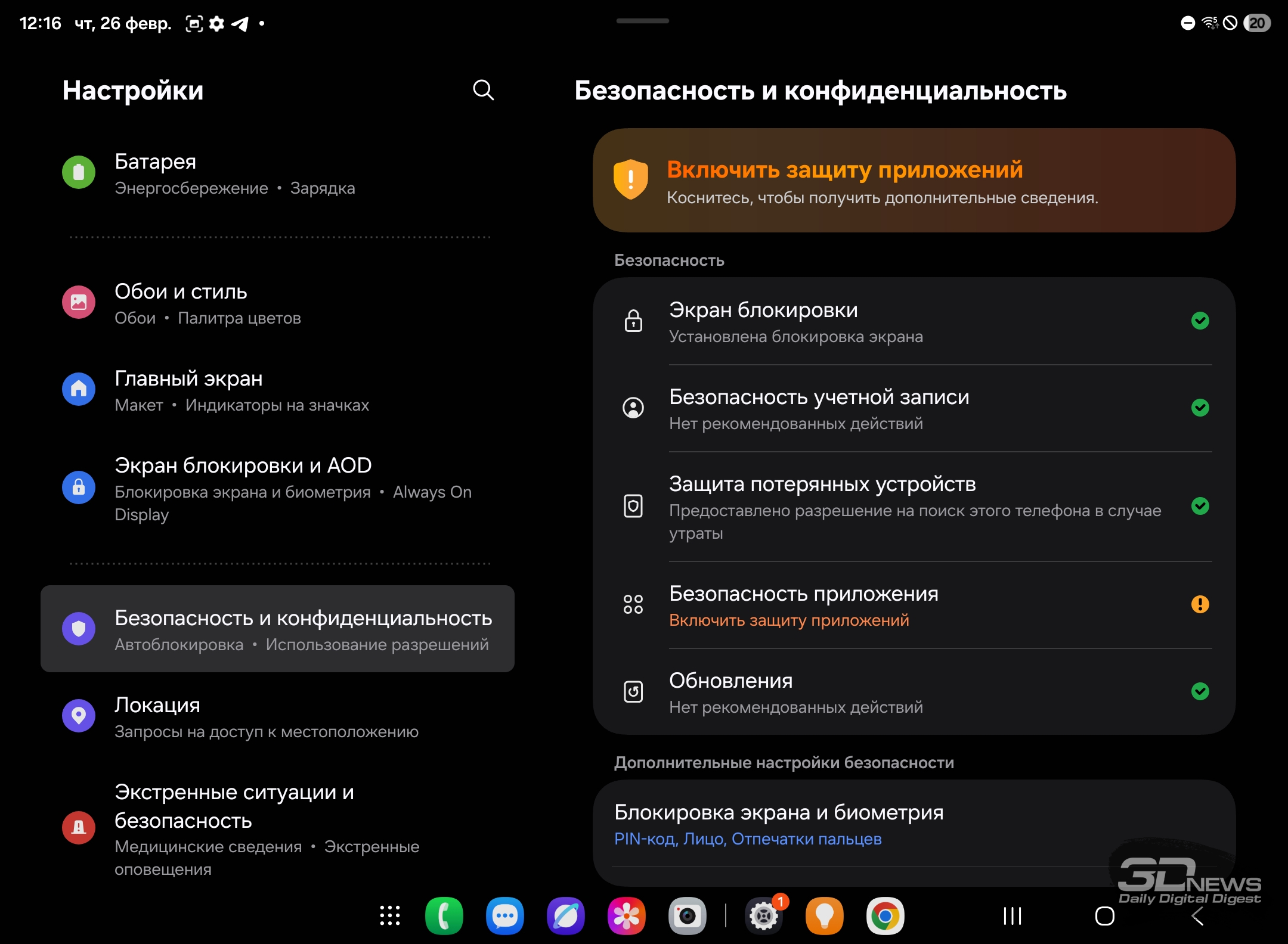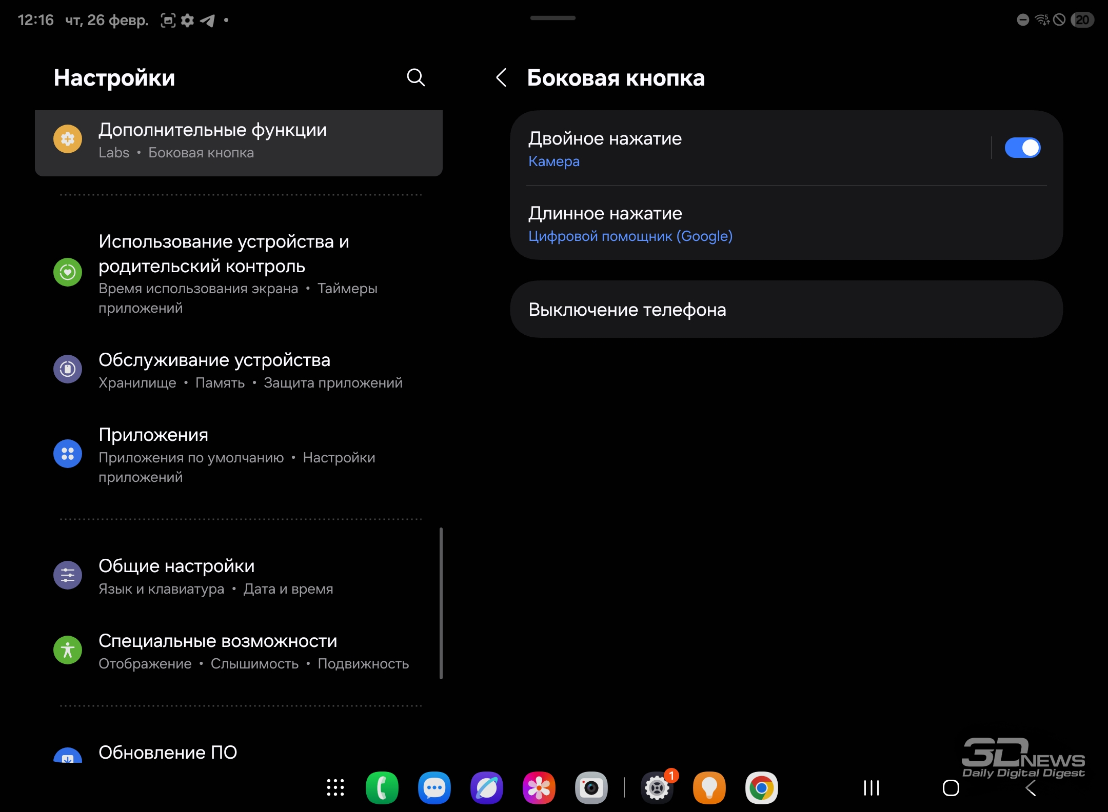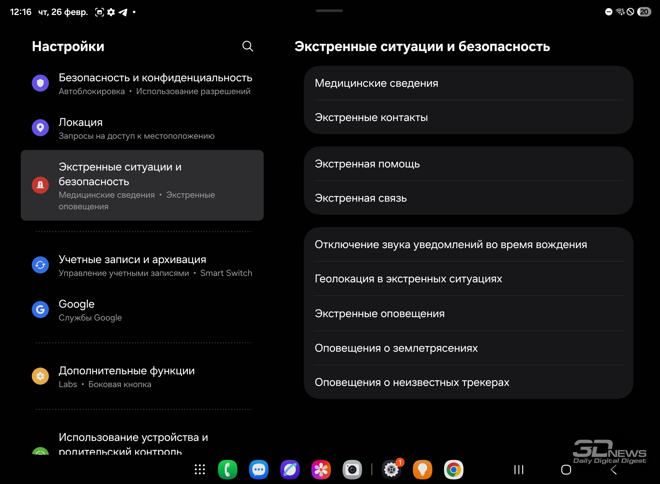 Samsung Galaxy Z TriFold, нижние грани в сложенном состоянии: второй динамик, микрофон и порт USB Type-C Шарниры давно уже не вызывают вопросов, это не слабое место подобных устройств, в отличие от экранов, все еще чувствительных к попаданию на них соринок. Появляются и исключения, вроде Google Pixel 10 Pro Fold с классом пыле- и влагозащиты IP68, но здесь речь идет о базовой защите IP48. То есть воды всерьез гаджет не боится, но на пляже пользоваться TriFold надо с предельной осторожностью. Однако при этом корпус должен быть весьма прочным — он усилен титаном и снабжен дополнительной алюминиевой рамой. Внешний экран прикрыт закаленным стеклом последнего поколения Corning Gorilla Glass Ceramic 2. Также с осторожностью надо складывать смартфон — движение для этого не самое очевидное из-за выбранной схемы с наружным и внутренним экраном. Постоянно хочется сложить его «рулоном» справа налево, а надо сначала закрыть левую створку, и лишь затем прикрыть ее правой. Случайное применение силы фатально, а замена экрана тут стоит как новый Samsung Galaxy S26 Ultra. Благо при попытке закрыть TriFold неправильно он начинает вибрировать и демонстрирует на экране подсказку. Смартфон существует — невиданное дело — только в одном цветовом исполнении, иссиня-черном. Никакого веселья — как и подобает премиальному товару, он излучает солидность. Солидна и комплектация. В здоровенной коробке помимо смартфона и документации есть не только чехол, но и — барабанная дробь — зарядное устройство с кабелем питания! Невероятно, но факт — думаю, минимум сто тысяч из запрошенных четырехсот ушли именно на этот уникальный для Samsung элемент комплекта. Чехол, к слову, — это пластиковая крышка для задней (в сложенном состоянии гаджета) панели смартфона с гибкой боковиной, прикрывающей шарнир. ⇡#Программное обеспечениеSamsung Galaxy Z TriFold работает на базе операционной системы Android 16 с оболочкой OneUI 8.0. Оболочка Samsung Galaxy Z TriFold на внешнем экране