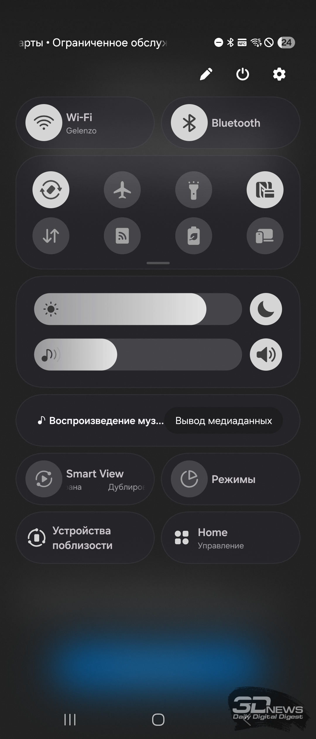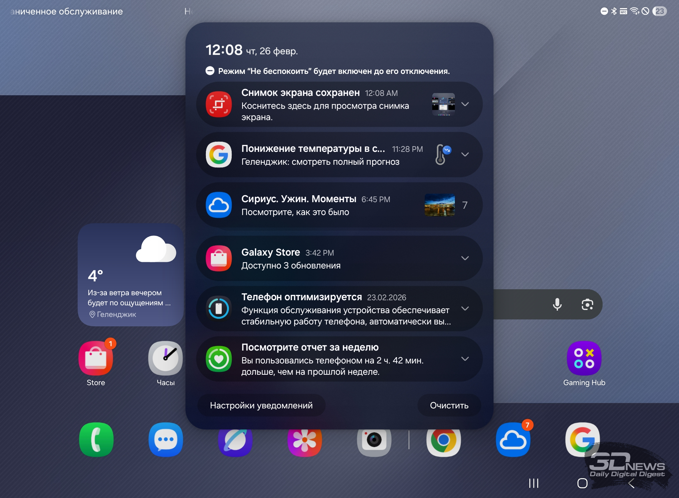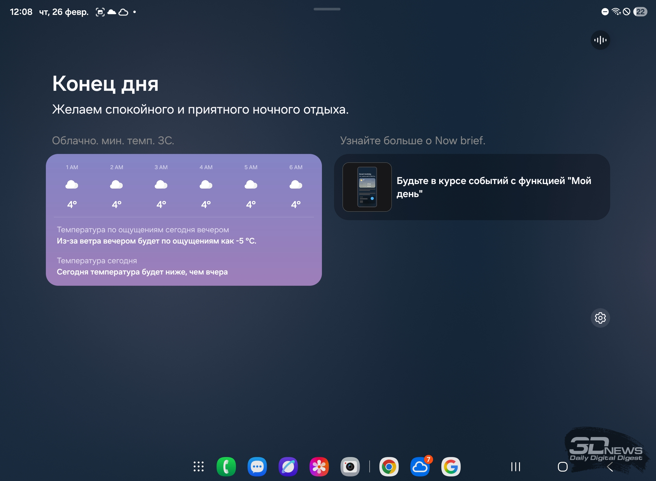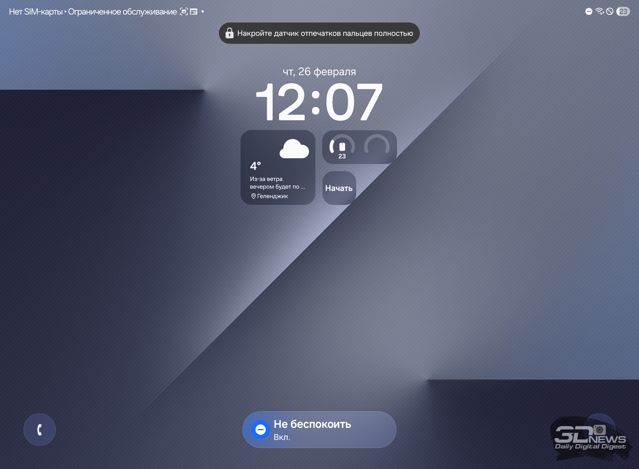 Samsung Galaxy Z TriFold, нижние грани в сложенном состоянии: второй динамик, микрофон и порт USB Type-C Шарниры давно уже не вызывают вопросов, это не слабое место подобных устройств, в отличие от экранов, все еще чувствительных к попаданию на них соринок. Появляются и исключения, вроде Google Pixel 10 Pro Fold с классом пыле- и влагозащиты IP68, но здесь речь идет о базовой защите IP48. То есть воды всерьез гаджет не боится, но на пляже пользоваться TriFold надо с предельной осторожностью. Однако при этом корпус должен быть весьма прочным — он усилен титаном и снабжен дополнительной алюминиевой рамой. Внешний экран прикрыт закаленным стеклом последнего поколения Corning Gorilla Glass Ceramic 2. Также с осторожностью надо складывать смартфон — движение для этого не самое очевидное из-за выбранной схемы с наружным и внутренним экраном. Постоянно хочется сложить его «рулоном» справа налево, а надо сначала закрыть левую створку, и лишь затем прикрыть ее правой. Случайное применение силы фатально, а замена экрана тут стоит как новый Samsung Galaxy S26 Ultra. Благо при попытке закрыть TriFold неправильно он начинает вибрировать и демонстрирует на экране подсказку. Смартфон существует — невиданное дело — только в одном цветовом исполнении, иссиня-черном. Никакого веселья — как и подобает премиальному товару, он излучает солидность. Солидна и комплектация. В здоровенной коробке помимо смартфона и документации есть не только чехол, но и — барабанная дробь — зарядное устройство с кабелем питания! Невероятно, но факт — думаю, минимум сто тысяч из запрошенных четырехсот ушли именно на этот уникальный для Samsung элемент комплекта. Чехол, к слову, — это пластиковая крышка для задней (в сложенном состоянии гаджета) панели смартфона с гибкой боковиной, прикрывающей шарнир. ⇡#Программное обеспечениеSamsung Galaxy Z TriFold работает на базе операционной системы Android 16 с оболочкой OneUI 8.0. Оболочка Samsung Galaxy Z TriFold на внешнем экране