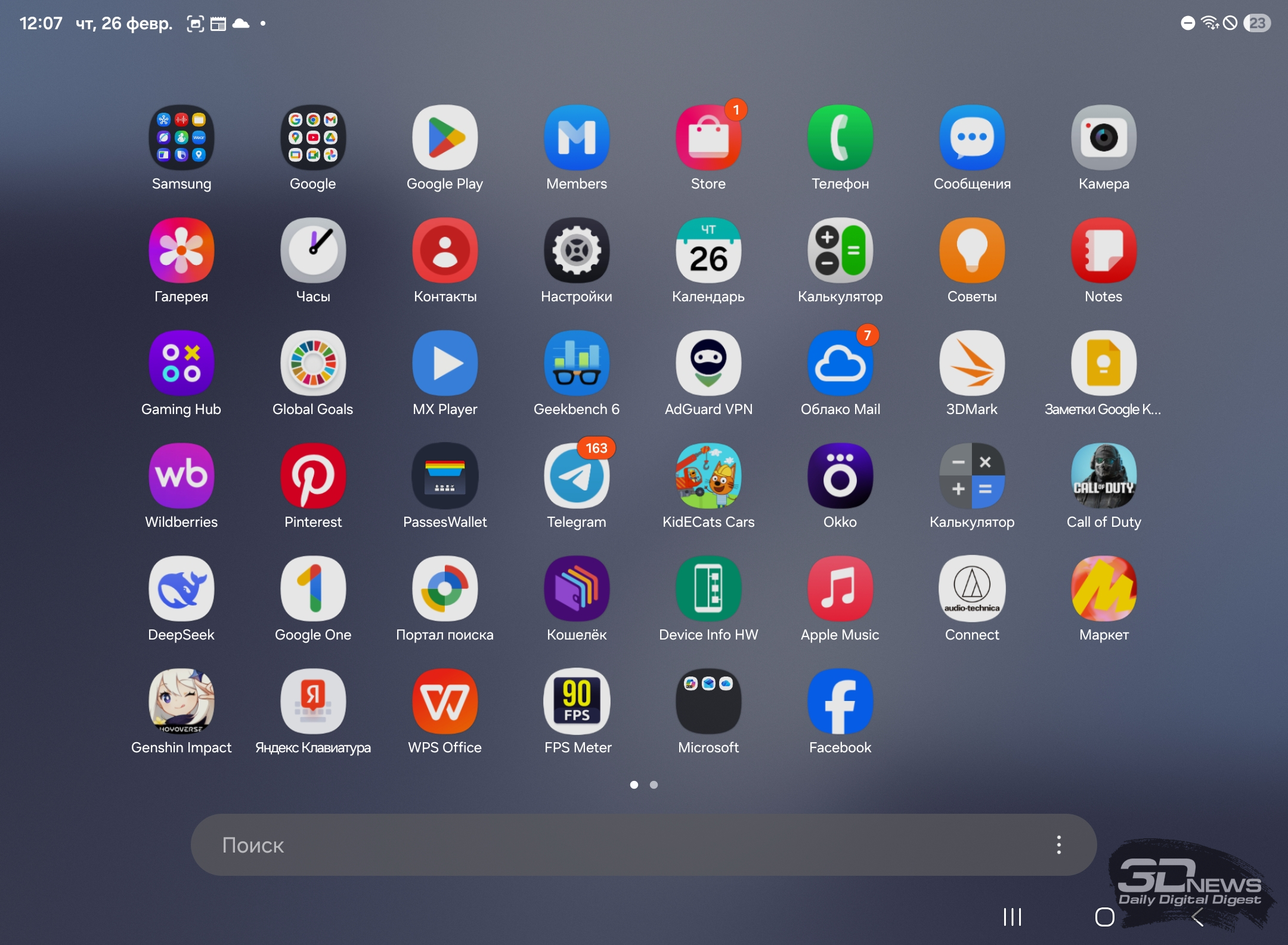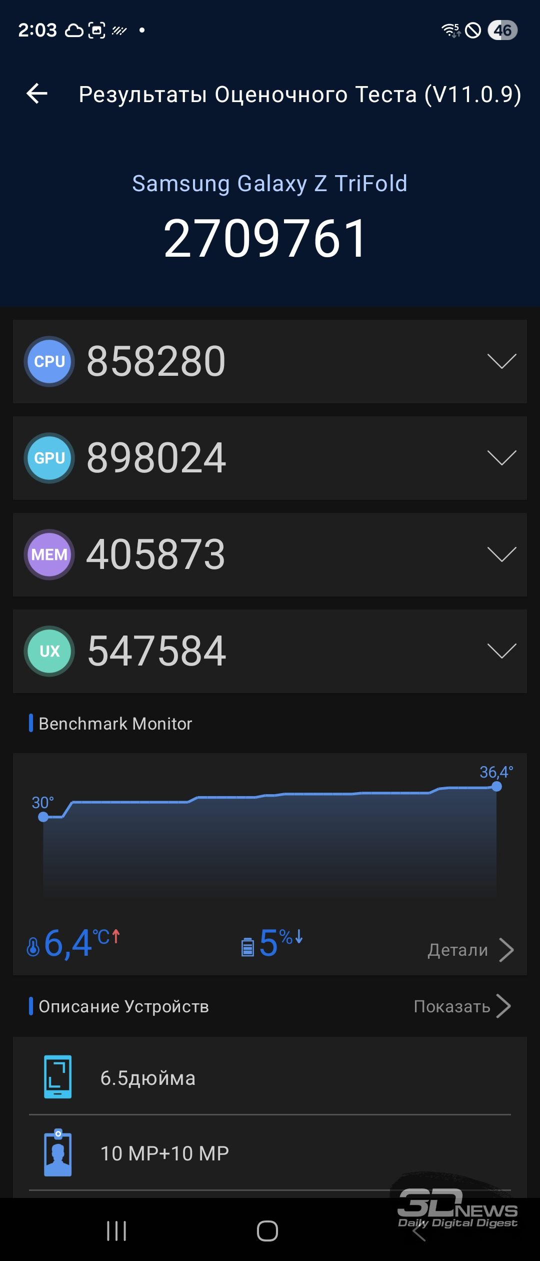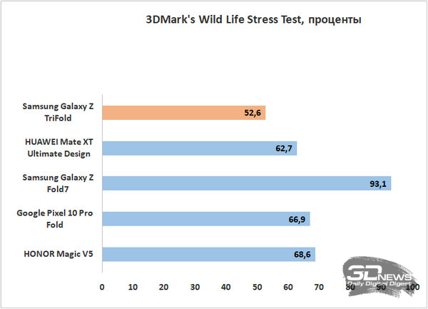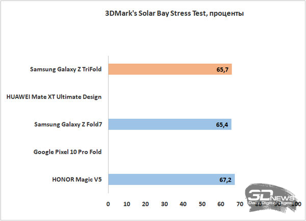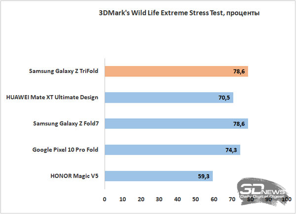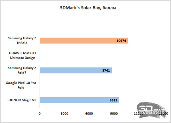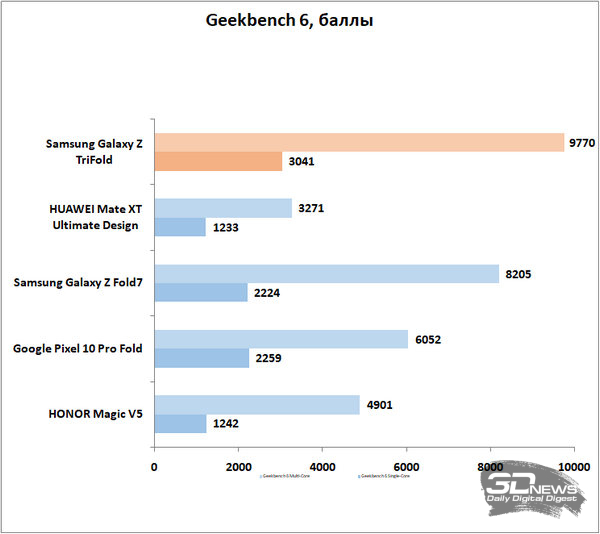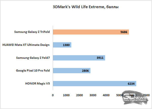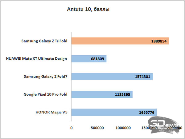 Samsung Galaxy Z TriFold, цветовой охват внутреннего экрана в режиме цветопередачи «Естественные цвета». Серый треугольник – охват sRGB, белый треугольник – охват Galaxy Z TriFold В режиме цветопередачи «Естественные цвета» цветовой охват сужается до sRGB, гамма повышается до нормального уровня (2,18), цветовая температура в точности соответствует эталону. Среднее отклонение DeltaE по шкале Color Checker составляет 2,52. Экраны настроены хорошо, но для более точных, корректных цветов стоит переключиться в режим «Естественные цвета». Звуковые возможности Galaxy Z TriFold вполне хороши по современным меркам: неплохие выделенные стереодинамики (хотя в планшетах мы привыкли не к двум динамикам, а к четырем или даже шести), отсутствует аналоговый аудиотракт, но есть, поддержка необходимых профилей передачи данных высокого разрешения по Bluetooth (здесь – версии 5.4): LDAC, aptX/aptX HD/aptX Adaptive. Что касается разговорного динамика, то он есть только на внешней панели. Если хотите поговорить по телефону, используя TriFold в разложенном состоянии, необходимо воспользоваться громкой связью — иное выглядело бы по меньшей мере странно. ⇡#«Железо» и производительностьSamsung Galaxy Z TriFold получил ту же однокристальную платформу, что и Galaxy Z Fold7, и трубки серии Galaxy S25, – Qualcomm Snapdragon 8 Elite for Galaxy. У него был долгий цикл разработки, так что на подножку уже набравшего крейсерскую скорость поезда Snapdragon 8 Elite Gen 5 тройной складной Samsung не успел. На смартфонах бренда эта платформа дебютировала вот только что, на Galaxy S26 (и мы на момент публикации этого обзора уже приступили к подготовке материала по Ultra). Но не могу сказать, что прошлогодняя (формально даже позапрошлогодняя) платформа успела сильно устареть. Напомним, что Qualcomm Snapdragon 8 Elite for Galaxy состоит из двух старших ядер Oryon V2 Phoenix L тактовой частотой 4,47 ГГц (против 4,32 ГГц у «обычной» Snapdragon 8 Elite) и шести ядер Oryon V2 Phoenix M частотой до 3,53 Гц. Графическая подсистема – Adreno 830 частотой 1,1 ГГц (тут обошлось без разгона). Набор инструкций – ARMv9.2-A. Собирается платформа на фабриках TSMC по 3-нм техпроцессу. Особенно заметно, что чипсет еще актуальный, при сравнении с другими складными смартфонами — и особенно с единственным прямым конкурентом. Над ним превосходство Samsung с куда более мощной платформой Qualcomm выглядит просто подавляющим. С остальными TriFold либо держится наравне, либо тоже имеет серьезное преимущество (как в случае Google Pixel 10 Pro Fold с его Tensor). Любопытно, что даже на фоне других складных смартфонов с тем же процессором тройной складной Samsung показывает цифры в бенчмарках получше — здесь не так режутся максимальные частоты, как даже на Galaxy Z Fold7. Почему — не совсем понятно, но приятно. Про системные или рабочие приложения и говорить не приходится, но и игры успешно исполняются при 120 кадрах в секунду (если в самом проекте вообще есть такая возможность). Результаты синтетических тестов Samsung Galaxy Z TriFold