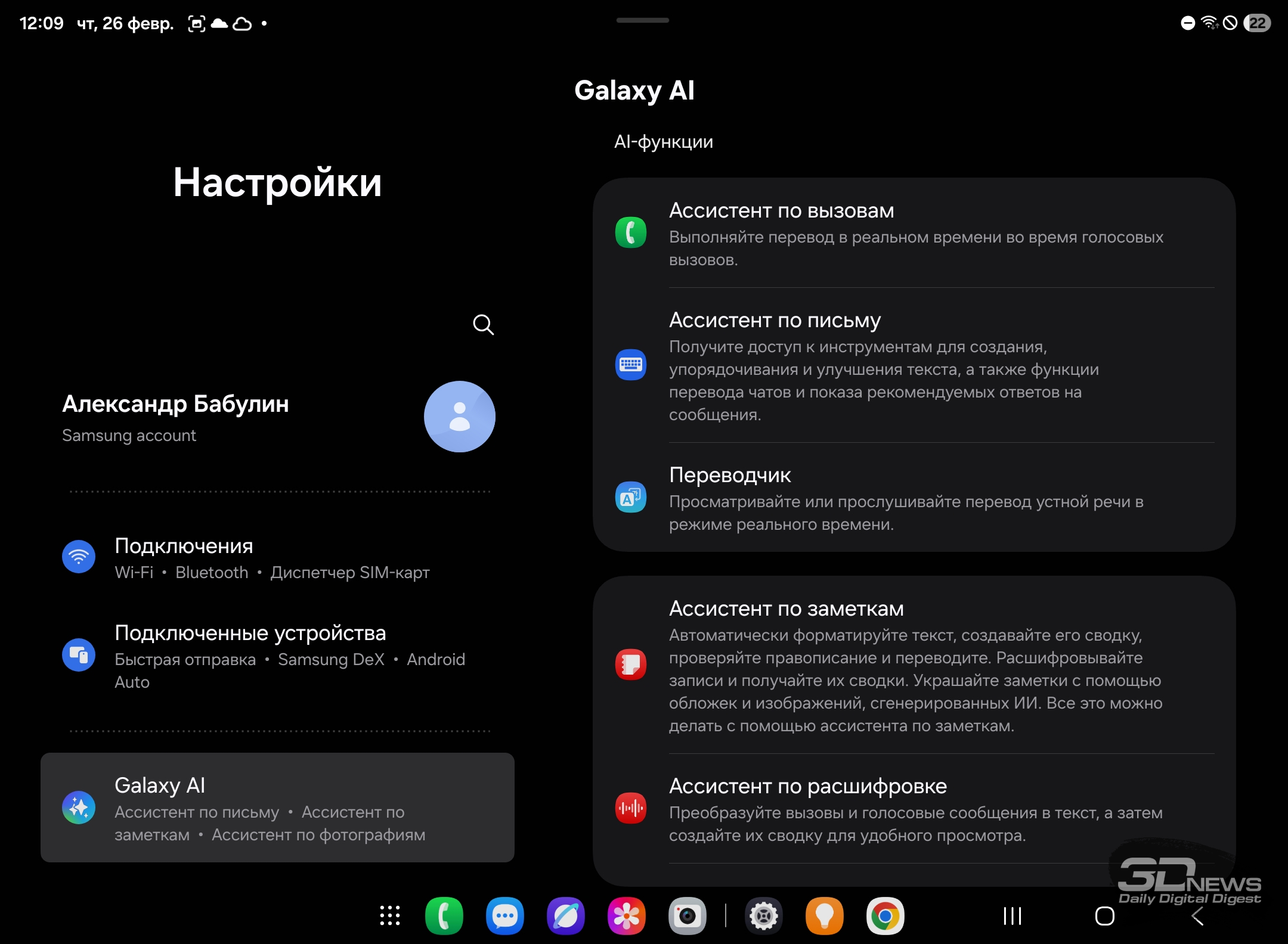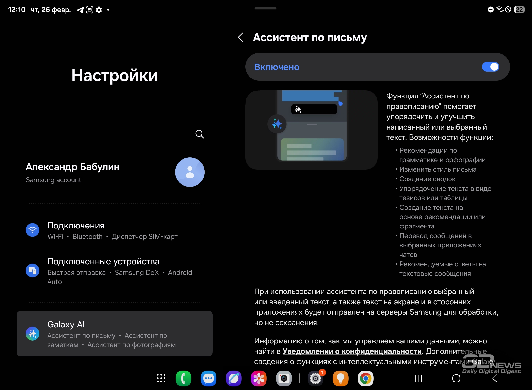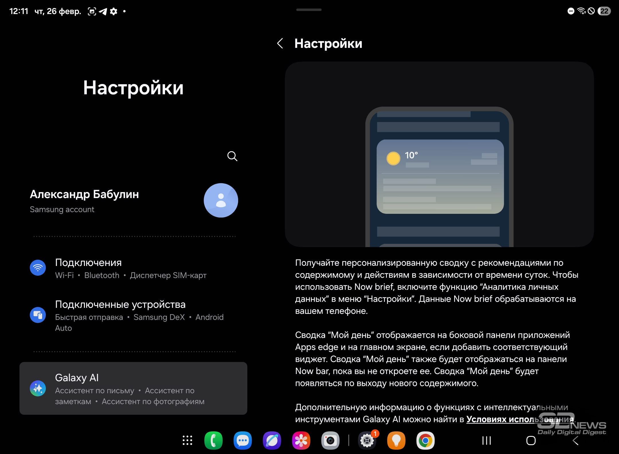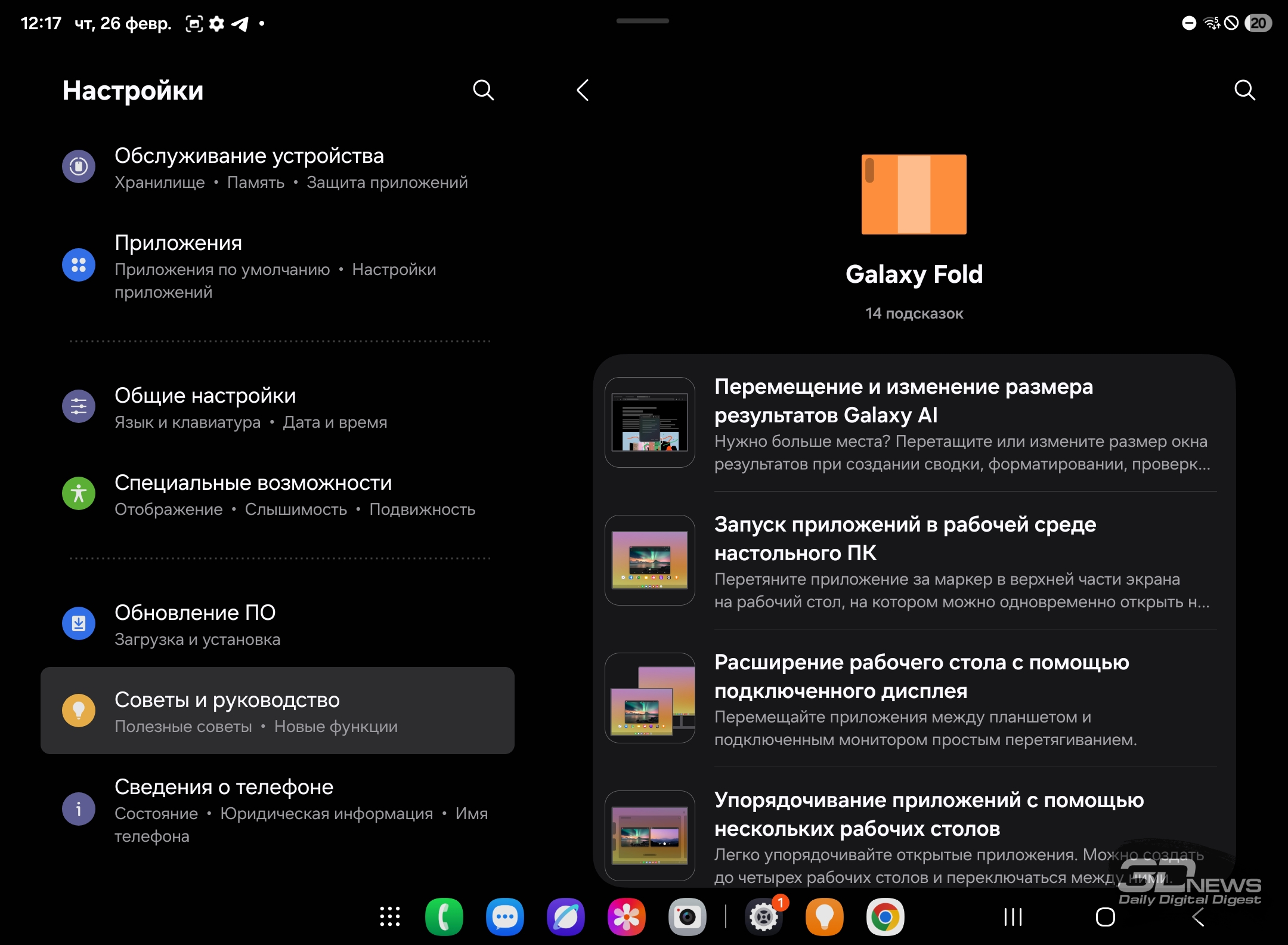 Специфика работы с гибким экраном и перехода между экранами не изменилась – все так же происходит бесшовно и без проблем, клавиатура разделена на две части в разложенном виде, настройки интерфейса очень гибкие, причем они раздельные для внутреннего и внешнего экрана. Главные отличия — отсутствие функций, доступных в полуразложенном, условно «ноутбучном» состоянии экрана (Flex), так использовать смартфон попросту невозможно, у него два агрегатных состояния: условно смартфон и условно планшет. При этом TriFold получил функцию «Второй экран», благодаря которой смартфон-планшет можно использовать в качестве второго монитора для персонального компьютера; передача данных осуществляется без кабелей при помощи технологии Miracast. На месте и возможность связывать смартфон с компьютером при помощи технологии Samsung DeX. Ну и наконец, на крупном экране можно выводить больше окон одновременно — до четырех. Но удобнее всего — три, по количеству створок, разделенных складками на экране. Работает система быстро и без сбоев, в памяти она занимает 17,43 Гбайт. Обещают до семи лет системных обновлений. Возможности Galaxy AI на смартфоне Samsung Galaxy Z TriFold