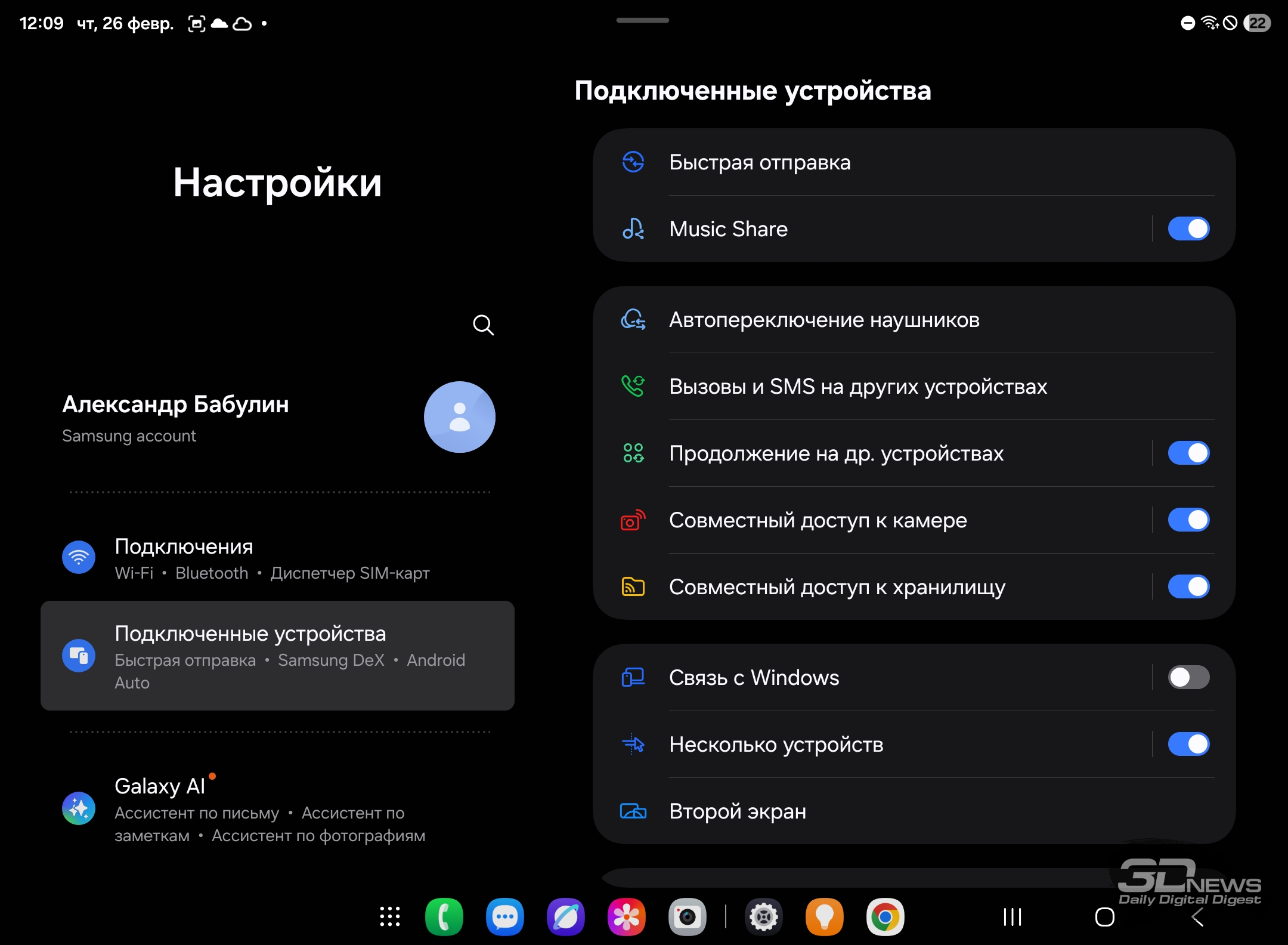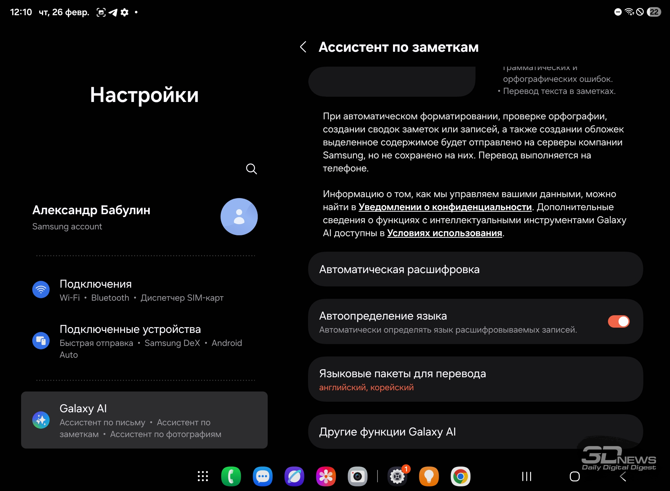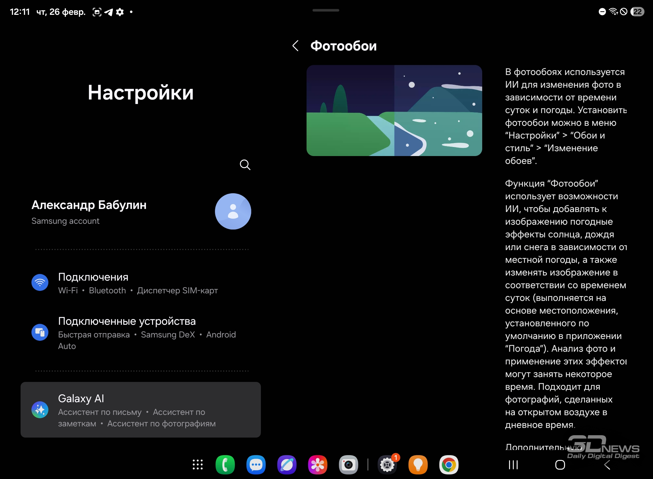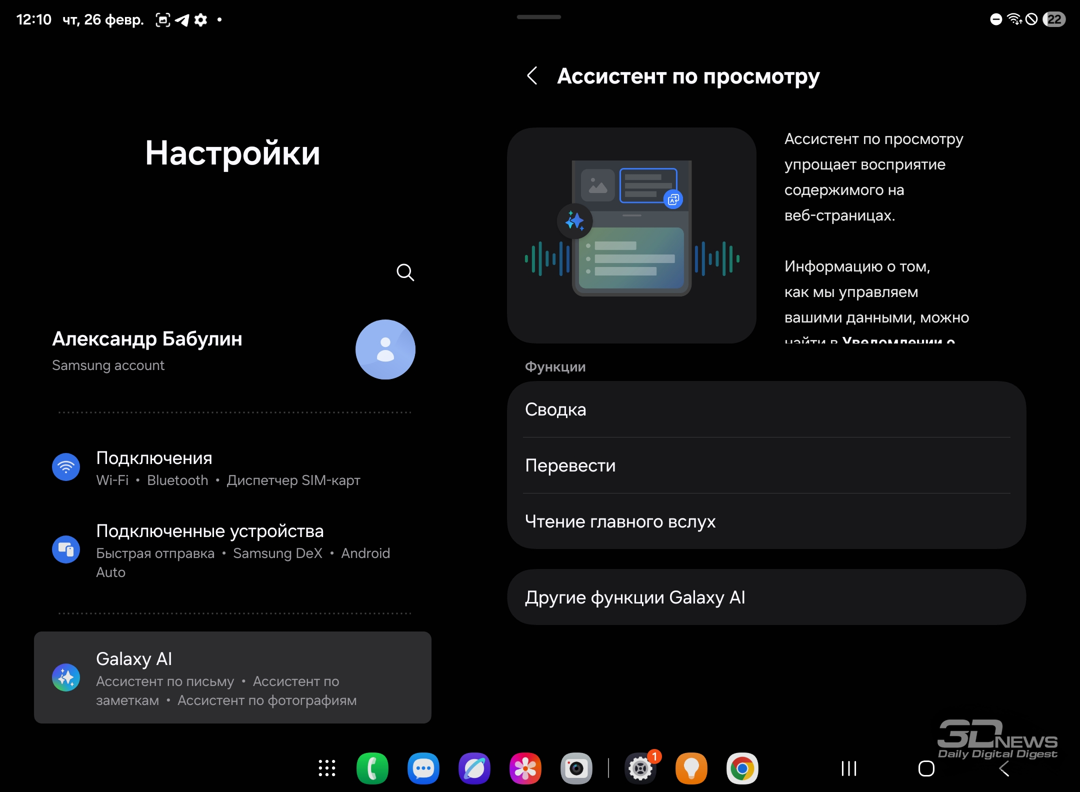 Специфика работы с гибким экраном и перехода между экранами не изменилась – все так же происходит бесшовно и без проблем, клавиатура разделена на две части в разложенном виде, настройки интерфейса очень гибкие, причем они раздельные для внутреннего и внешнего экрана. Главные отличия — отсутствие функций, доступных в полуразложенном, условно «ноутбучном» состоянии экрана (Flex), так использовать смартфон попросту невозможно, у него два агрегатных состояния: условно смартфон и условно планшет. При этом TriFold получил функцию «Второй экран», благодаря которой смартфон-планшет можно использовать в качестве второго монитора для персонального компьютера; передача данных осуществляется без кабелей при помощи технологии Miracast. На месте и возможность связывать смартфон с компьютером при помощи технологии Samsung DeX. Ну и наконец, на крупном экране можно выводить больше окон одновременно — до четырех. Но удобнее всего — три, по количеству створок, разделенных складками на экране. Работает система быстро и без сбоев, в памяти она занимает 17,43 Гбайт. Обещают до семи лет системных обновлений. Возможности Galaxy AI на смартфоне Samsung Galaxy Z TriFold