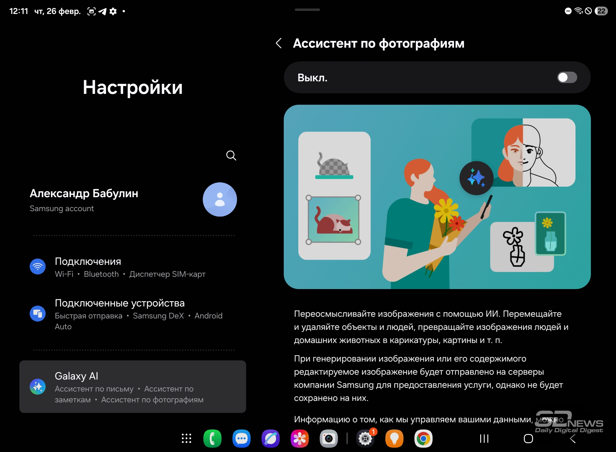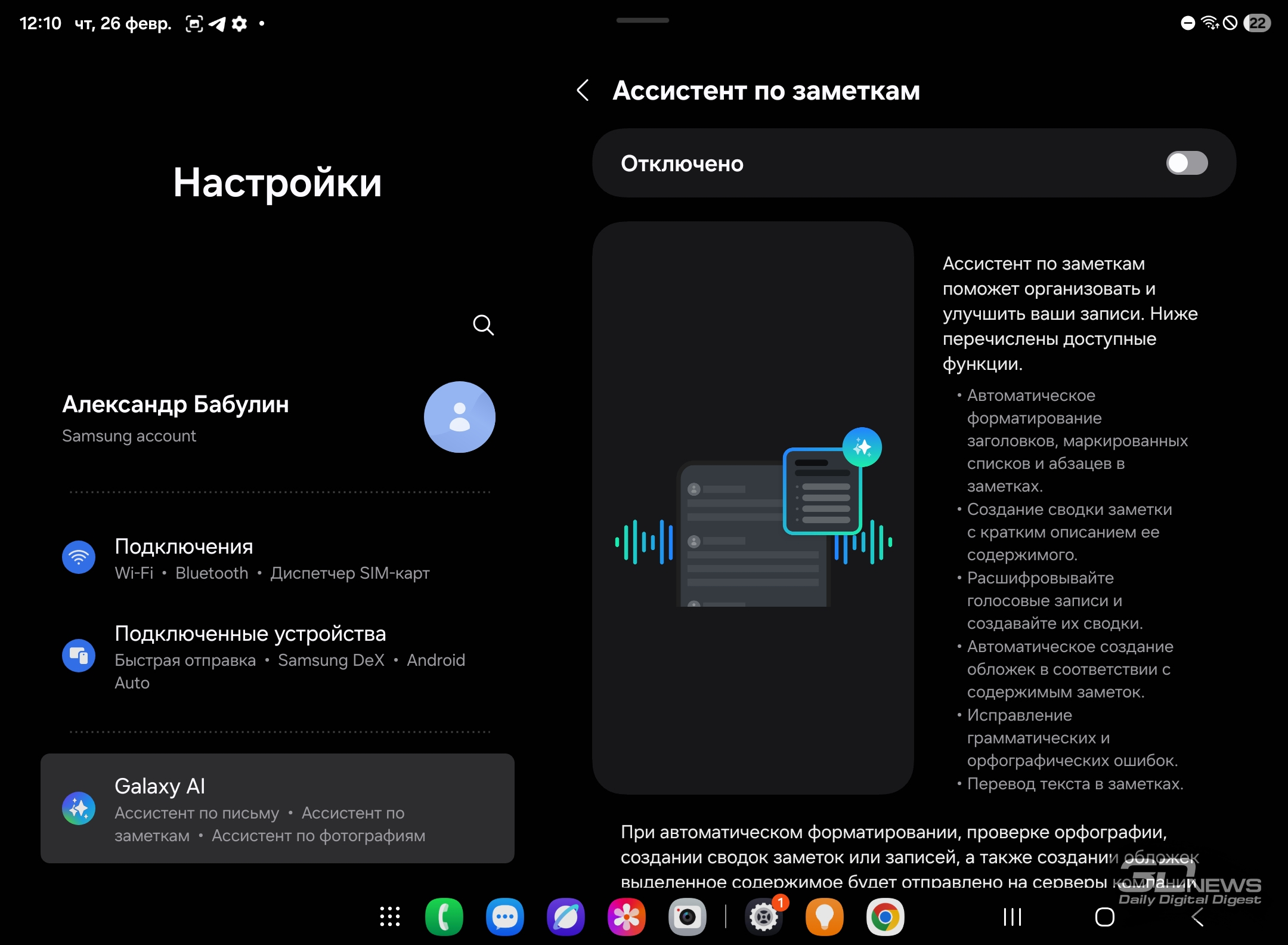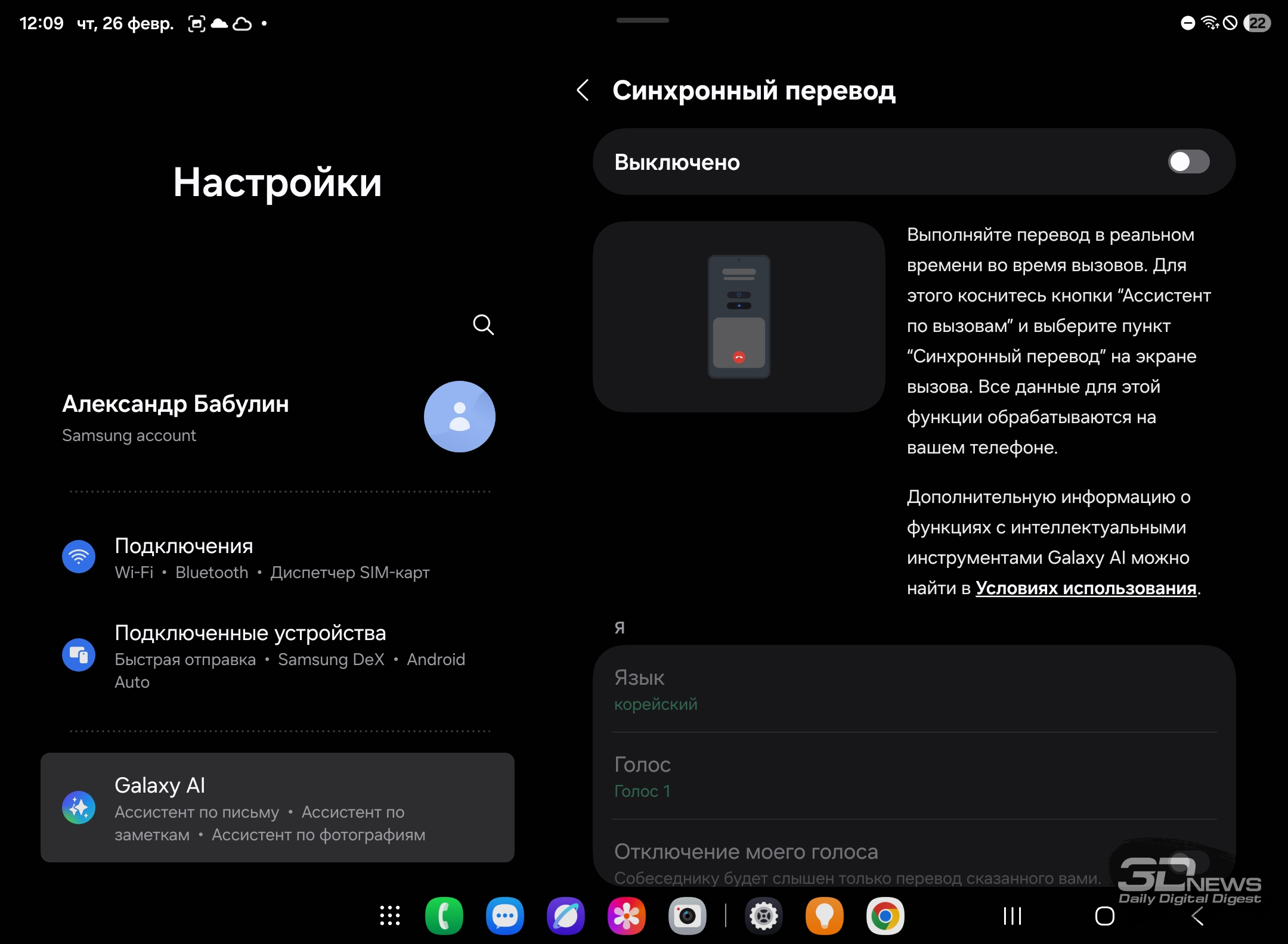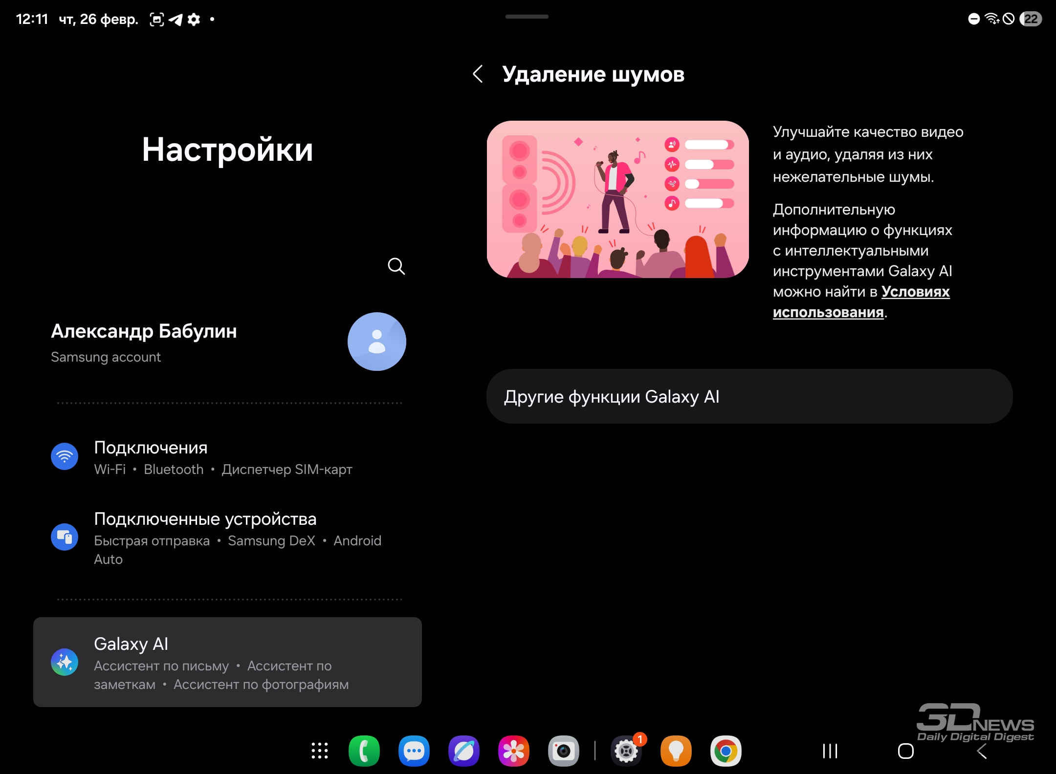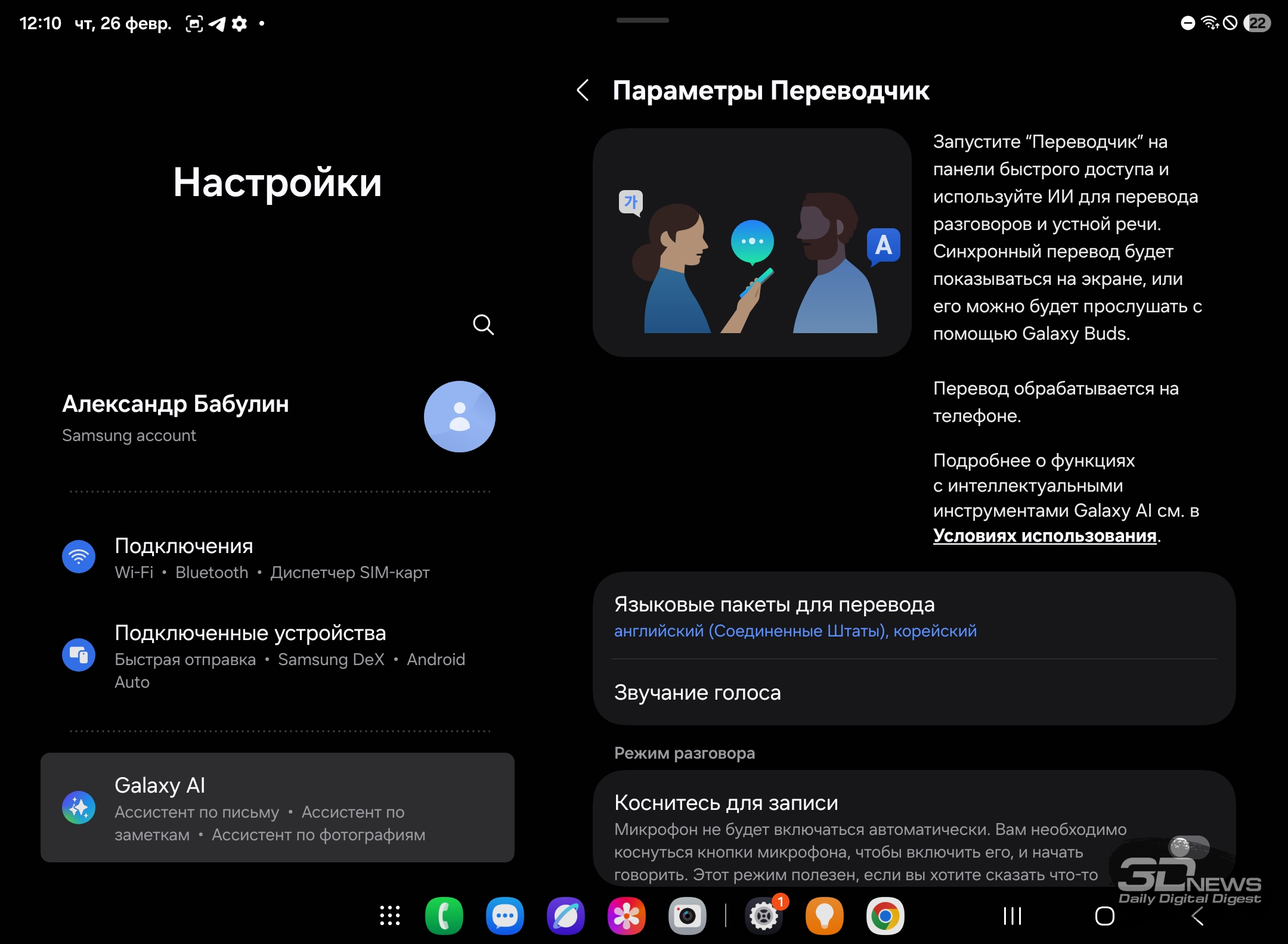 Специфика работы с гибким экраном и перехода между экранами не изменилась – все так же происходит бесшовно и без проблем, клавиатура разделена на две части в разложенном виде, настройки интерфейса очень гибкие, причем они раздельные для внутреннего и внешнего экрана. Главные отличия — отсутствие функций, доступных в полуразложенном, условно «ноутбучном» состоянии экрана (Flex), так использовать смартфон попросту невозможно, у него два агрегатных состояния: условно смартфон и условно планшет. При этом TriFold получил функцию «Второй экран», благодаря которой смартфон-планшет можно использовать в качестве второго монитора для персонального компьютера; передача данных осуществляется без кабелей при помощи технологии Miracast. На месте и возможность связывать смартфон с компьютером при помощи технологии Samsung DeX. Ну и наконец, на крупном экране можно выводить больше окон одновременно — до четырех. Но удобнее всего — три, по количеству створок, разделенных складками на экране. Работает система быстро и без сбоев, в памяти она занимает 17,43 Гбайт. Обещают до семи лет системных обновлений. Возможности Galaxy AI на смартфоне Samsung Galaxy Z TriFold