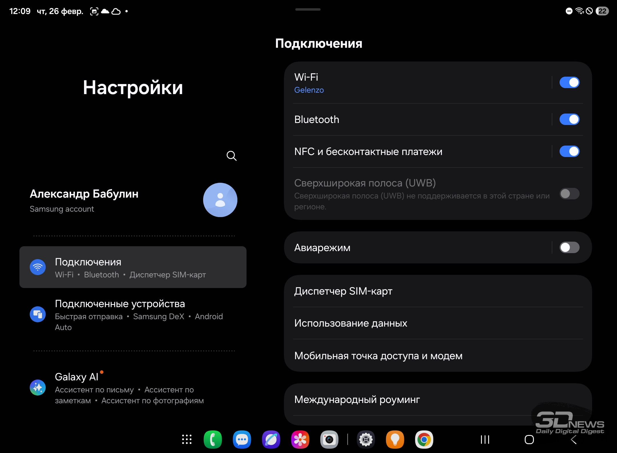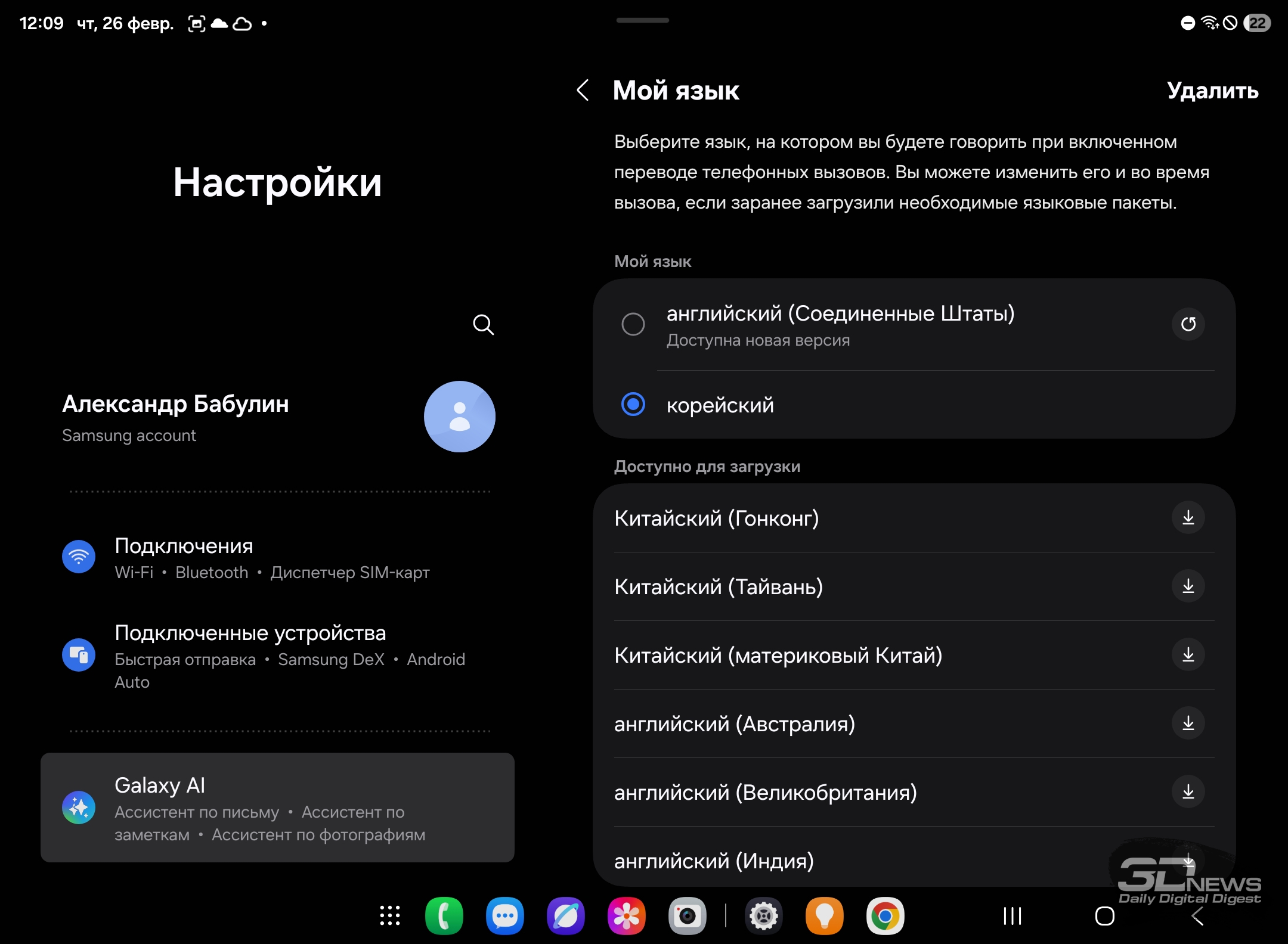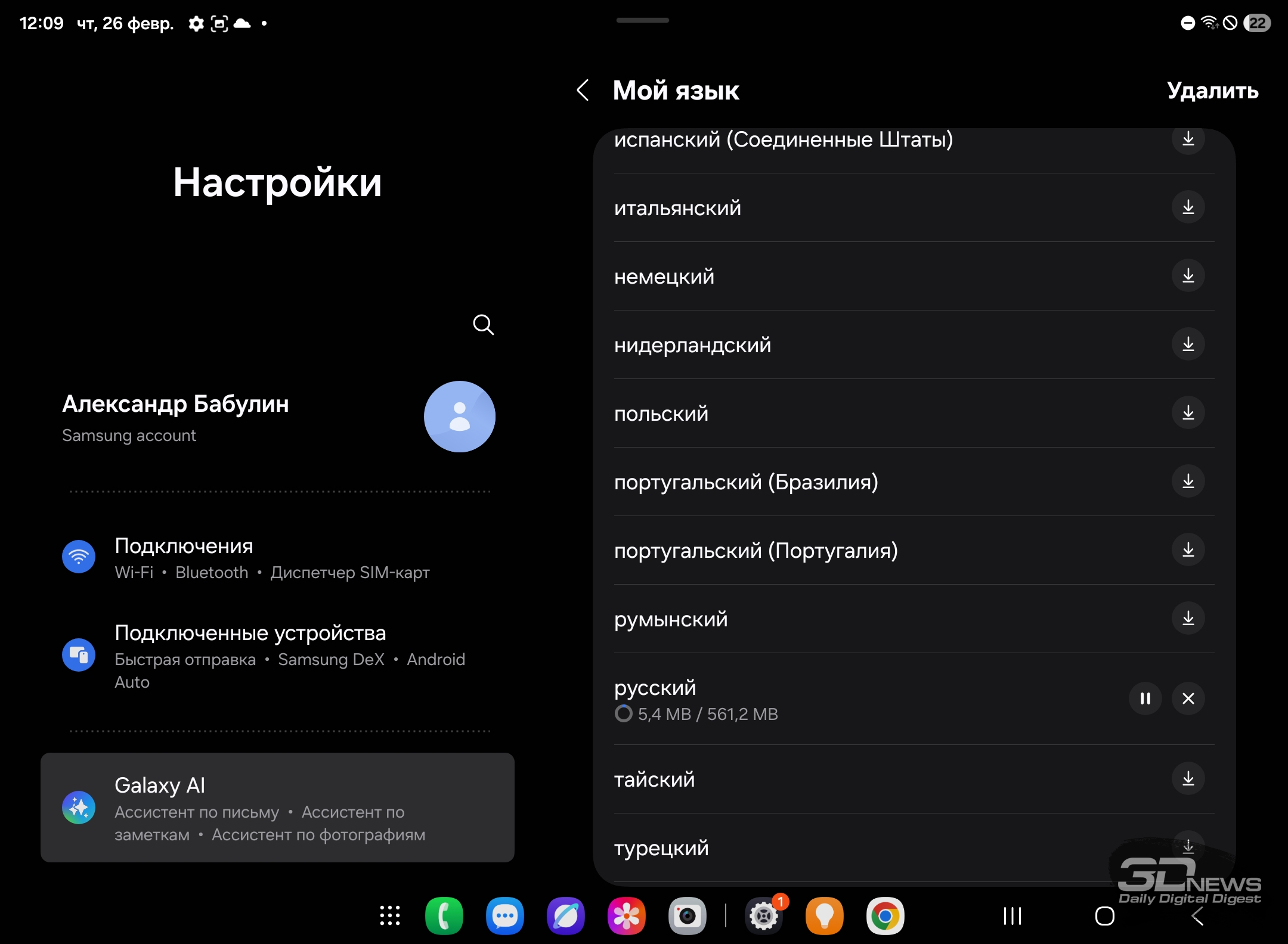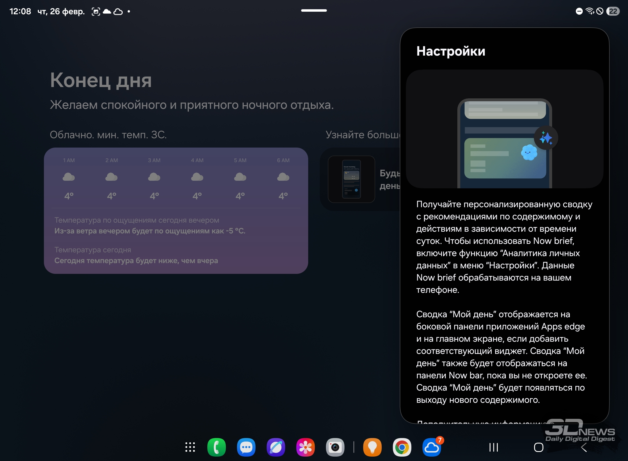 Специфика работы с гибким экраном и перехода между экранами не изменилась – все так же происходит бесшовно и без проблем, клавиатура разделена на две части в разложенном виде, настройки интерфейса очень гибкие, причем они раздельные для внутреннего и внешнего экрана. Главные отличия — отсутствие функций, доступных в полуразложенном, условно «ноутбучном» состоянии экрана (Flex), так использовать смартфон попросту невозможно, у него два агрегатных состояния: условно смартфон и условно планшет. При этом TriFold получил функцию «Второй экран», благодаря которой смартфон-планшет можно использовать в качестве второго монитора для персонального компьютера; передача данных осуществляется без кабелей при помощи технологии Miracast. На месте и возможность связывать смартфон с компьютером при помощи технологии Samsung DeX. Ну и наконец, на крупном экране можно выводить больше окон одновременно — до четырех. Но удобнее всего — три, по количеству створок, разделенных складками на экране. Работает система быстро и без сбоев, в памяти она занимает 17,43 Гбайт. Обещают до семи лет системных обновлений. Возможности Galaxy AI на смартфоне Samsung Galaxy Z TriFold