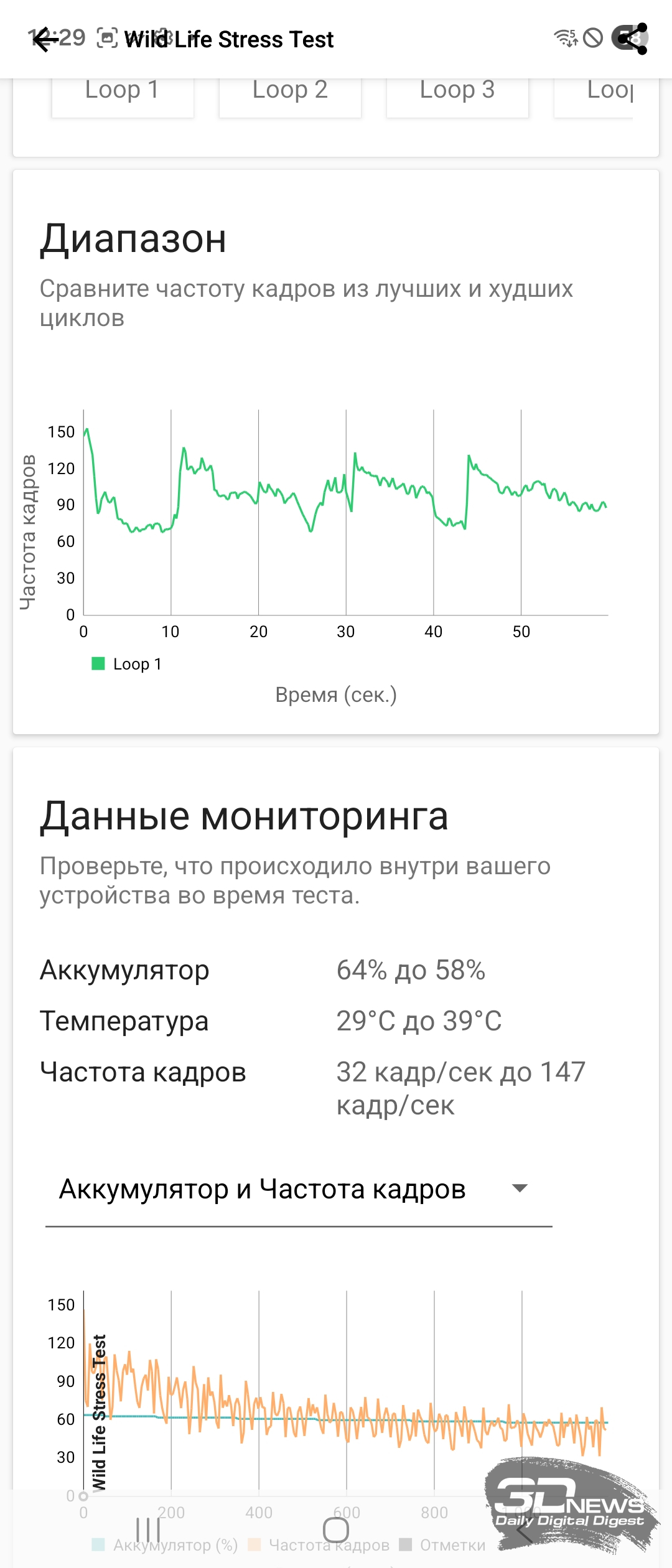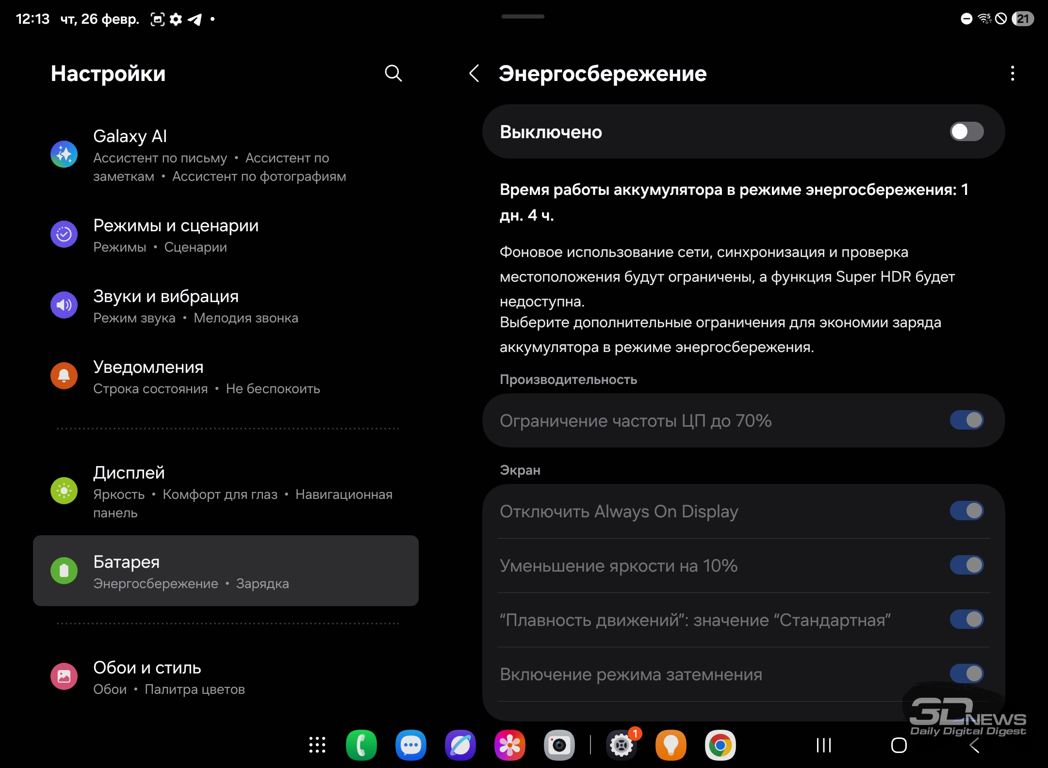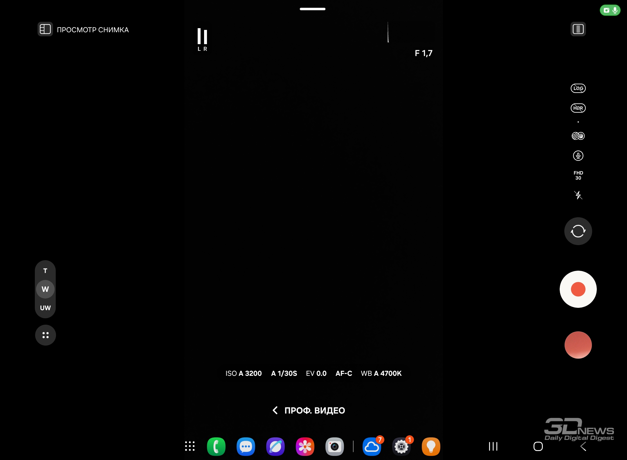 Смотреть все изображения (22) На Samsung Galaxy Z TriFold можно снимать видео в разрешении вплоть до 8К при 30 кадрах в секунду на главную камеру, а в разрешении 4К с частотой до 60 кадров в секунду на любую из трех, причем с возможностью переключаться между ними в процессе съемки. Можно снимать и HDR-видео в 4К 60p, но выше — только примеры SDR-видео. Есть «профессиональный» режим съемки, в котором можно регулировать скорость зуммирования, выбирать, на какие встроенные микрофоны писать звук, активировать «Зебру» для корректирования освещения в кадре, снимать в HDR, снимать Log-видео. Стабилизация доступна при любом разрешении, причем начиная с 4К она работает очень эффективно – картинка стабильна даже при съемке в движении, но при слабом освещении, например, чуть искажаются («пережимаются») объекты в кадре. Есть и еще более эффективная стабилизация для съемки самых динамичных сюжетов, она работает при разрешении QHD (2560 × 1440). Качество съемки в целом превосходное: детализация высокая, при слабом освещении картинка шумная, но только при использовании иных фокусных расстояний, кроме стандартного. На главную камеру можно снимать видео даже вечером или ночью без серьезных ограничений. В Samsung Galaxy Z TriFold установлены две почти одинаковые селфи-камеры – на «крышку» и на внутреннюю часть смартфона. Используются 10-мегапиксельные модули Sony IMX 374 (1/3,0", 1,22 мкм) с оптикой светосилой f/2,2, без автофокуса. Оба способны снимать 4К-видео с частотой до 60 кадров в секунду. Они отличаются только базовым фокусным расстоянием – внешний модуль чуть менее широкоугольный (ЭФР 24 мм), внутренний – чуть более широкоугольный (ЭФР 18 мм), это логично с учетом того, что внутренний будет с большей вероятностью использоваться для видеозвонков. Доступны два фокусных расстояния – в расширенном формате ведется съемка с разрешением 10 мегапикселей, в приближенном используется кроп при разрешении 6,5 мегапикселя. Фронталки у TriFold невыдающиеся — неплохой набор опций для съемки они не подкрепляют высоким качеством изображения. ⇡#Автономная работаВ Samsung Galaxy Z TriFold установлен весьма серьезный для складного смартфона аккумулятор емкостью 21,28 Вт·ч (5600 мА·ч, 3,8 В). Автономность же зависит исключительно от ваших сценариев использования смартфона. Если пользоваться только внешним экраном, гаджет спокойно проживет весь день, можно даже забыть его поставить заряжаться на ночь и не сильно страдать от этого с утра. Если же использовать его как планшет, то аккумулятор покажется, наоборот, недостаточно емким — все-таки он реально застрял между типичным для смартфонов значением и типичным для планшетов. В целом придраться к автономности TriFold я не могу, Samsung неплохо сбалансировала вес, толщину и емкость батареи. Наш стандартный тест с воспроизведением Full HD-видео с максимальной яркостью и включенным Wi-Fi смартфоны Samsung стабильно проходят уверенно — во многом за счет того, что снижают максимальную яркость в таких задачах, тем более в зависимости от внешнего освещения (а заметную часть периода тестирования гаджет лежит в темноте), — отключить это попросту нельзя. В итоге с внешним экраном смартфон продержался и вовсе удивительные 30 часов с лишним, а вот с внутренним – 14 с небольшим. Тоже очень хорошо для «планшета», честно говоря. Samsung Galaxy Z TriFold поддерживает как проводную зарядку с максимальной мощностью 45 Вт (да-да