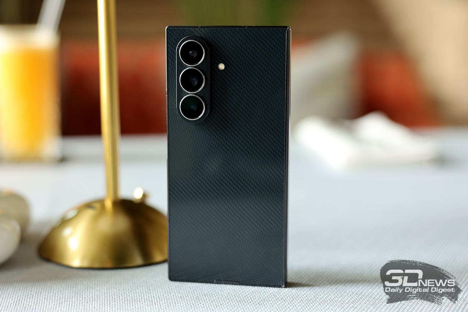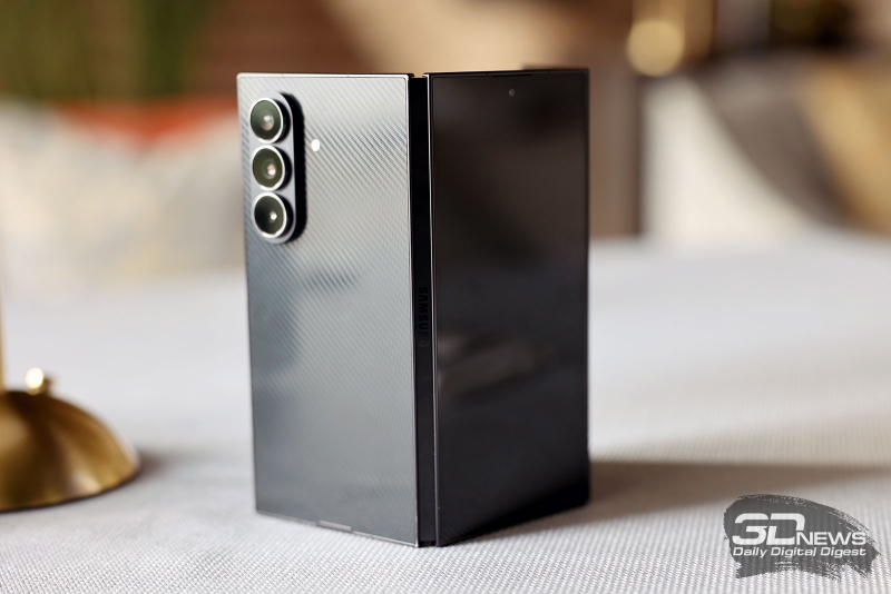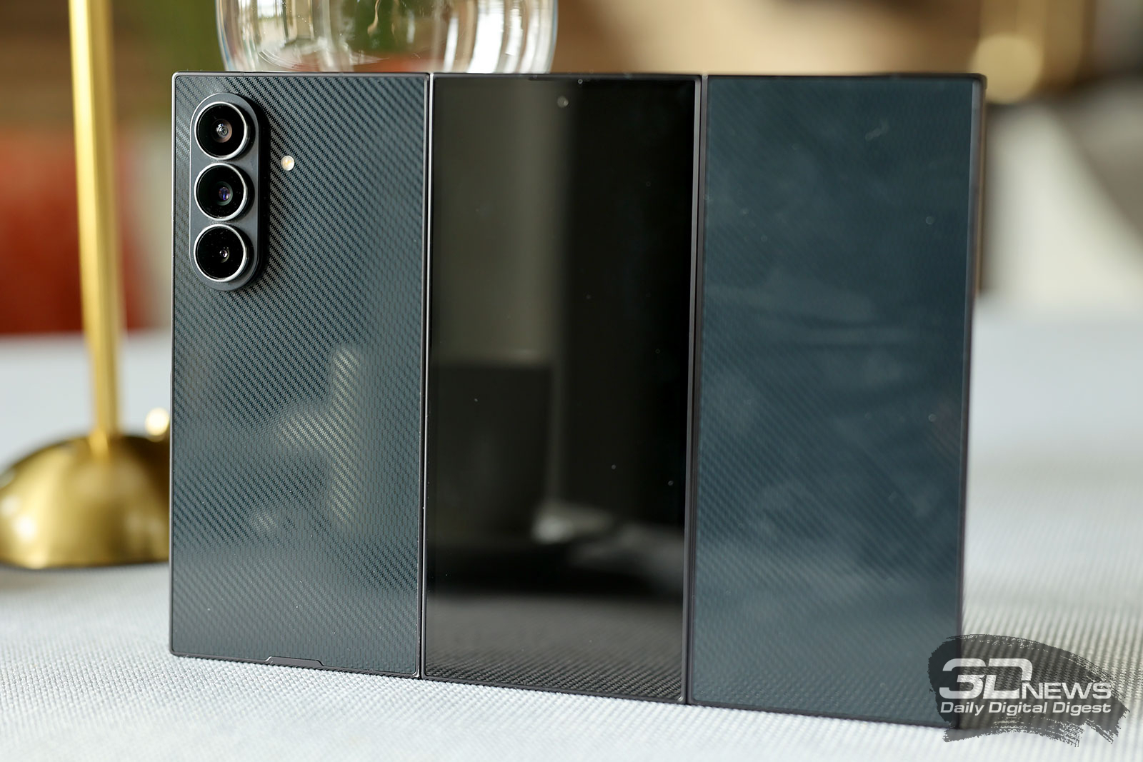 ⇡#ДизайнSamsung Galaxy Z TriFold – тот редкий случай, когда создателям просто не надо было думать о дизайне смартфона. Нет, я понимаю, что многие не думают об этом в принципе, клепая смартфоны-близнецы или в лучшем случае следуя спорадически возникающим трендам. Но здесь фирменный традиционализм Samsung полностью оправдан — сам форм-фактор тройного складного смартфона достаточно уникален, чтобы не заботиться о дополнительных рюшечках. Так что удивляться схожести TriFold и Fold7 точно не стоит — тем более есть и различия. Одно и вовсе ключевое — спинка (или спинки? — все с этим стало сложно) сделана не из стекла, а из полимера с керамическим напылением. Это заметно и на ощупь — TriFold действительно отличается от всего многообразия стеклянных современных гаджетов. И на глаз — благодаря особой фактуре и узору в пику однотонному Fold7. Над корпусом выступает блок с камерами — опять же ничего нового для современных смартфонов, тем более складных. Общее соревнование за звание самого тонкого сугубо формальное, так как разместить нынешние мобильные камеры с их крупными сенсорами и светлой (и, соответственно, объемной) оптикой в корпусах толщиной 4-5 мм невозможно. Здесь корпус в разложенном состоянии оказывается толщиной 3,9-4,2 мм. Да-да, с одной стороны гаджет тоньше, чем с другой, — звучит это более пугающе, чем выглядит на самом деле, заметить это тяжело. В любом случае к этим четырем условным миллиметрам можно смело добавлять семь-восемь за счет камер.
