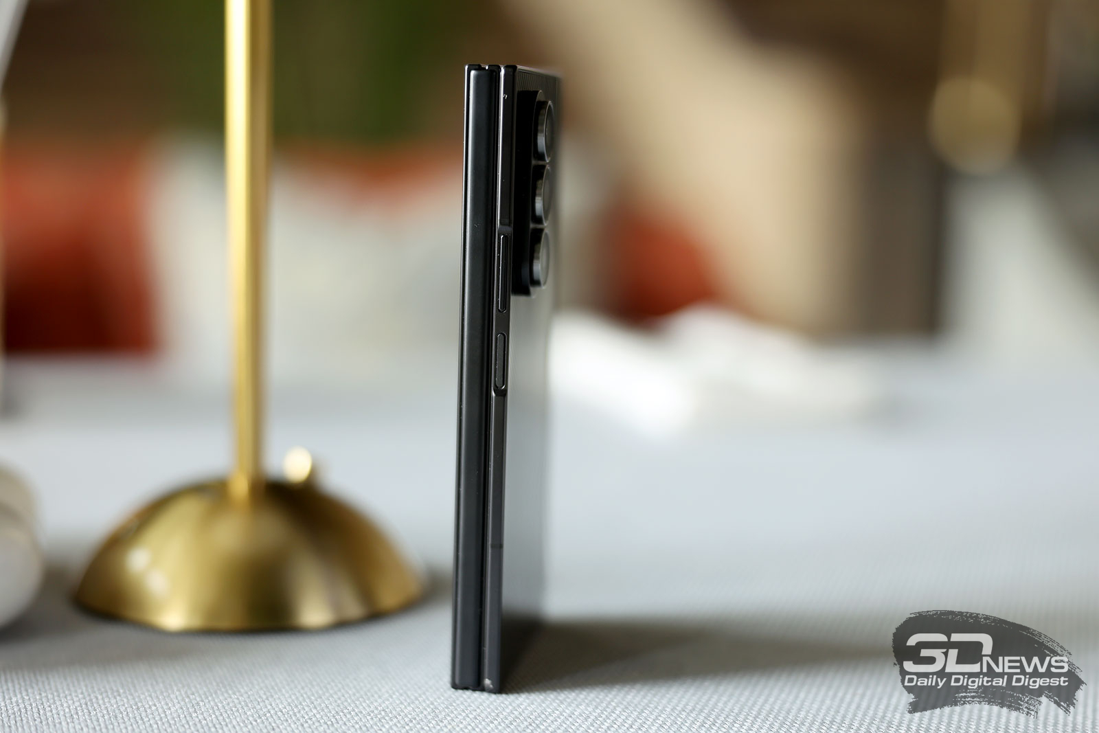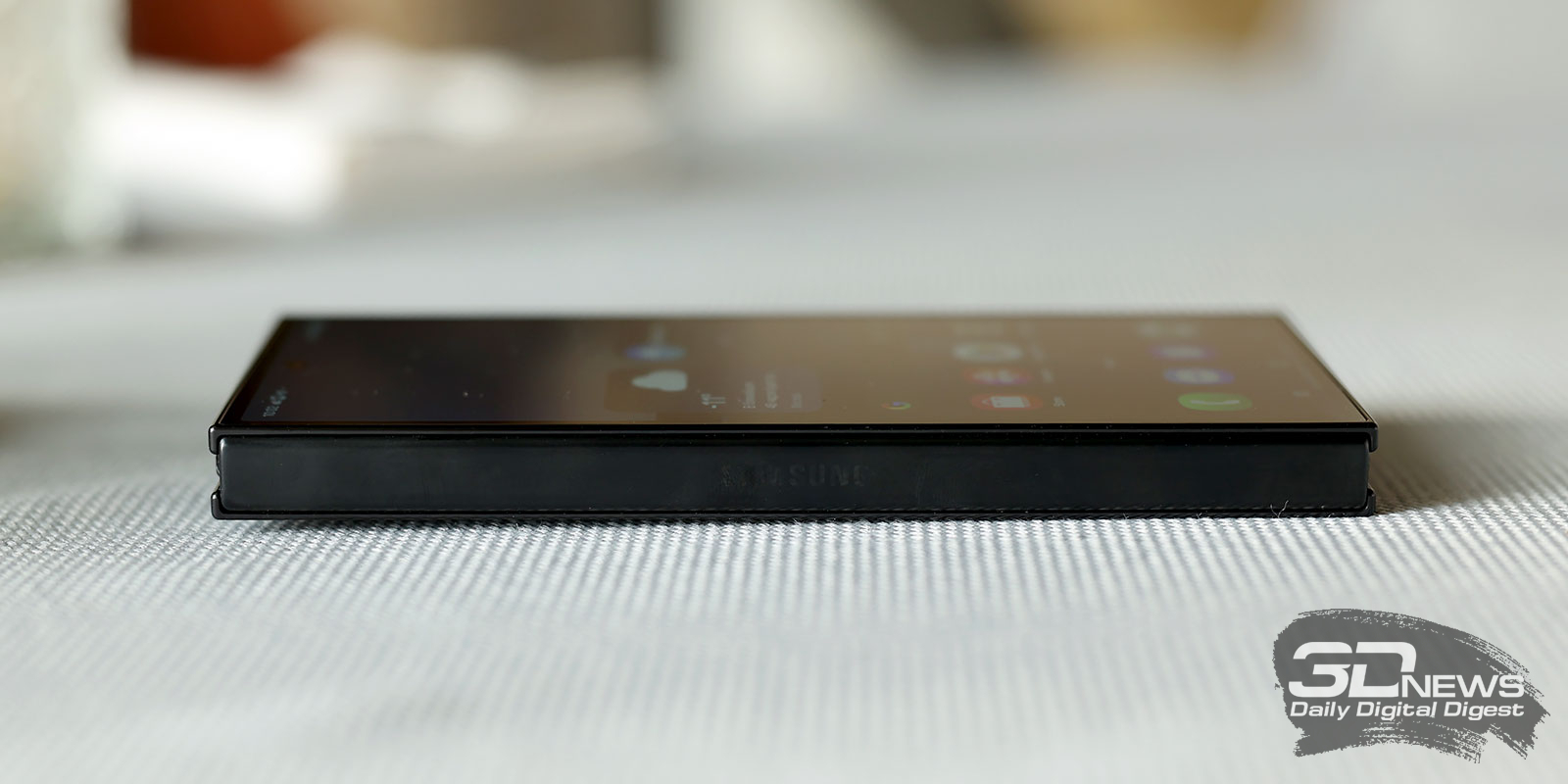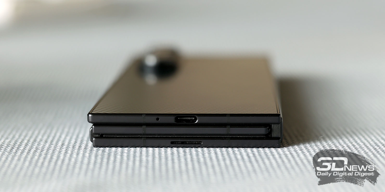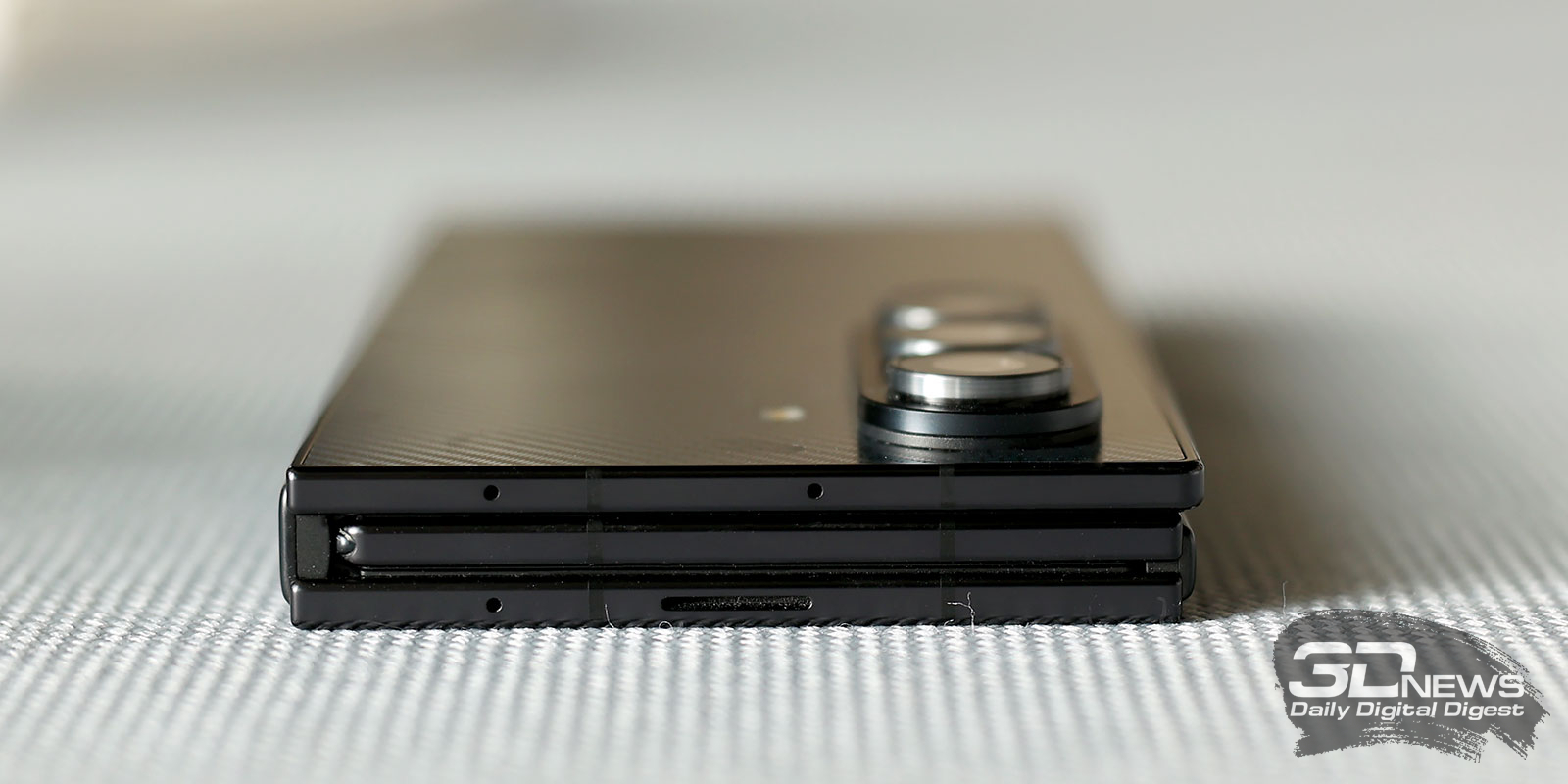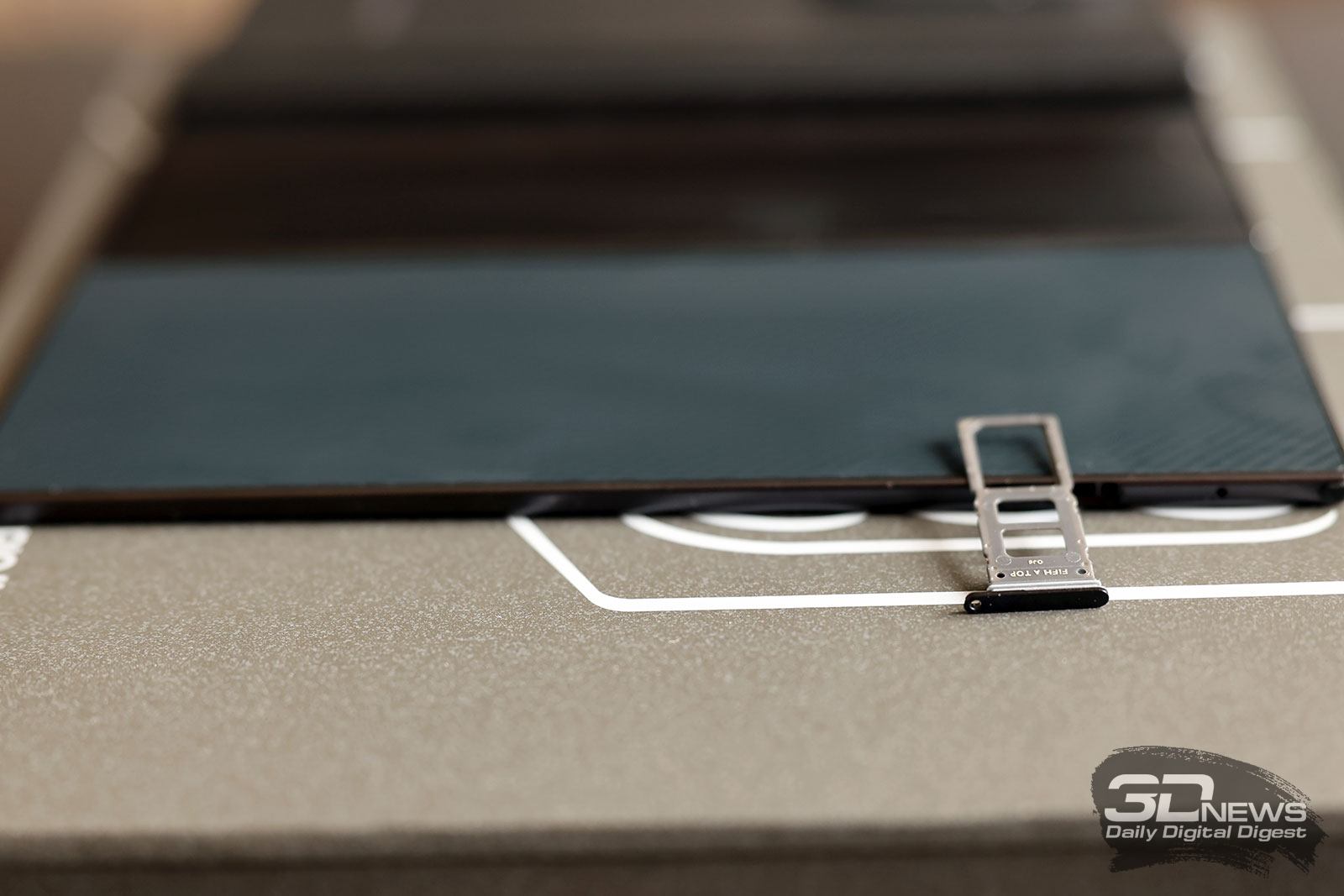 Samsung Galaxy Z TriFold, левая грань в разложенном состоянии (в сложенном она спрятана внутри корпуса): слот для SIM-карт и дополнительный микрофон Рамки вокруг экранов относительно небольшие — то есть, да, они куда крупнее тех, к которым мы привыкли на смартфонах традиционной конструкции, но это еще один момент, продиктованный особым положением устройства; как минимум раздражения эти бортики не вызывают.
