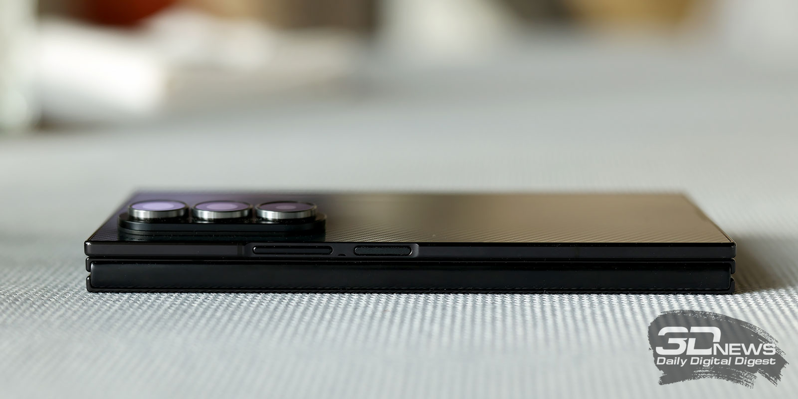 Samsung Galaxy Z TriFold в сложенном состоянии, справа, боковые грани: клавиша питания с встроенным сканером отпечатков и клавиша регулировки громкости