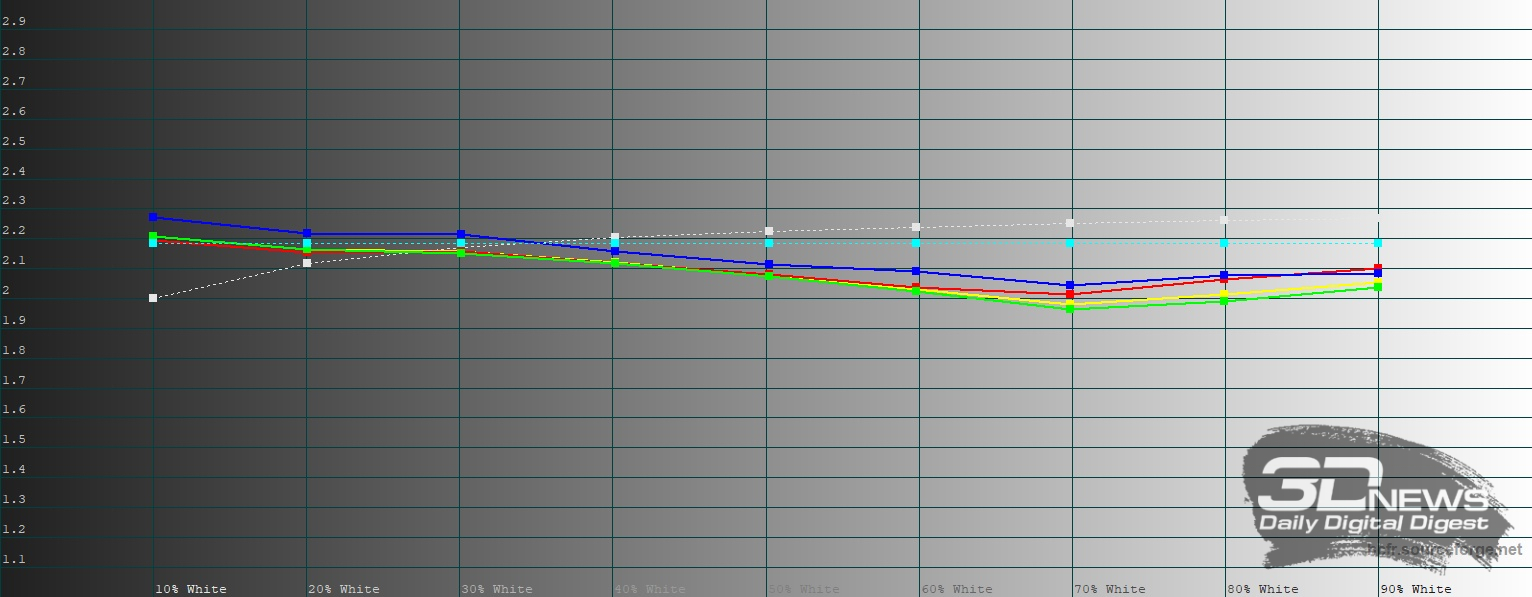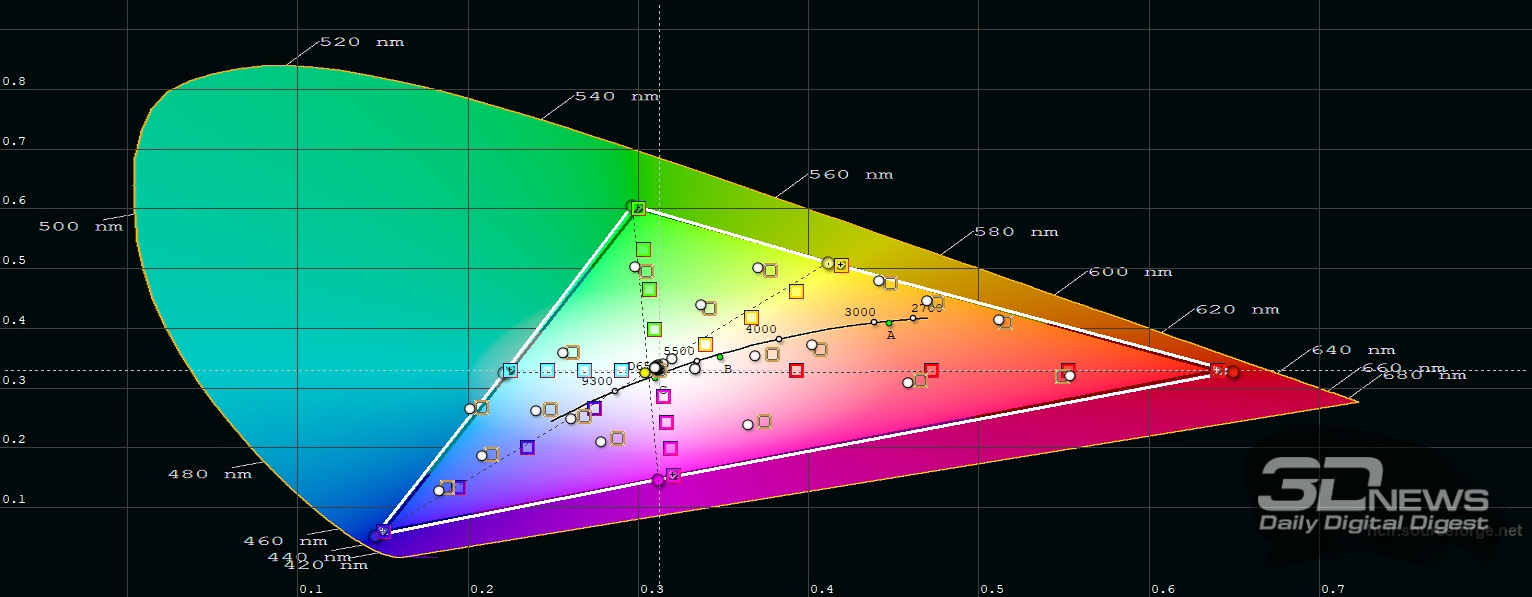 Samsung Galaxy Z TriFold, цветовой охват внешнего экрана в режиме цветопередачи «Насыщенные цвета». Серый треугольник – охват DCI-P3, белый треугольник – охват Galaxy Z TriFold У внешнего экрана в режиме «Насыщенные цвета» охват оказывается примерно средним между DCI-P3 и sRGB. Средняя гамма составляет 2,07, показатель серьезно понижен, температура при этом близка к эталону (около 6 900 К при эталоне в 6 500 К), а среднее отклонение DeltaE по таблице Color Checker (оттенки серого + широкий набор цветовых оттенков) составляет 4,14 (при норме 3 и эталонном значении 2).