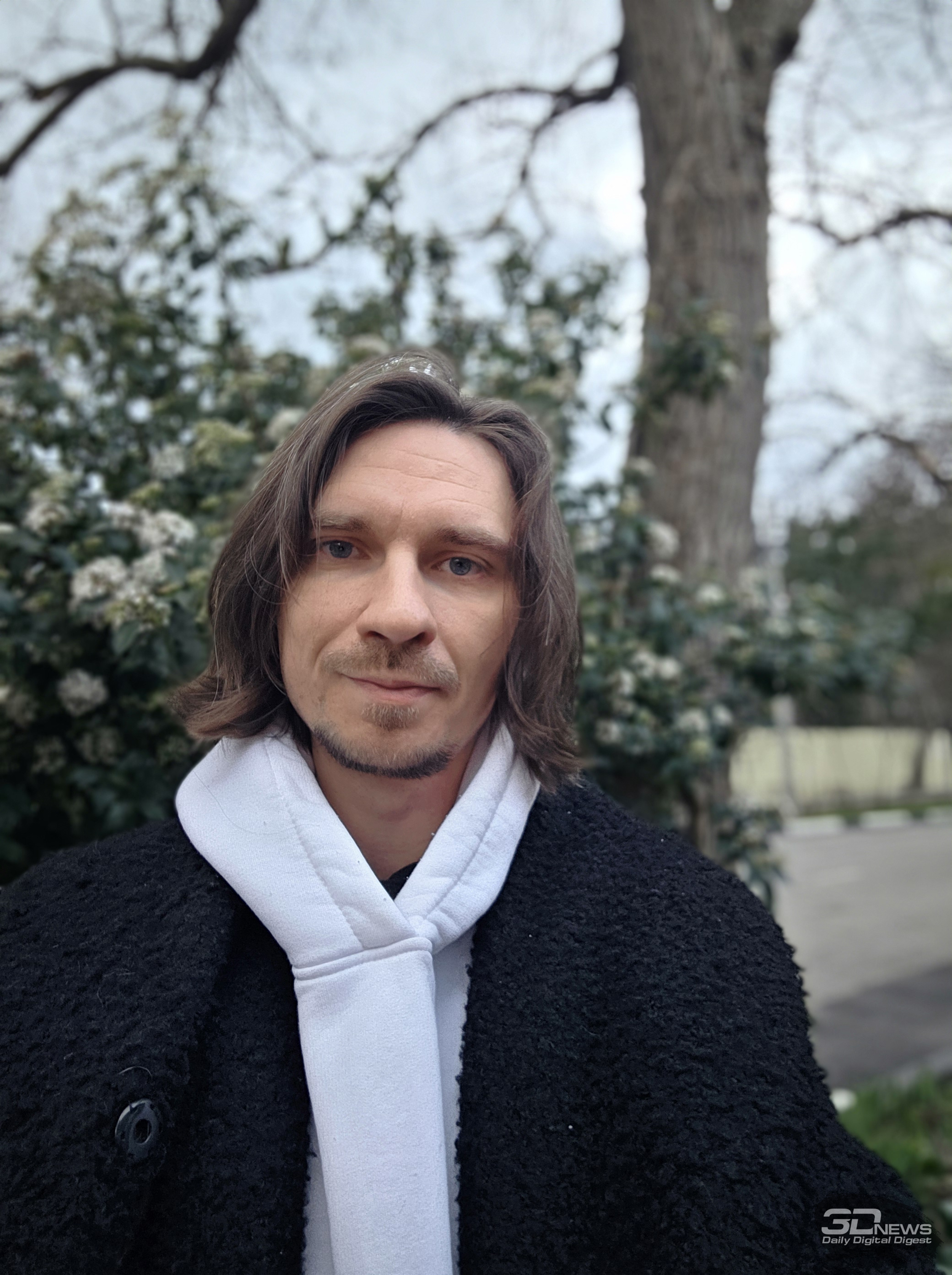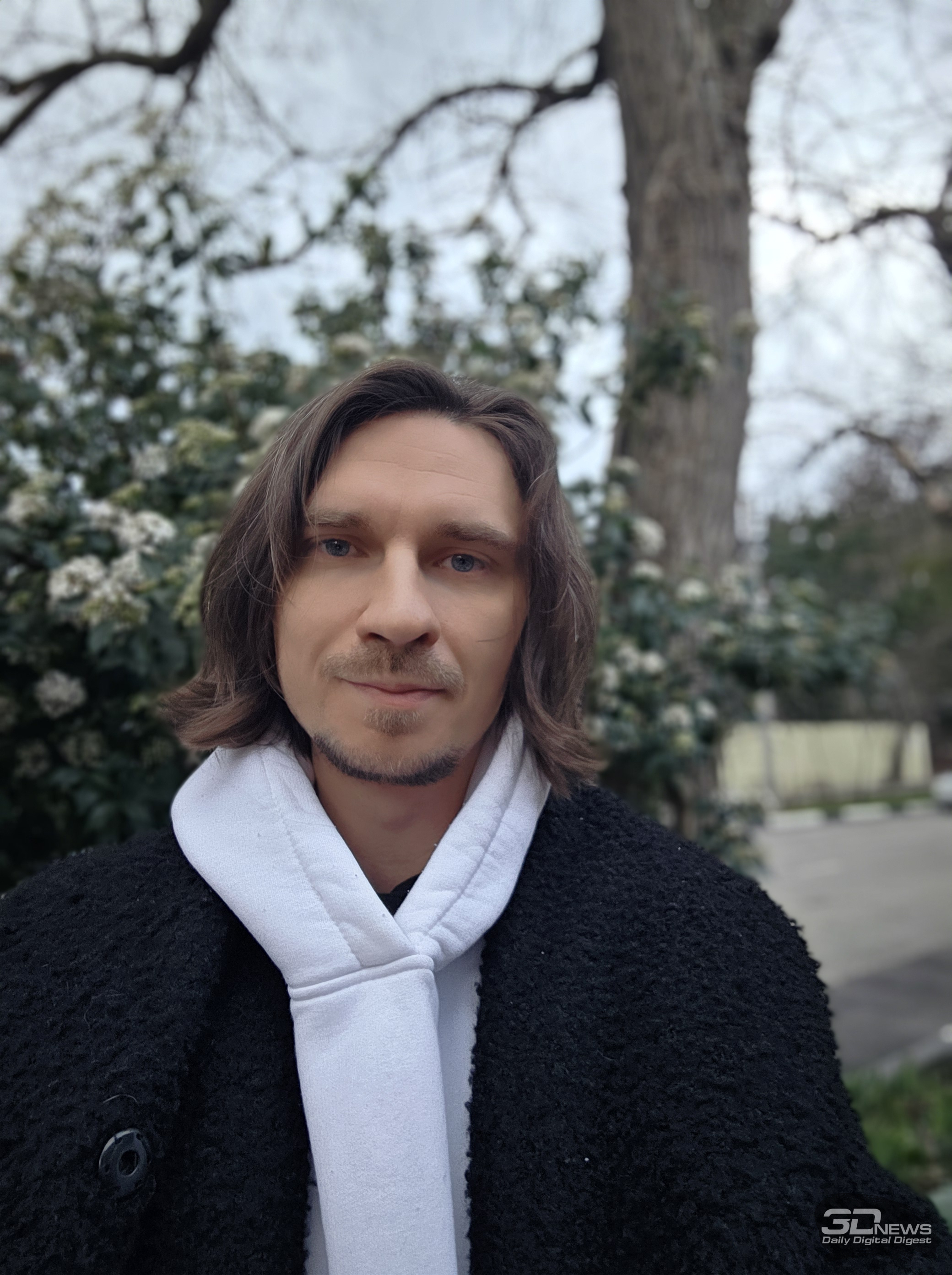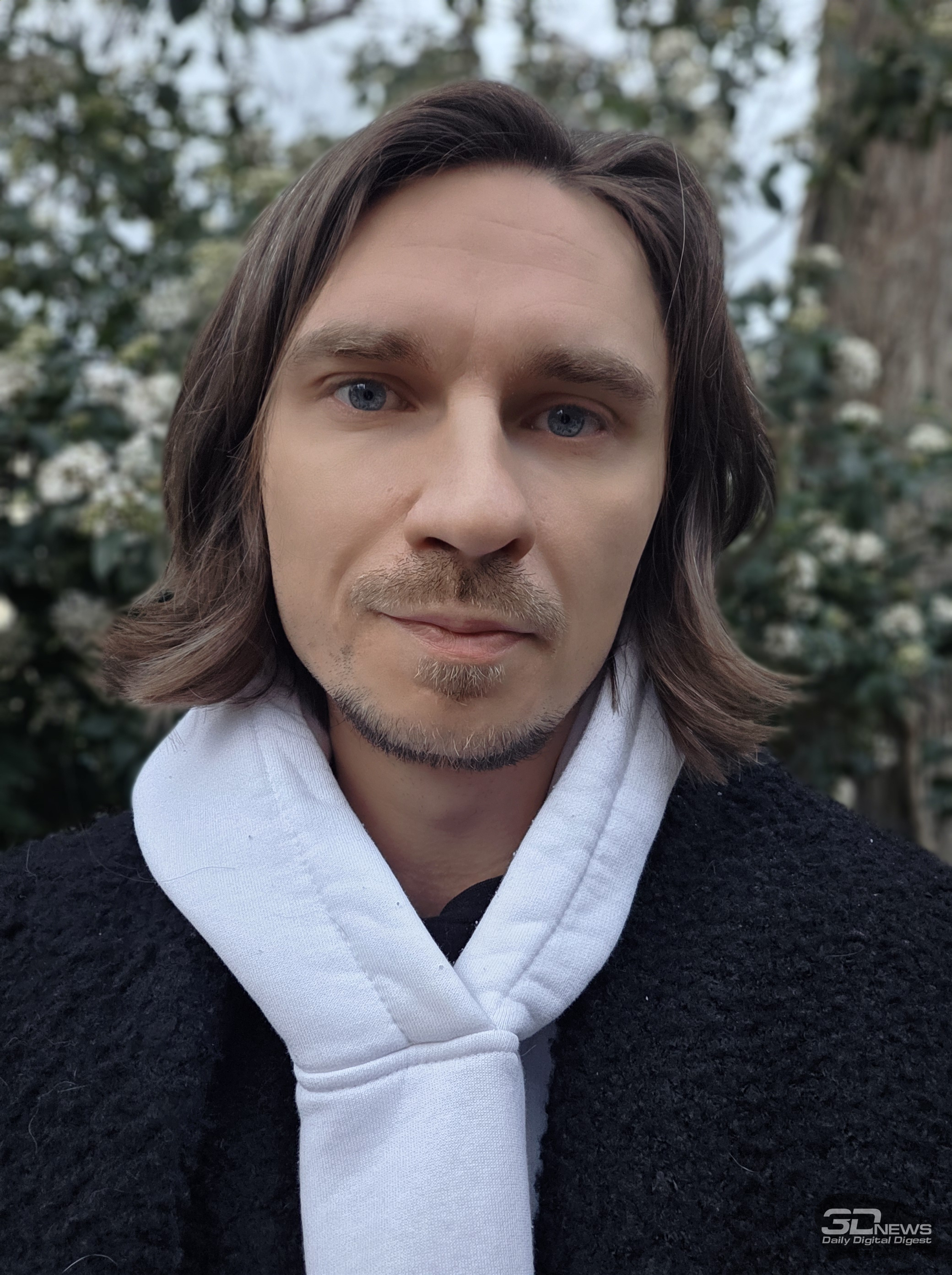Ночной режим (склейки мультиэкспозиции из кадров с разными параметрами съемки с последующей доработкой результата нейросетями) в Samsung Galaxy Z TriFold доступен без выбора специальной опции в списке режимов. По умолчанию он активируется, если смартфон видит недостаток освещения. Но делает он это не всегда корректно, особенно при использовании зума, словно «забывая» о такой опции. Тогда можно вручную выбрать режим «Ночь». Отказываться от такой опции не стоит: повышается общая яркость снимка, насыщенность, детализация, но сохраняется ощущение именно ночной съемки, снимок не пересвечивается, как это порой бывает. «Выдержка», как правило, не превышает двух секунд, смартфон не сможет снять что-то внятное в полной темноте. Но при наличии источников освещения в кадре TriFold справляется хорошо. В портретном режиме доступны три фокусных расстояния (помимо стандартного угла обзора и трехкратного оптического зума доступен и «гибридный» двукратный), размытие осуществляется уверенно, с минимальными артефактами по границам объекта (размазываются выбивающиеся пряди волос и так далее – типичная история для любого смартфона). Эффекты размытия можно добавлять только при постобработке в галерее. Во время съемки доступно несколько вариантов тонирования, возможность поместить модель на однотонный или черно-белый фон (при сохранении цвета на объекте съемки). Есть регулируемая и корректно работающая ретушь. Тон кожи, на мой вкус, холодноват, портреты смотрятся бледненько. При этом отмечу высокую детализацию (без перебора с микрорезкостью) при съемке с широким углом и трехкратным зумом, но вот с двукратным зумом смартфон заметно «мылит». filter