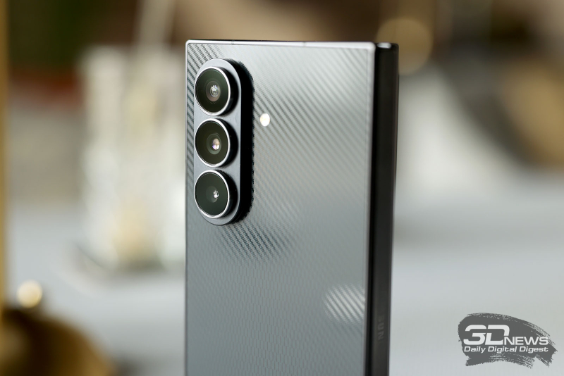 Смотреть все изображения (10) При этом мы не фиксируем и серьезных проблем с нагревом. Да, корпус становится теплым под нагрузкой, но не раскаленным (максимум — 40 °C), троттлинг может достигать 50%, но скорее удержится в пределах 25-35%. Цифры не вызывают восторга, но надо иметь в виду, что платформа очень горячая, и для смартфона с экстремально тонким корпусом удержаться в этих пределах — достижение. В Samsung Galaxy Z TriFold устанавливается 16 Гбайт оперативной памяти стандарта LPDDR5x с возможностью расширения за счет накопителя, а также накопитель стандарта UFS 4.0 емкостью 512 Гбайт или 1 Тбайт. Слот для карты памяти отсутствует. У нас на тестe был Samsung Galaxy TriFold в версии 16+512 Гбайт. ⇡#Связь и беспроводные коммуникацииSamsung Galaxy Z TriFold работает как с 5G, так и с 4G-сетями (и 3G, и 2G, естественно) c поддержкой всех нужных диапазонов. Поддерживаются и технологии VoLTE с VoWi-Fi. Также можно подключить вместо одной из физических симок виртуальную eSIM. Список остальных беспроводных модулей: NFC, Bluetooth 5.4, Wi-Fi 802.11a/b/g/n/ac/6e/7. Навигационный модуль работает с основными системами: GPS (в том числе A-GPS), ГЛОНАСС, BeiDou, Galileo, QZSS. ⇡#КамераКамеры на Galaxy Z TriFold переехали с Galaxy Z Fold7 без изменений — что фронтальные, что тыльные. Тыльный набор состоит из трех модулей, отвечающих, соответственно, за три фокусных расстояния. Главная камера сделана на базе сенсора Samsung ISOCELL HP2: 200 мегапикселей (субпиксели объединены по схеме Tetra2pixel в группы по 16 элементов), габариты – 1/1,3", размер отдельного пикселя – 0,6 мкм. С этим сенсором работает оптика светосилой f/1,7 с гибридным автофокусом (фазовый + контрастный с лазерным «дальномером») и оптической стабилизацией. Эквивалентное фокусное расстояние (ЭФР) — 23 мм. В широкоугольном модуле используется сенсор Sony IMX564 (1/2,55", 1,4 мкм) разрешением 12 мегапикселей, с которым работает объектив светосилой f/2,2 с ЭФР 13 мм; есть фазовый автофокус, но нет стабилизатора. Телефотомодуль получил компактный сенсор Samsung S5K3K1 (1/3,94", 1,0 мкм) разрешением 10 мегапикселей с объективом с ЭФР 69 мм и светосилой f/2,4. Есть и фазовый фокус, и оптический стабилизатор.