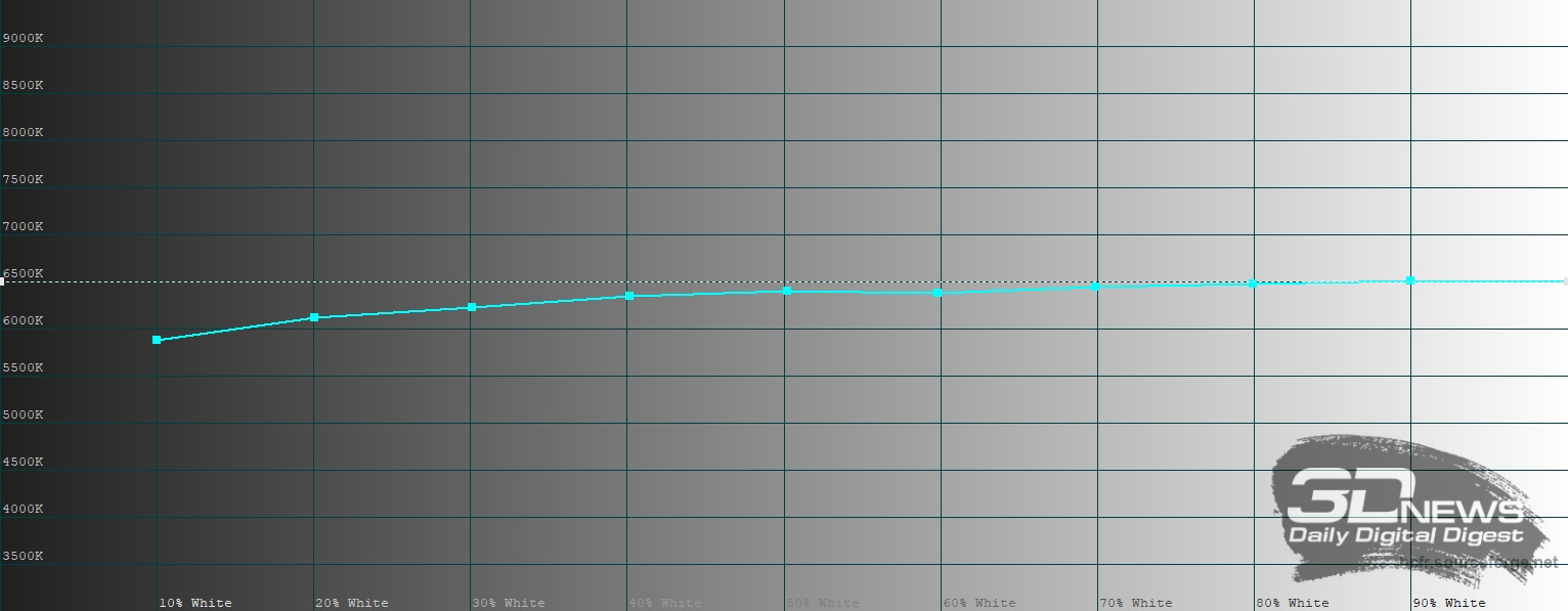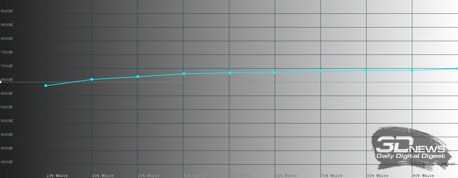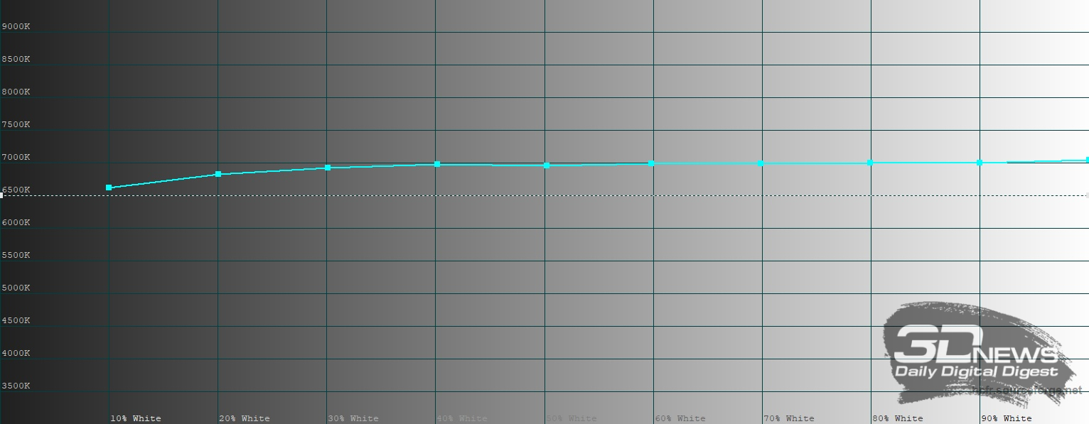 Samsung Galaxy Z TriFold, цветовая температура внутреннего экрана в режиме цветопередачи «Естественные цвета». Голубая линия – показатели Galaxy Z TriFold, пунктирная – эталонная температура