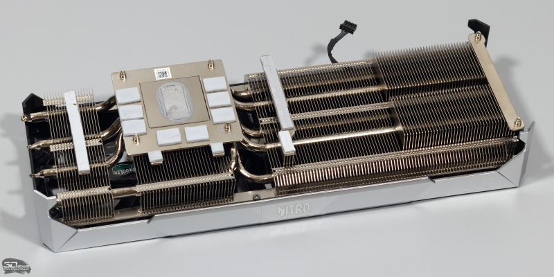 Под теплосъемником GPU сходятся шесть тепловых трубок, на которые нанизаны ламели радиатора. Чипы видеопамяти и силовые каскады VRM накрыты собственными пластинами, напрямую припаянными к оребрению.