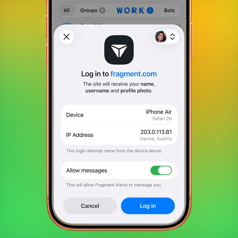 С обновлением появилась возможность авторизации через Telegram в приложении или на сайте. Можно поделиться с сайтом или ботом своим номером телефона, чтобы обойтись без проверки, а также разрешить сервису писать себе в Telegram, чтобы получать от него уведомления прямо в приложении.
