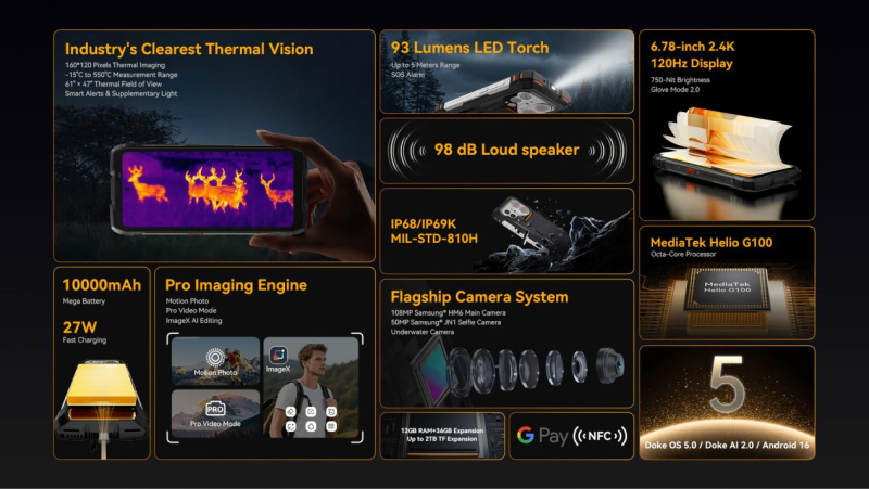 Аккумулятор ёмкостью 10 000 мА·ч обеспечивает до 1080 часов работы в режиме ожидания, а также обладает поддержкой быстрой проводной зарядки мощностью 27 Вт, беспроводной зарядка мощностью 15 Вт и реверсивной зарядки на 10 Вт. Устройство работает под управлением DokeOS 5.0 на базе Android 16 с набором ИИ-приложений Doke AI 2.0, который объединяет модели ИИ-модели DeepSeek-R1, GPT-4o mini и Gemini 2.0, а также с такими ИИ-приложениями, как AI Chat, AI Video, AI Photos и AI Music.