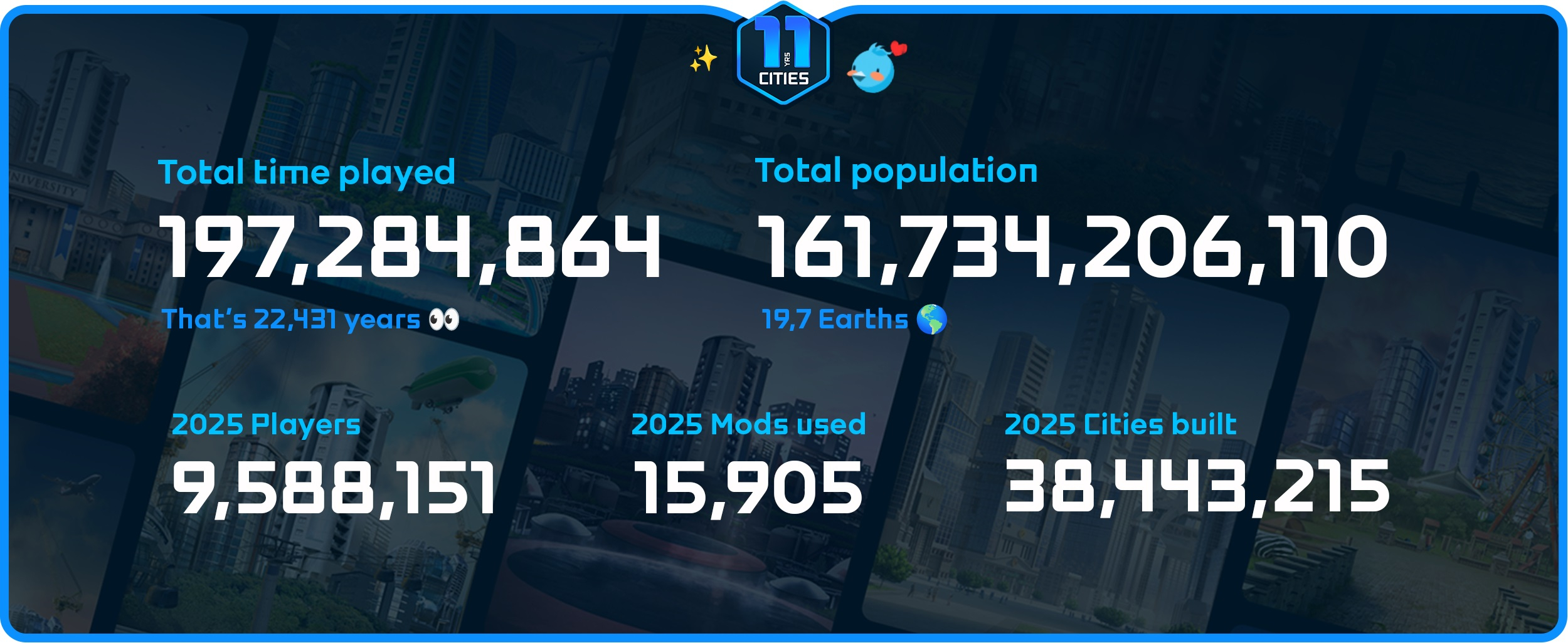 Paradox также раскрыла статистику аудитории Cities: Skylines за 11 лет: 197 284 864 наигранных часов и 161 734 206 110 жителей. Только за 2025 год геймеры построили 38,4 млн городов и использовали 15,9 тыс. модов.