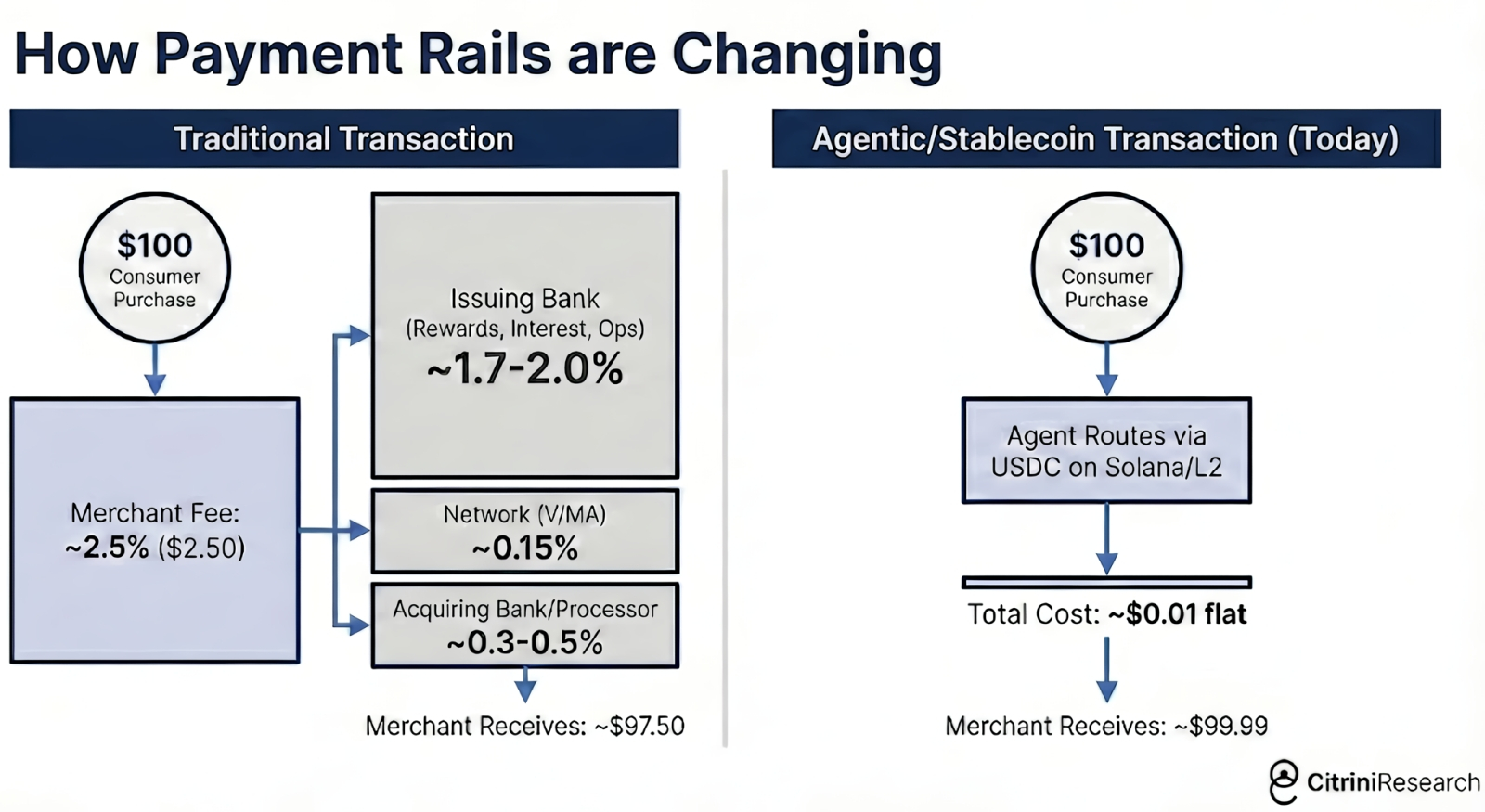 Один из примеров того, насколько глубоко успешное внедрение ИИ-агентов перекраивает движение капиталов в B2C. Слева — актуальная на сегодня схема для онлайн-покупок: примерно 2,5 долл. из потраченной покупателям сотни уходит различным посредникам — и в итоге кормит (за счёт массовости подобных транзакций) сидящих в их офисах «белых воротничков», создающих для них ПО программистов, экспертов по ИБ и т. п. Справа — то, к чему мир может прийти уже через пару лет: продавцу достаётся практически всё, его продуктивность взлетает до небес — зато те, кто прежде припеваючи жил на 2,5 доллара с каждой потраченной частником сотни, обнаруживают себя на улице (источник: Citrini Research)