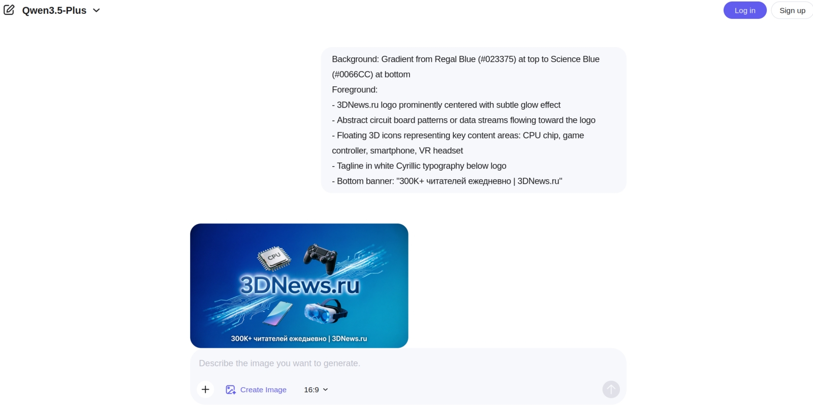 Сперва БЯМ Qwen3.5-Plus попросили описать рекламный баннер для сайта 3DNews.ru (буквально «describe a promotional image for 3dnews.ru web site», без дальнейшей конкретики), затем она выдала несколько вариантов подсказок, и по одной из них Qwen-Image-2.0 сгенерировала картинку. Здесь хорошо видно, что с русскоязычным текстом T2T-модель всё же справляется лучше, чем T2I (обратите внимание на слово «ежедневно»). Отдельного упоминания заслуживает поиск самою же Qwen3.5-Plus дополнительной информации в Сети, — в данном случае это упоминание о количестве читателей, которого в исходной текстовой подсказке не было (источник: скриншот сайта chat.qwen.ai)