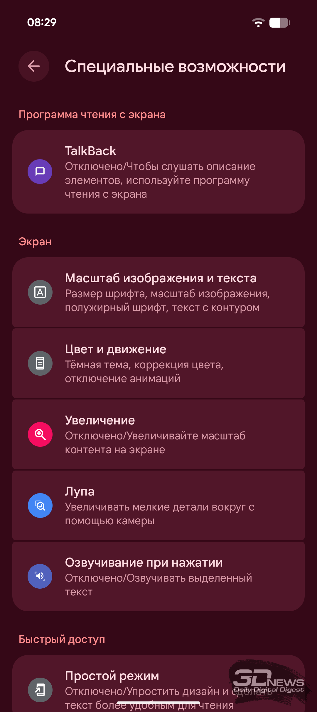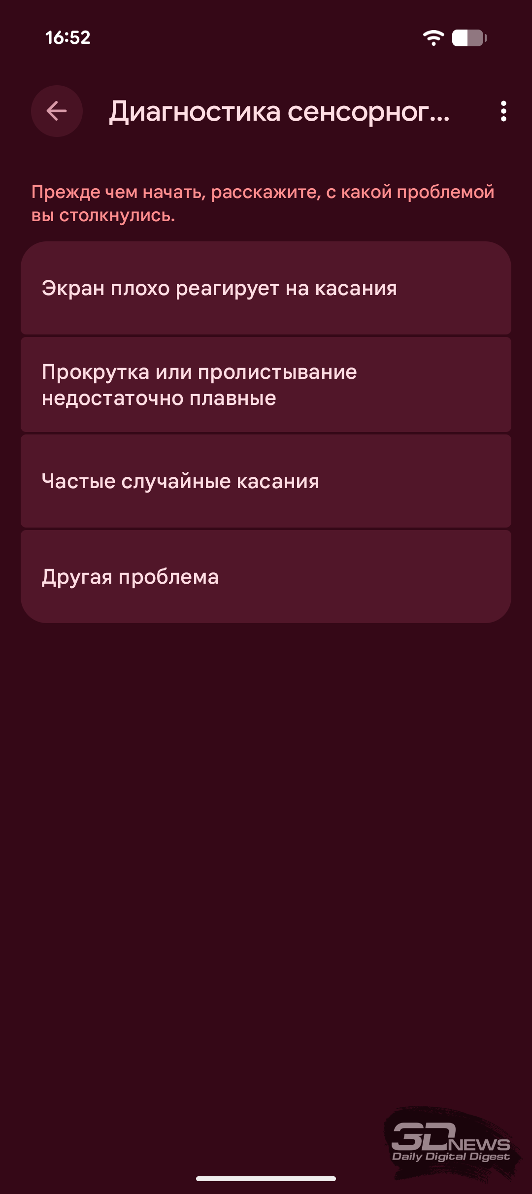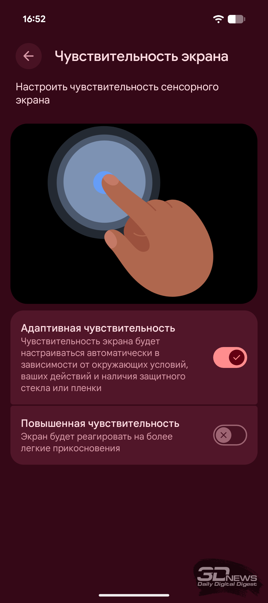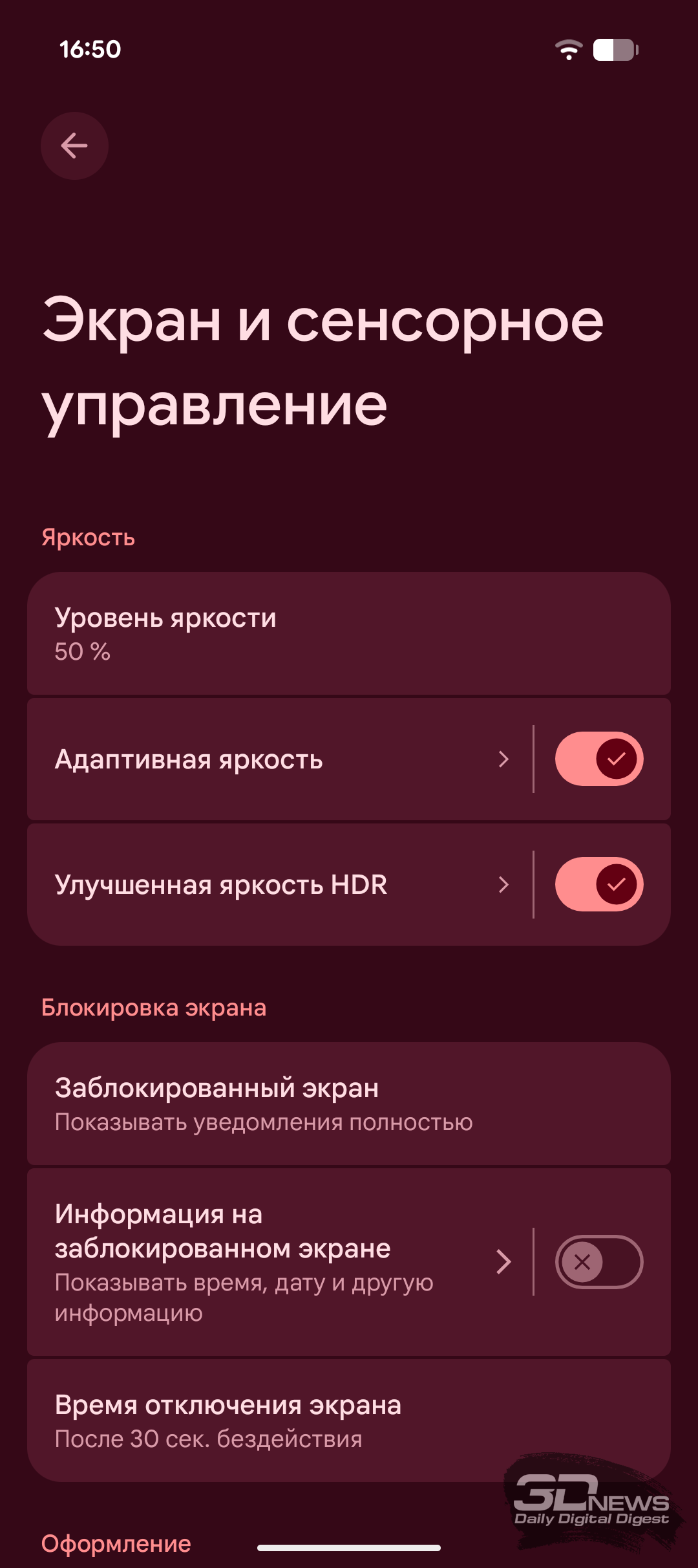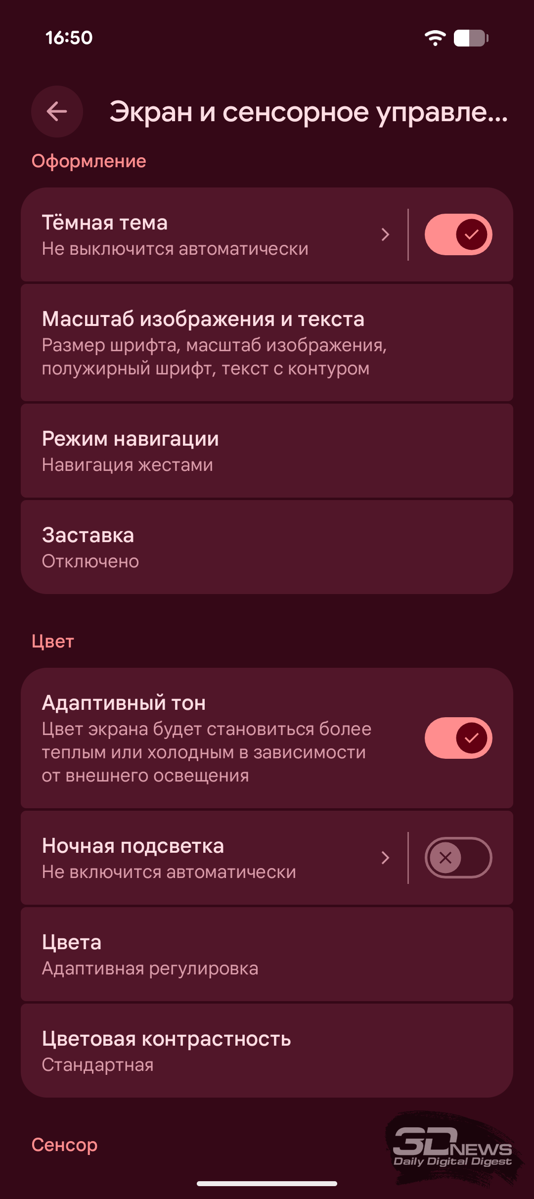 Набор настроек экрана вполне типичен для современного Android-смартфона. Можно настроить уровень яркости, включить адаптивную регулировку и активировать улучшенную яркость HDR. Целый блок настроек посвящён отображению информации на заблокированном экране, и здесь же можно активировать Always-on Display (функция здесь называется «Информация на заблокированном экране»). Как обычно, можно выбрать светлую или тёмную тему, подрегулировать шрифты и масштабирование, выбрать навигацию жестами или кнопками, установить скринсейвер. Ещё есть возможность повысить чувствительность сенсора экрана, чтобы было удобно пользоваться смартфоном в перчатках или с защитным стеклом. Также есть встроенная диагностика сенсорного слоя, позволяющая уточнить проблему перед обращением в сервис.